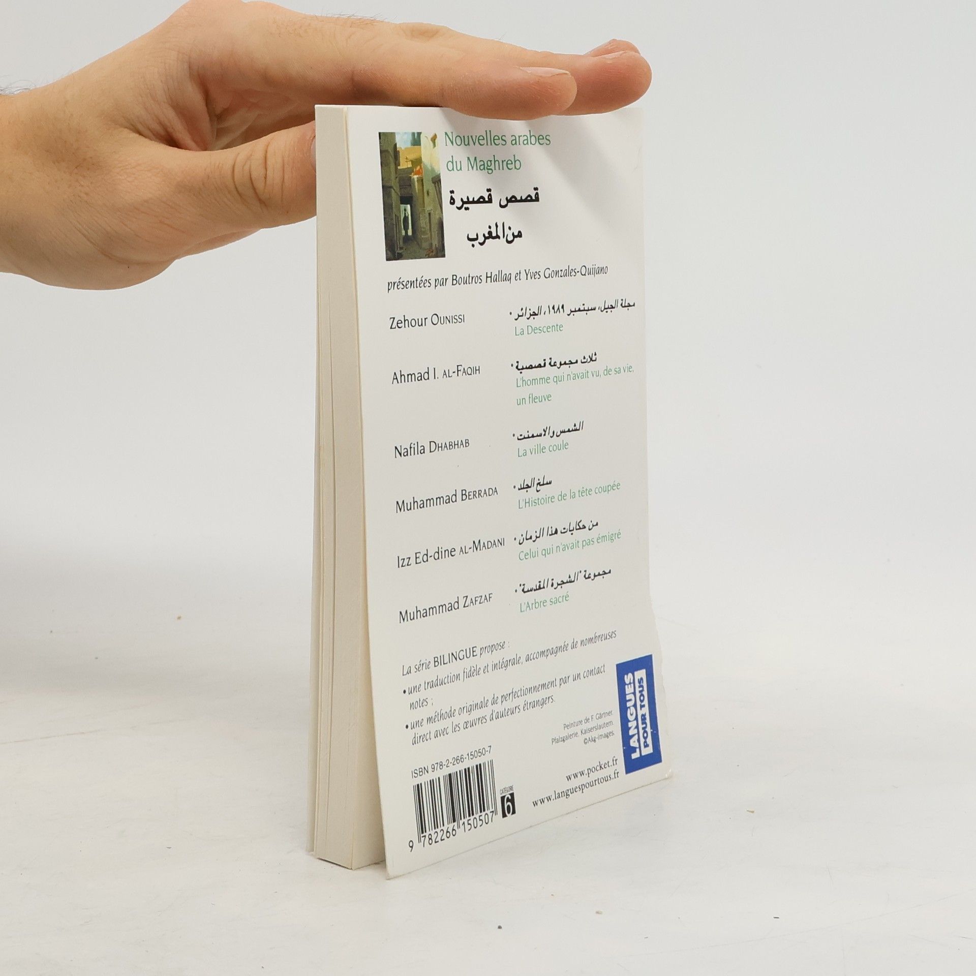 Zehour Ounissi La descenteAhmad I. al-Faqih L'homme qui n'avait vu, de sa vie, un fleuveNafila Dhabhab La ville couleMuhammad Berrada L'histoire de la tête coupéeIzz Ed-dine al-Madani Celui qui n'avait pas émigréMuhammad Zafzaf L'arbre sacréLa série BILINGUE propose :une traduction fidèle et intégrale, accompagnée de nombreuses notes ;une méthode originale de perfectionnement par un contact direct avec les œuvres d'auteurs étrangers.