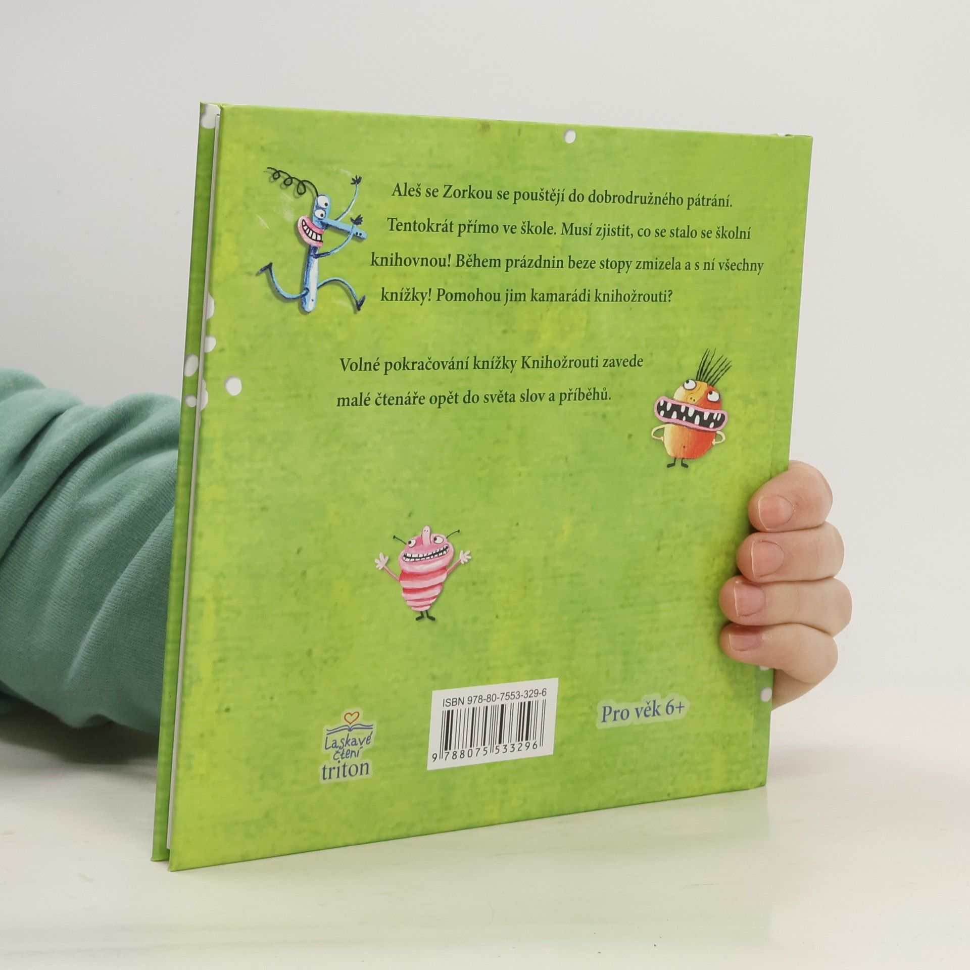 Aleš se Zorkou se pouštějí do dobrodružného pátrání. Tentokrát přímo ve škole. Musí zjistit, co se stalo se školní knihovnou! Během prázdnin beze stopy zmizela a s ní všechny knížky! Pomohou jim kamarádi knihožrouti? Volné pokračování knížky Knihožrouti zavede malé čtenáře opět do světa slov a příběhů.