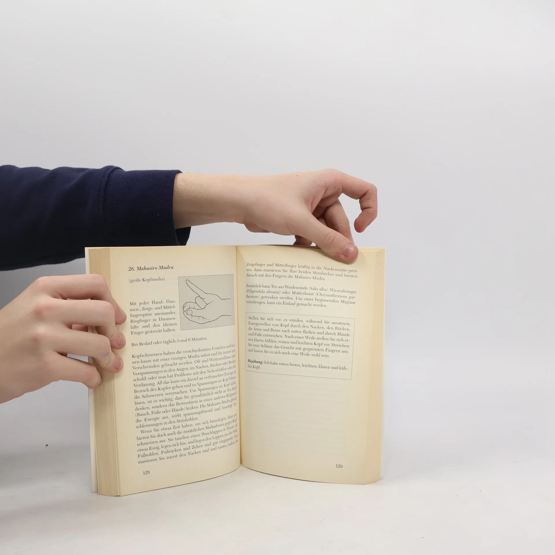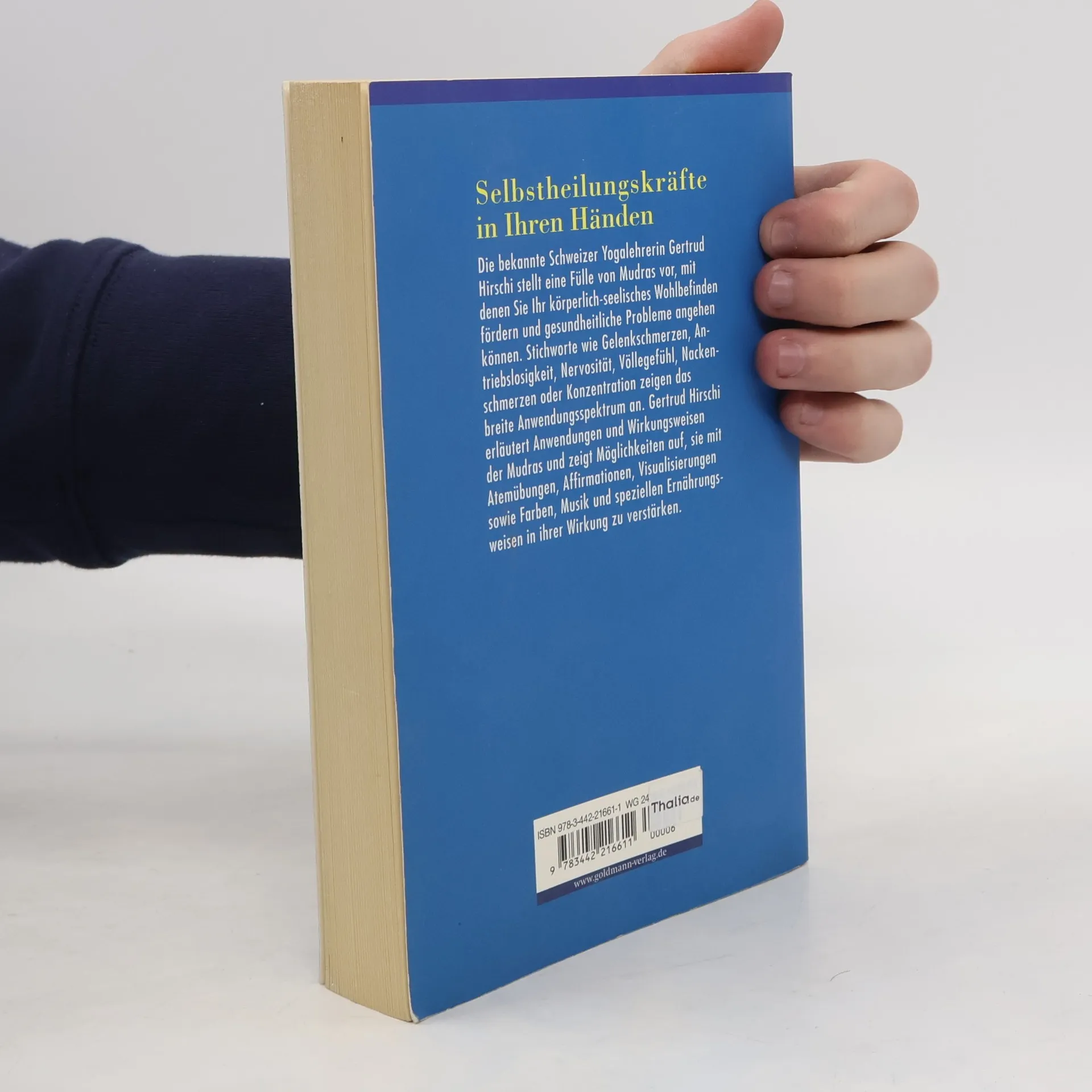 Die Schweizer Yogalehrerin Gertrud Hirschi stellt in diesem Band eine Fülle von Mudras vor, die das eigene körperlich-seelische Wohlbefinden fördern, gesundheitliche Probleme angehen und innere Ruhe und Ausgeglichenheit bringen. Stichworte wie Gelenkschmerzen, Antriebslosigkeit, Nervosität, Völlegefühl, Nackenschmerzen oder Konzentration zeigen das breite Anwendungsspektrum an. Gertrud Hirschi erläutert Anwendungen und Wirkungsweisen der Mudras und zeigt Möglichkeiten auf, sie mit Atemübungen, Affirmationen, Visualisierungen sowie Farben, Musik und speziellen Ernährungsweisen in ihrer Wirkung zu verstärken.