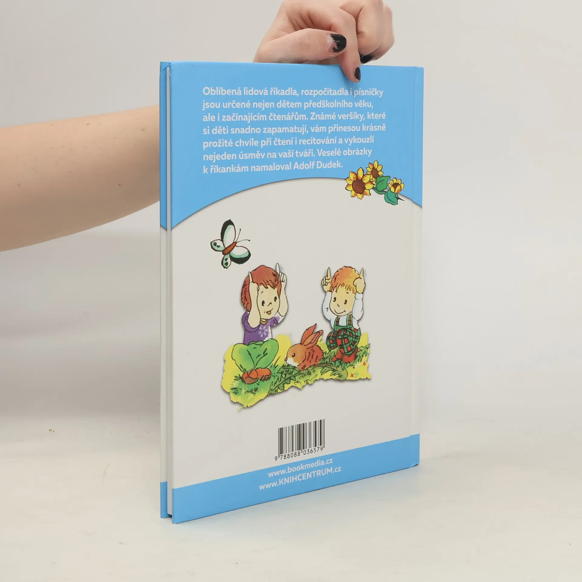 Oblíbená lidová říkadla, rozpočítadla i písničky jsou určené nejen dětem předškolního věku, ale i začínajícím čtenářům. Známé veršíky, které si děti snadno zapamatují, vám přinesou krásně prožité chvíle při čtení i recitování a vykouzlí nejeden úsměv na vaší tváři. Veselé obrázky k říkankám namaloval Adolf Dudek.