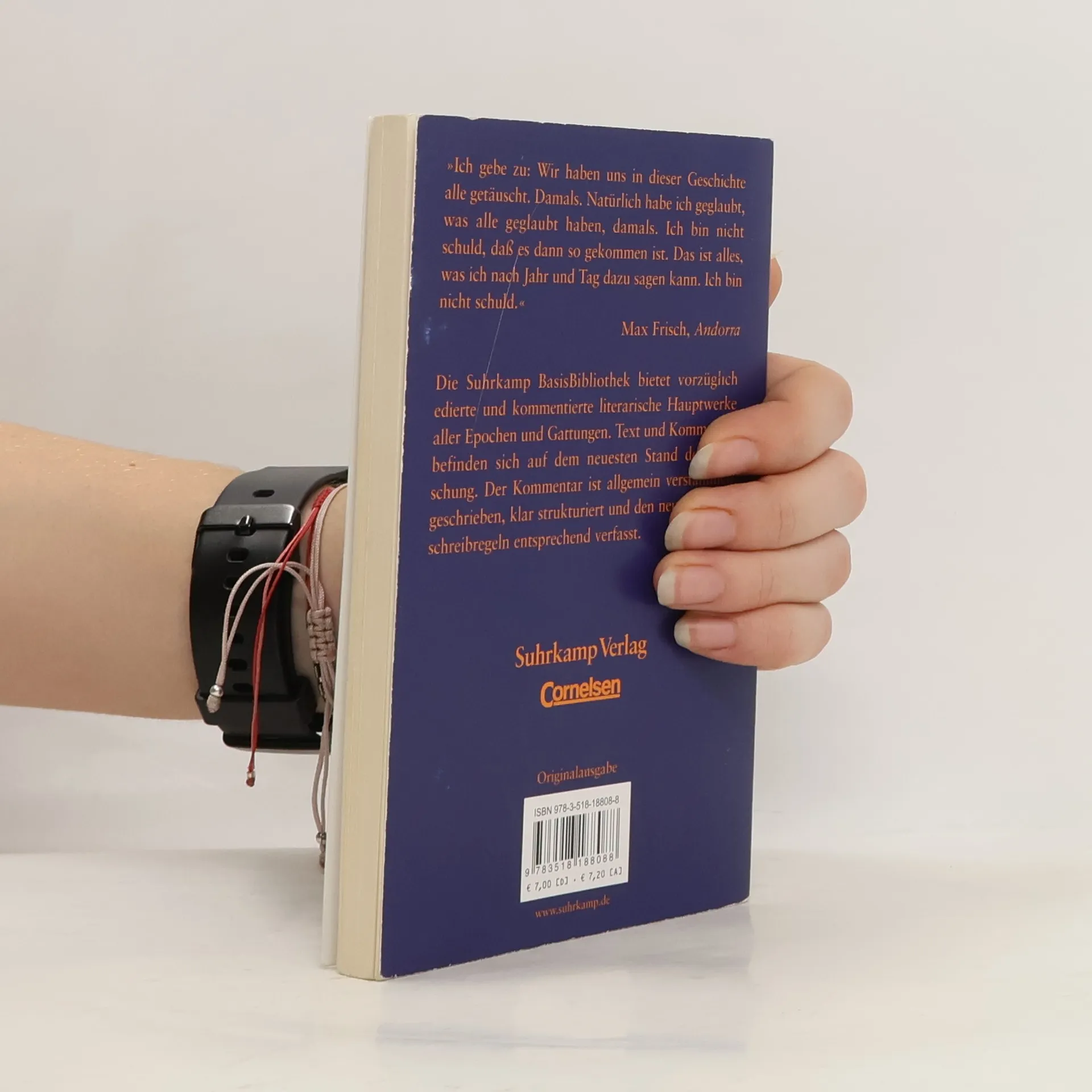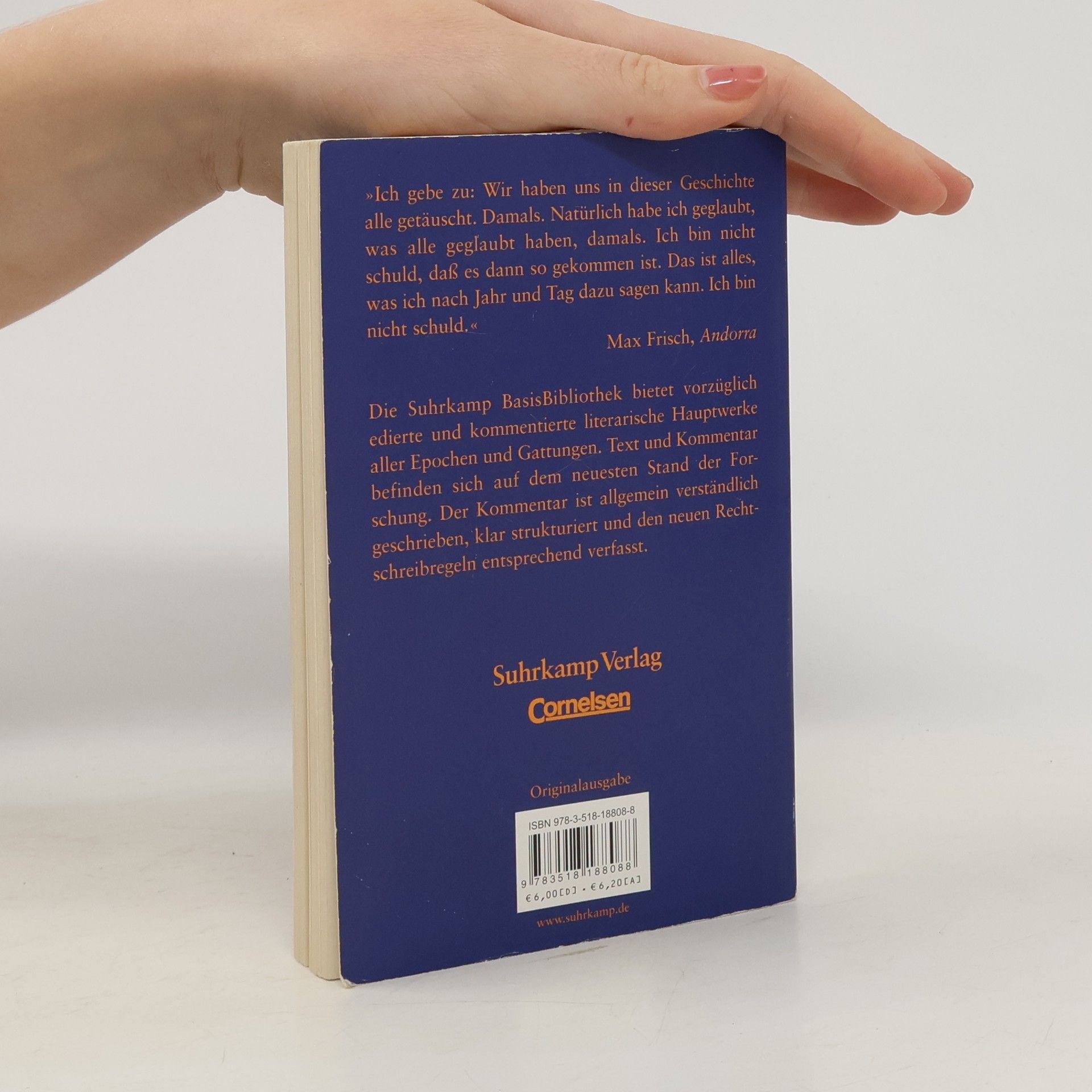 Die Kernzelle von Andorra findet sich in Max Frischs Tagebuch als Eintragung des Jahres 1946. Andorra ist der Name für ein Modell: Es zeigt den Prozess einer Bewusstseinsveränderung, abgehandelt an der Figur des jungen Andri, den die Umwelt so lange zum Anderssein zwingt, bis er es als sein Schicksal annimmt. Dieses Schicksal heißt in Max Frischs Stück »Judsein«. Das Schauspiel erschien als Buchausgabe zuerst 1961. Diese Ausgabe der »Suhrkamp BasisBibliothek – Arbeitstexte für Schule und Studium« bietet nicht nur Max Frischs Stück Andorra, seine »Anmerkungen zu Andorra«, die »Notizen von den Proben« sowie seine Prosaskizze »Der andorranische Jude«, sondern auch einen Kommentar, der alle für das Verständnis des Werks erforderlichen Informationen enthält: eine Zeittafel, die Entstehungs- und Textgeschichte, einen Überblick über die Aufführungs- und Rezeptionsgeschichte, eine Analyse der unterschiedlichen Deutungsansätze, Literaturhinweise sowie Wort- und Sacherläuterungen. Die Schreibweise des Kommentars entspricht den neuen Rechtschreibregeln.