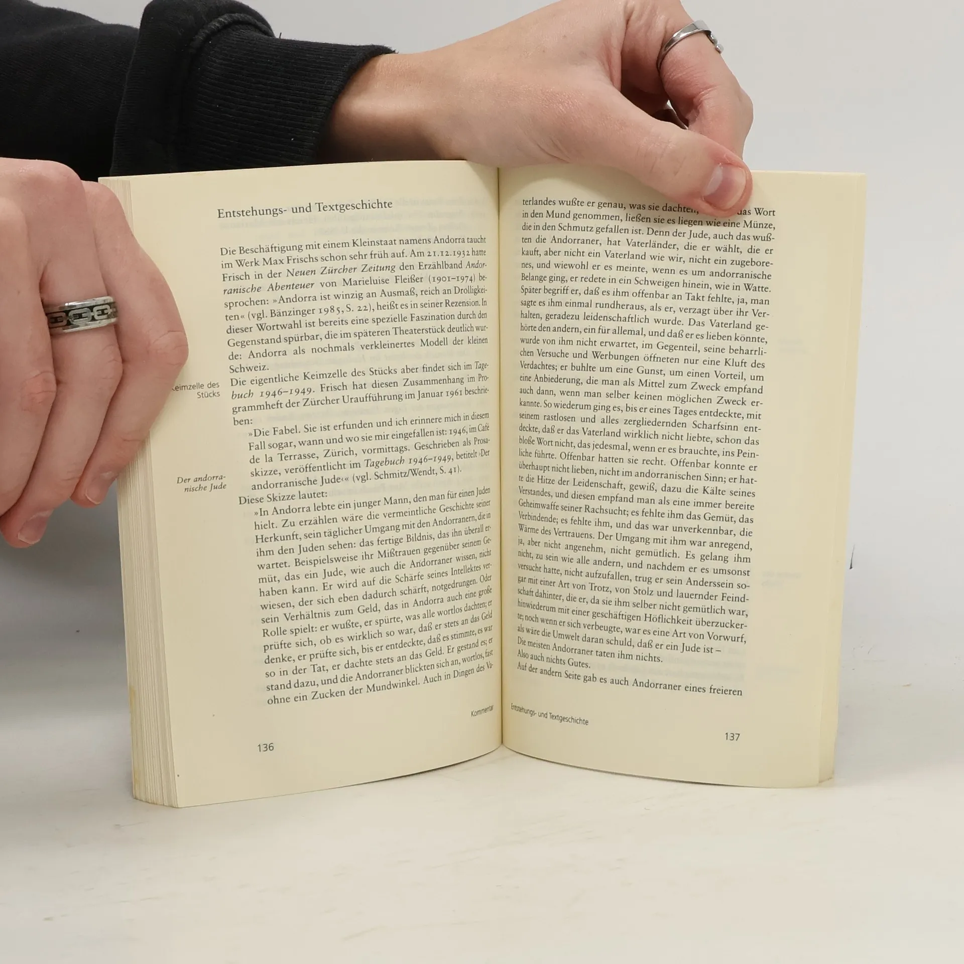 Die Kernzelle von Andorra findet sich in Max Frischs Tagebuch als Eintragung des Jahres 1946. Andorra ist der Name für ein Modell: Es zeigt den Prozess einer Bewusstseinsveränderung, abgehandelt an der Figur des jungen Andri, den die Umwelt so lange zum Anderssein zwingt, bis er es als sein Schicksal annimmt. Dieses Schicksal heißt in Max Frischs Stück »Judsein«. Das Schauspiel erschien als Buchausgabe zuerst 1961. Diese Ausgabe der »Suhrkamp BasisBibliothek – Arbeitstexte für Schule und Studium« bietet nicht nur Max Frischs Stück Andorra, seine »Anmerkungen zu Andorra«, die »Notizen von den Proben« sowie seine Prosaskizze »Der andorranische Jude«, sondern auch einen Kommentar, der alle für das Verständnis des Werks erforderlichen Informationen enthält: eine Zeittafel, die Entstehungs- und Textgeschichte, einen Überblick über die Aufführungs- und Rezeptionsgeschichte, eine Analyse der unterschiedlichen Deutungsansätze, Literaturhinweise sowie Wort- und Sacherläuterungen. Die Schreibweise des Kommentars entspricht den neuen Rechtschreibregeln.