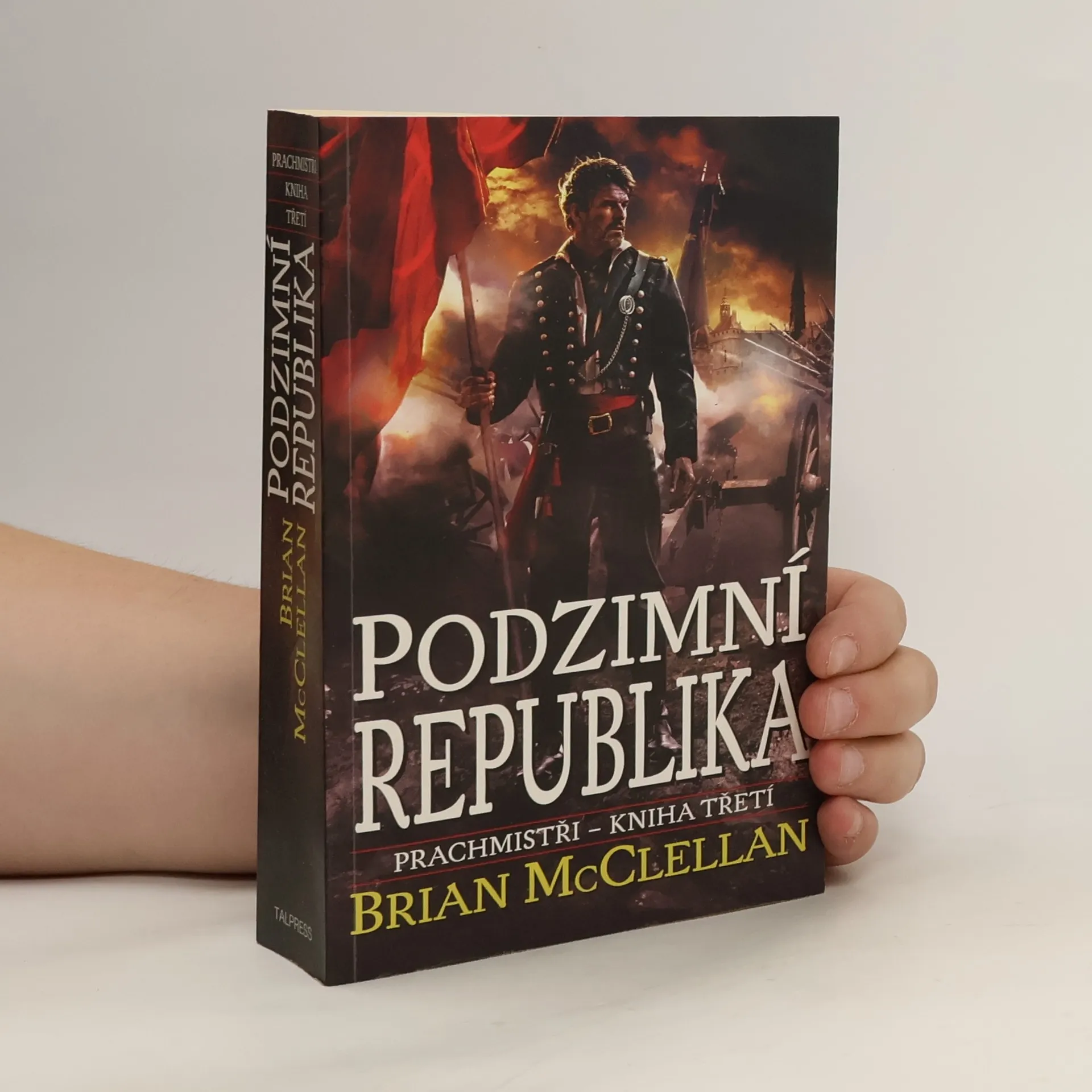 V nejtemnějším okamžiku války se polní maršál Tamás vrací do milované vlasti, jejíž hlavní město Adro padlo poprvé v dějinách do rukou vetřelců. Jeho syn se ztratil, spojenci jsou k nerozeznání od nepřátel a posily mají dorazit až za několik týdnů. Přestože proti Adranům táhnou Kezové s nestvůrami stvořenými jejich strašnými kouzly, obracejí se Adrané sami proti sobě. Vzpoura vtáhne i inspektora Adamata příslibem, že by mohl najít svého ztraceného syna. A naděje všech se upínají k Tanielovi Dvě kule. Pronásledovaný lidmi, jež kdysi považoval za přátele - musí ohlídat to, že země hroznou válku přežije... Podzimní republika je vynikající závěr jedné z nejlepších fantasy sérií posledních let. Ve světě Briana McClellana se proplétá magie a technika, ale mohou se mocní prachmistři, ovládající střelný prach a kulky, postavit mágům a bohům?