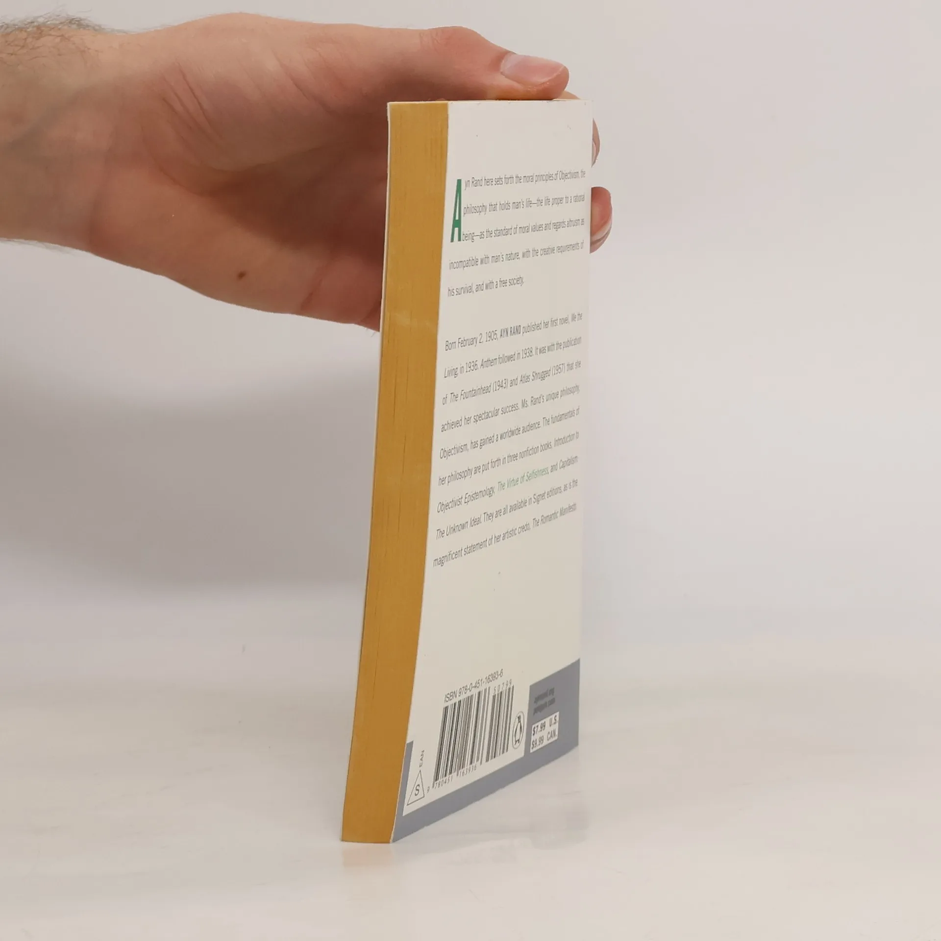 A collection of essays that sets forth the moral principles of Objectivism, Ayn Rand's controversial, groundbreaking philosophy. Since their initial publication, Rand's fictional works—Anthem, The Fountainhead, and Atlas Shrugged—have had a major impact on the intellectual scene. The underlying theme of her famous novels is her philosophy, a new morality—the ethics of rational self-interest—that offers a robust challenge to altruist-collectivist thought. Known as Objectivism, her divisive philosophy holds human life—the life proper to a rational being—as the standard of moral values and regards altruism as incompatible with man's nature. In this series of essays, Rand asks why man needs morality in the first place, and arrives at an answer that redefines a new code of ethics based on the virtue of selfishness. More Than 1 Million Copies Sold!