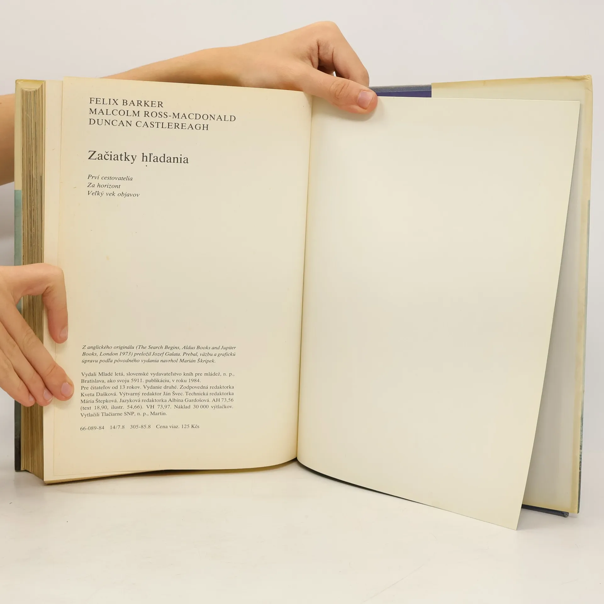 Dejiny zemepisných prieskumov a objavov. Kapitoly: Prvá časť-Prví cestovatelia-1. Do neznáma, 2. Cesty Egypťanov, 3. Priekopníci z Fenície, 4. Z Kartága na západ, 5. Grécki dobrodruhovia, 6. Alexander Veľký, 7. Nové horizonty, 8. Hannibal prekročil Alpy, 9. Objavy Rimanov, 10. Hodvábna cesta doČíny, 11. Koniec začiatku. Druhá časť-Za horizont-1.Veľký Atlantický oceán, 2. Nájazdy Vikingov, 3. Island a Grónsko, 4. Vikingovia v Severnej Amerike, 5. Džingischán a Mongoli, 6. Poslovia u veľkého chána, 7. Cesty Viliama Rubroeka, 8.Obchodné cesty, 9. Benátčania sa vracajú, 10. Marco Polo v Číne, 11. Cesty vedú do Číny. Tretia časť-Veľký vek objavov-1. Historická výzva, 2. Odpoveď, 3. More temnôt, 4. S nádejou na juh, 5. S Kolumbom na západ, 6. S Vascom da Gama na východ, 7. Ďalej na východ i na západ, 8. Okolo sveta.