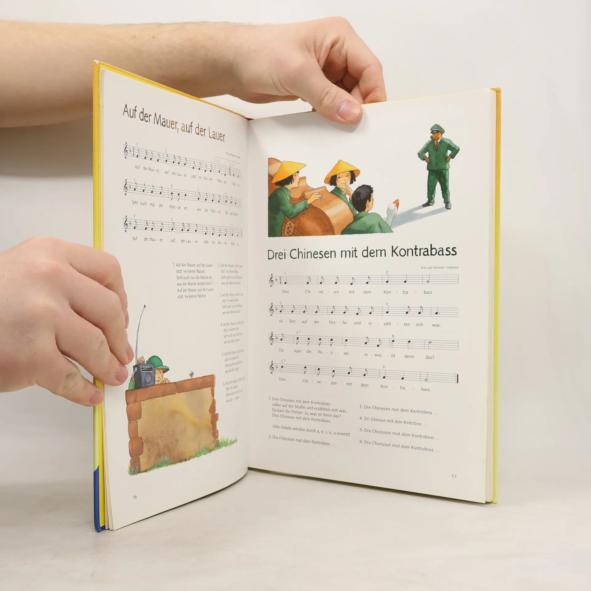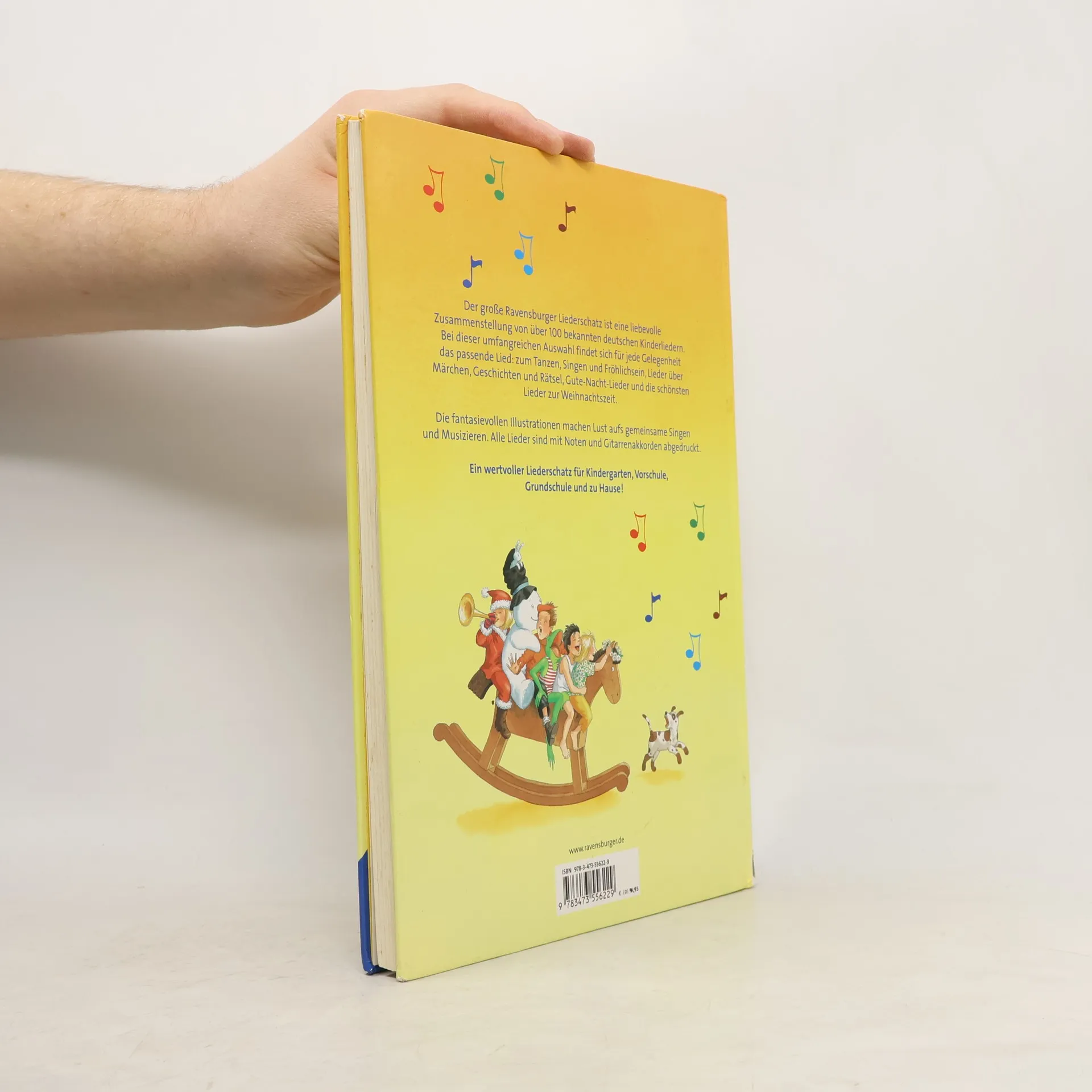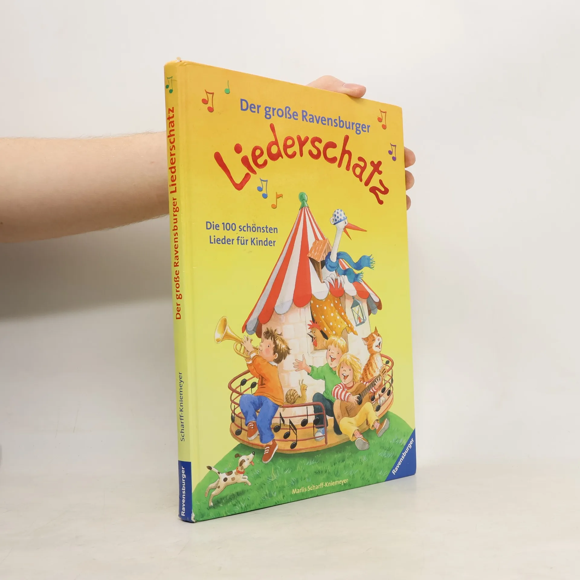 Der große Ravensburger Liederschatz bietet über 100 beliebte deutsche Kinderlieder mit Noten und Gitarrenakkorden. Fantasievoll illustriert von Marlies Scharff-Kniemeyer, lädt das Buch zum Singen und Musizieren ein, ideal für Kindergarten, Schule und Zuhause. Enthalten sind Lieder zu Märchen, Geschichten, Gute-Nacht und Weihnachten.
