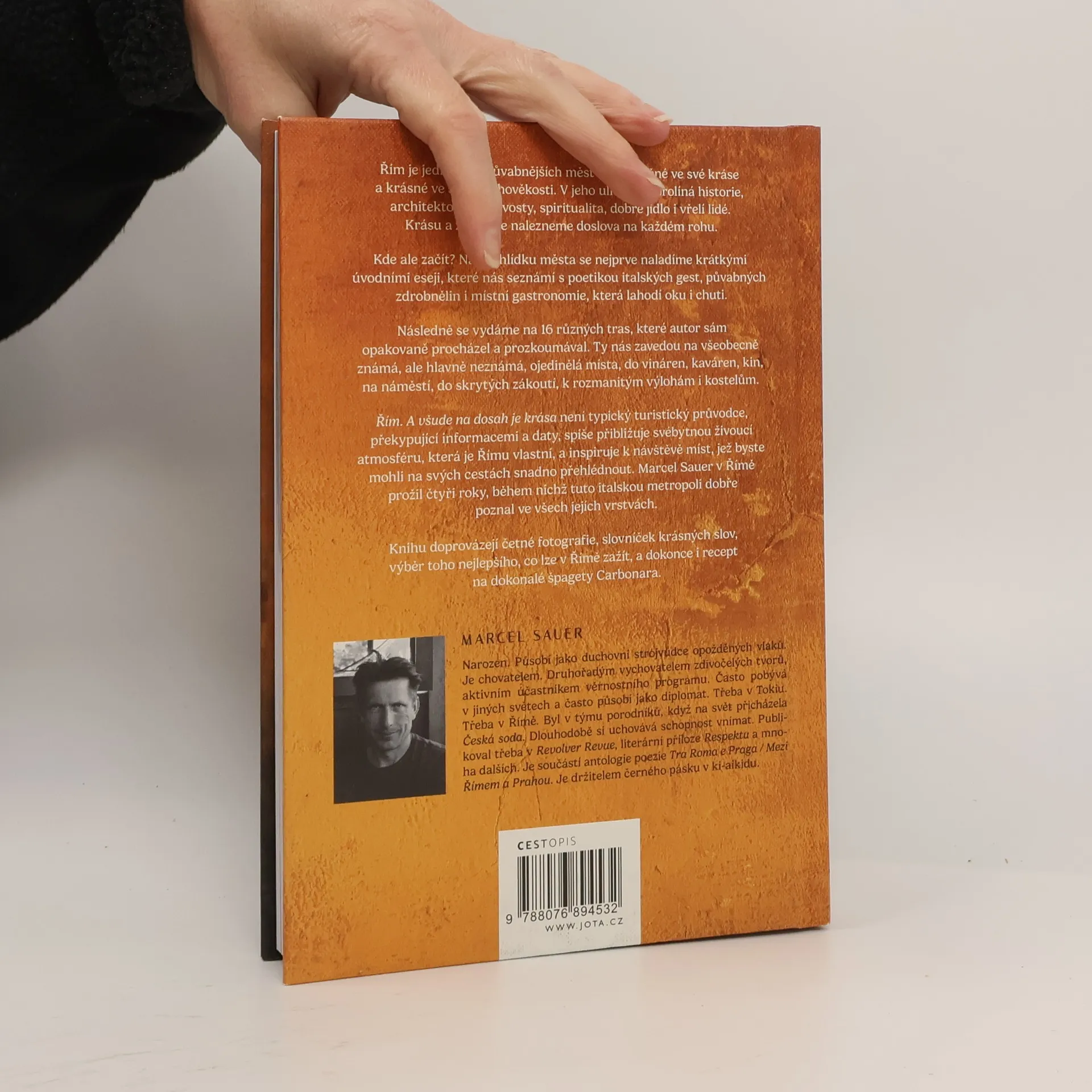 Řím je jedno z nejpůvabnějších měst světa. Věčné ve své kráse a krásné ve své dlouhověkosti. V jeho ulicích se prolíná historie, architektonické skvosty, spiritualita, dobré jídlo i vřelí lidé. Krásu a život zde naleznete doslova na každém rohu. Kde ale začít? Na prohlídku města se nejprve naladíme krátkými úvodními eseji, které nás seznámí s poetikou italských gest, půvabných zdrobnělin i místní gastronomie, která lahodí oku i chuti. Následně se vydáme na 16 různých tras, které autor sám opakovaně procházel a prozkoumával. Ty nás zavedou na všeobecně známá, ale hlavně neznámá, ojedinělá místa, do vináren, kaváren, kin, do skrytých zákoutí, na náměstí, k rozmanitým výlohám i kostelům. Řím. A všude na dosah je krása není typický turistický průvodce, překypující informacemi a daty, ale spíše přiblížením svébytné živoucí atmosféry, která je věčnému městu vlastní, a inspirací k návštěvě míst, které byste mohli na svých cestách snadno přehlédnout. Marcel Sauer v Římě prožil čtyři roky, během nichž tuto italskou metropoli dobře poznal ve všech jejích vrstvách. Knihu doprovázejí četné fotografie, slovníček krásných slov, výběr toho nejlepšího, co lze v Římě zažít, a dokonce i recept na dokonalé špagety.