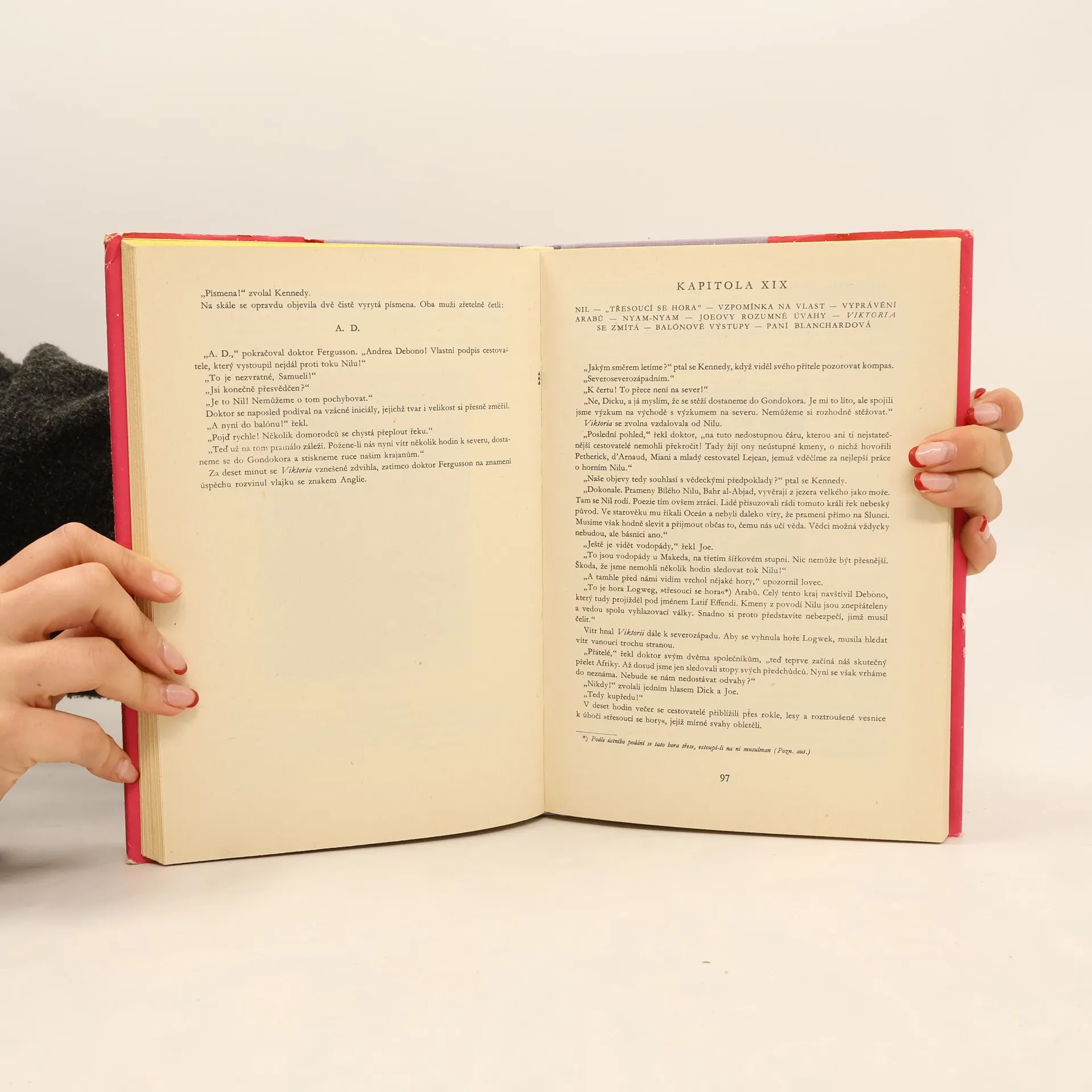 Román vypráví o dobrodružné výpravě doktora Fergussona, který se svým přítelem Richardem Kennedym a sluhou Joem Wilsonem podnikli výzkumnou cestu řiditelným balónem Viktoria (balón byl vybaven zařízením umožňujícím libovolný vzestup a sestup, a tak mohl vzduchoplavec využívat větrů vanoucích v různých výškách rozdílným směrem) nad pevninou tehdy ještě neprobádané Afriky. Po startu ze Zanzibaru prožili mnohá dobrodružství s africkým obyvatelstvem, bojovali se zvířaty i s přírodními živly, prozkoumali prameny Nilu a překonávali různé obtíže a nebezpečí. - Klub mladých čtenářů, část nákladu brožovaná.