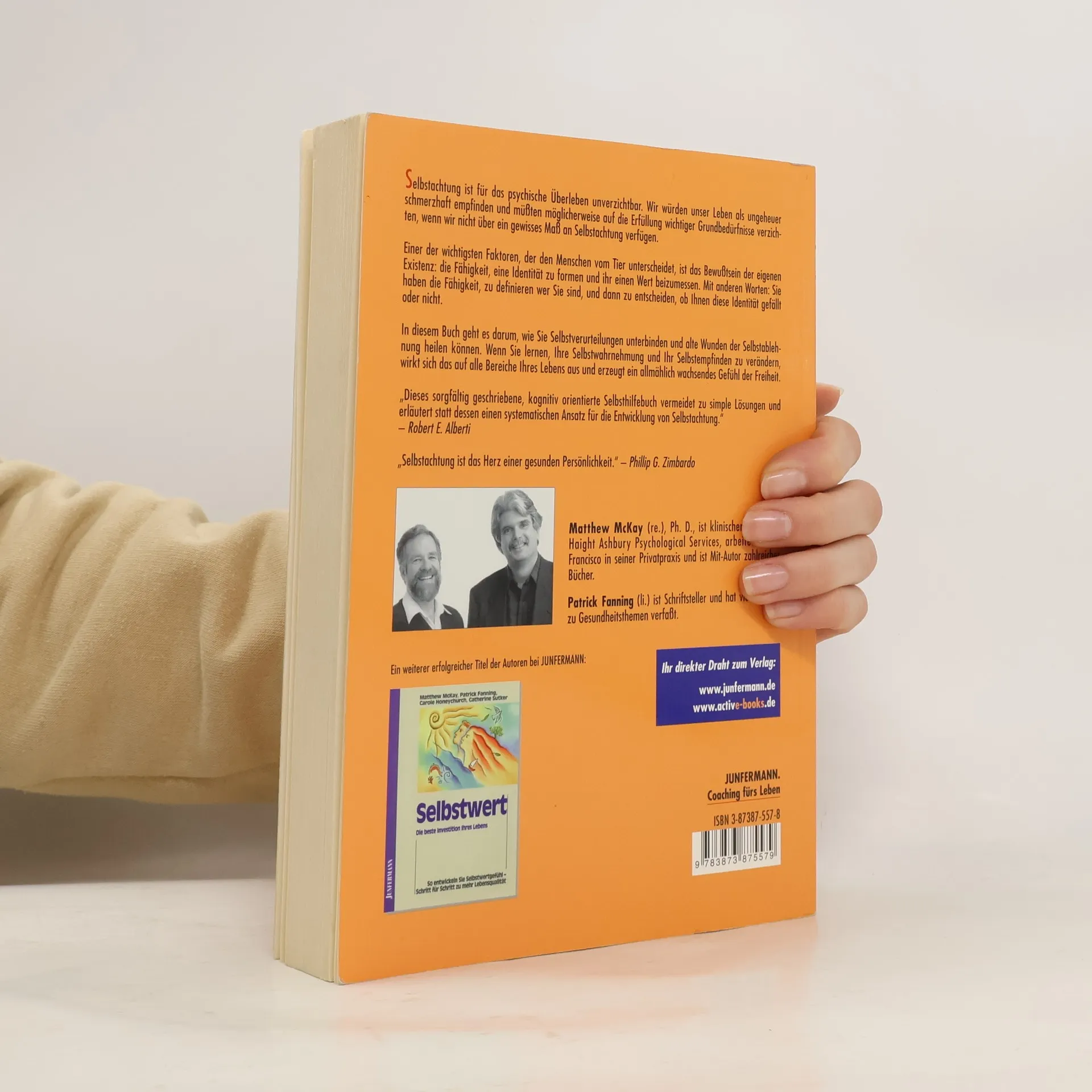 Übersetzt von Theo Kierdorf Selbstachtung ist für das psychische Überleben unverzichtbar. Wir würden unser Leben als ungeheuer schmerzhaft empfinden und müßten möglicherweise auf die Erfüllung wichtiger Grundbedürfnisse verzichten, wenn wir nicht über ein gewisses Maß an Selbstachtung verfügen. Einer der wichtigsten Faktoren, der den Menschen vom Tier unterscheidet, ist das Bewußtsein der eigenen Existenz: die Fähigkeit, eine Identität zu formen und ihr einen Wert beizumessen. Mit anderen Worten: Sie haben die Fähigkeit, zu definieren wer Sie sind, und dann zu entscheiden, ob Ihnen diese Identität gefällt oder nicht. „In diesem Buch geht es darum, wie Sie Selbstverurteilungen unterbinden und alte Wunden der Selbstablehnung heilen können. Wenn Sie lernen, Ihre Selbstwahrnehmung und Ihr Selbstempfinden zu verändern, wirkt sich das auf alle Bereiche Ihres Lebens aus und erzeugt ein allmählich wachsendes Gefühl der Freiheit.“