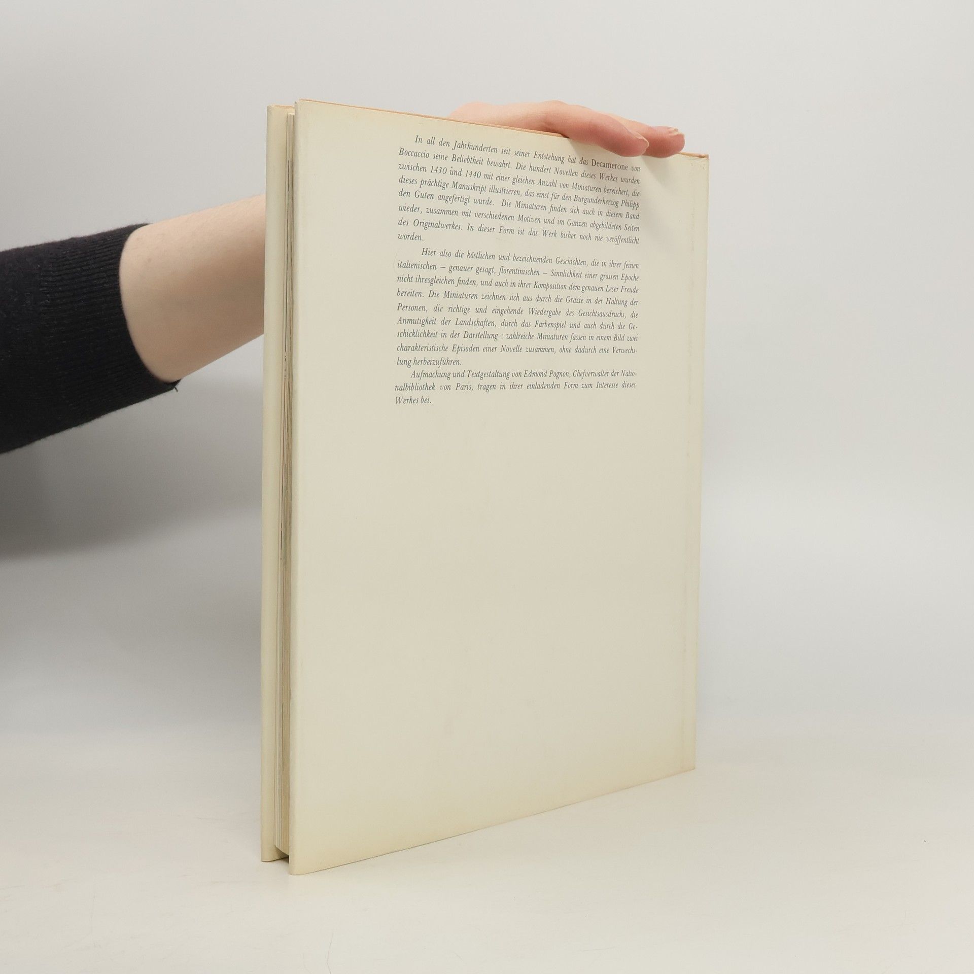 Das Dekameron, ein Novellenzyklus, den sich zehn Gäste eines bei Florenz gelegenen Landgutes während der Pestzeit erzählen, machte den Dichter weltberühmt. Andre Jolles schreibt in seiner Einleitung: »Wenige Bücher stehen in einem so schlechten Ruf - wenige sind so viel gelesen wie das Dekameron.«