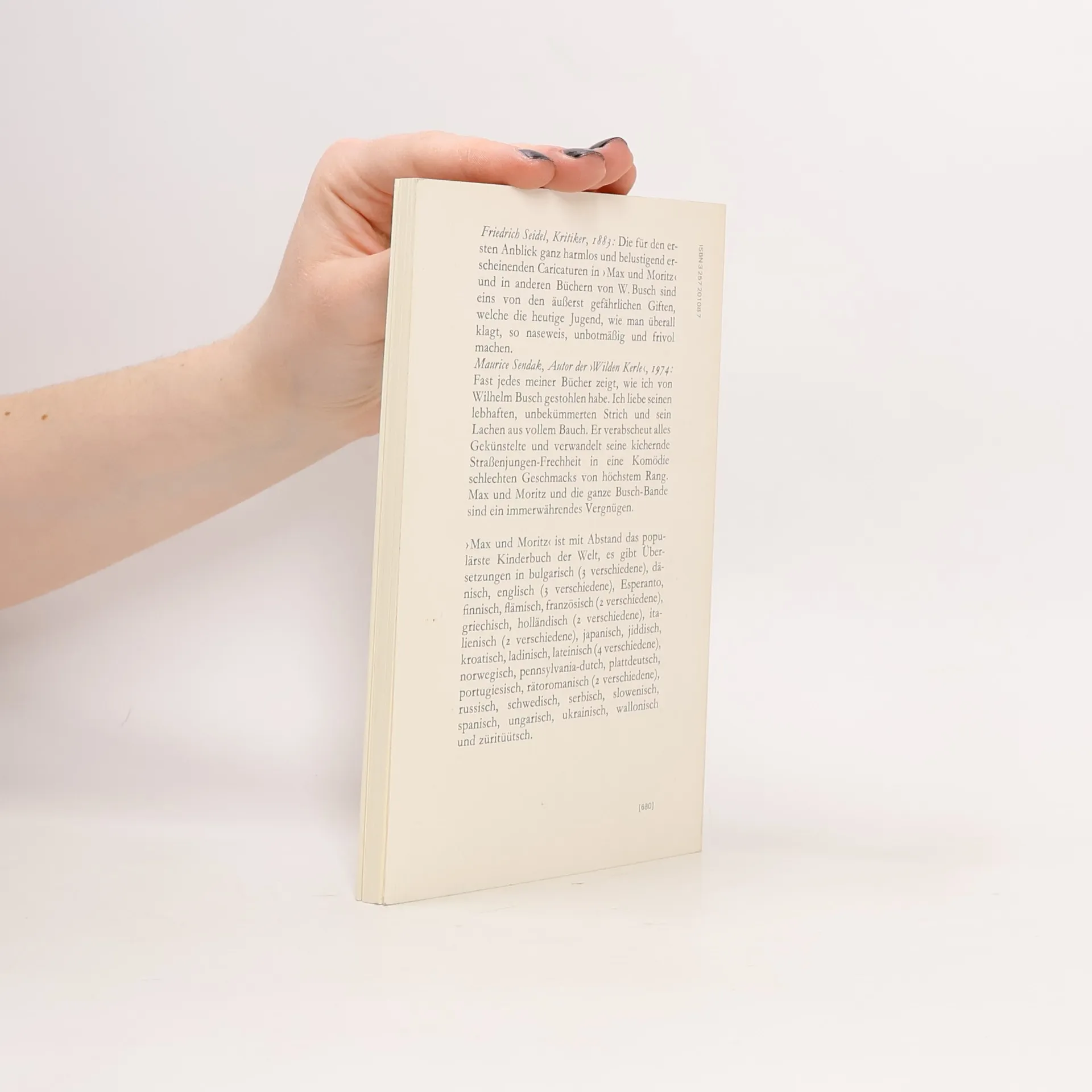 „Vierzig Übersetzungen in 28 verschiedene Sprachen und Dialekte, viele Nachahmungen, Parodien, Vertonungen und Bearbeitungen des Max-und-Moritz-Stoffes stempeln die sieben Streiche zu dem mit Abstand populärsten Kinderbuch der Welt, und es gibt einige moderne Kinderbuchautoren, unter ihnen Tomi Ungerer und Maurice Sendak, die freudig bekennen, daß sie von Busch viel gelernt haben.“