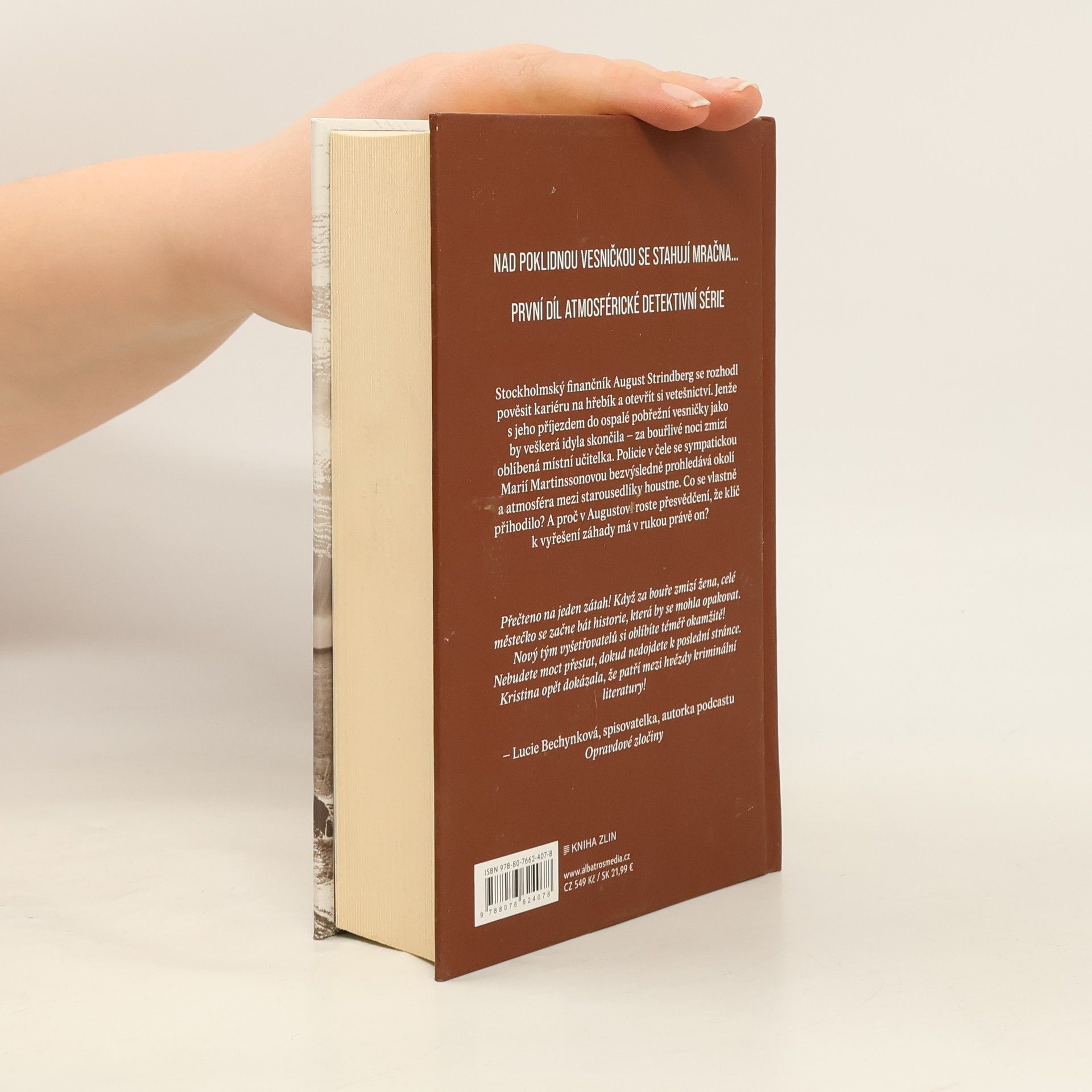 Nad poklidnou vesničkou se stahují mračna. První díl atmosférické detektivní série. Stockholmský finančník August Strindberg se rozhodl pověsit kariéru na hřebík a otevřít si vetešnictví. Jenže s jeho příjezdem do ospalé pobřežní vesničky jako by tu veškerá idyla skončila – za bouřlivé noci zmizí oblíbená místní učitelka. Policie v čele se sympatickou Marií Martinssonovou bezvýsledně prohledává okolí a atmosféra mezi starousedlíky houstne. Co se vlastně přihodilo? A proč v Augustovi roste přesvědčení, že klíč k vyřešení záhady má v rukou právě on?
