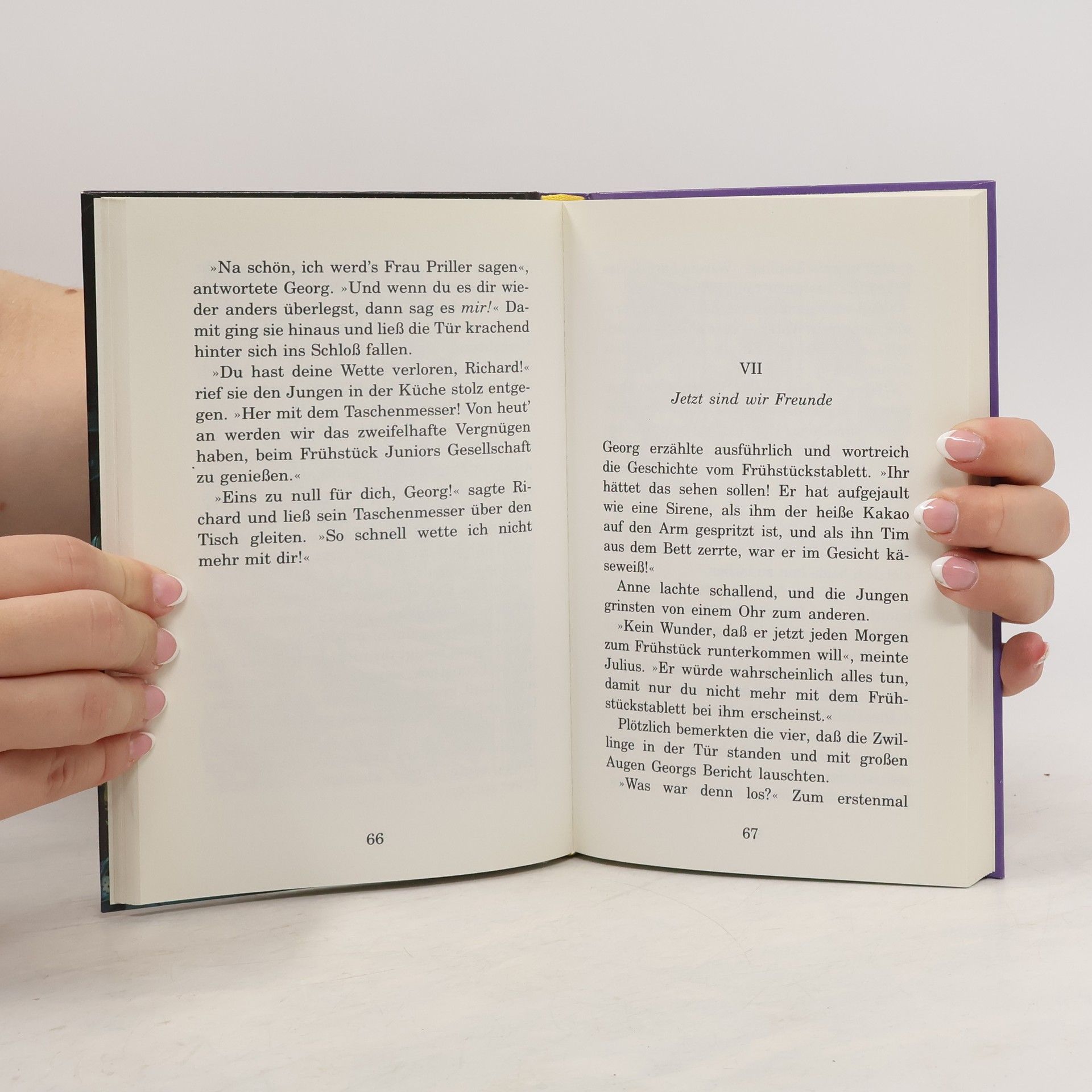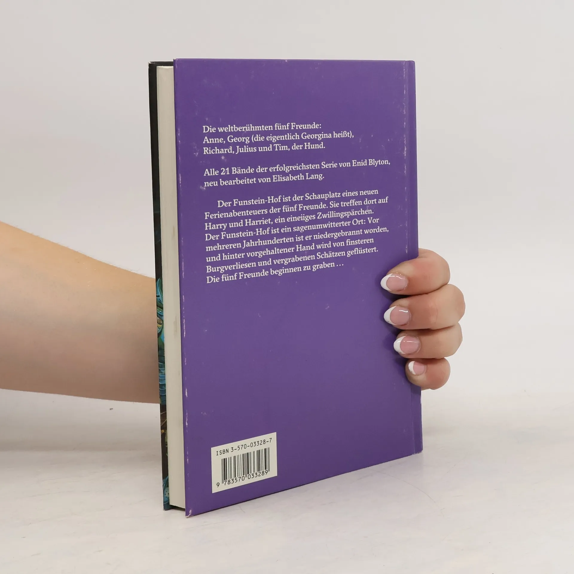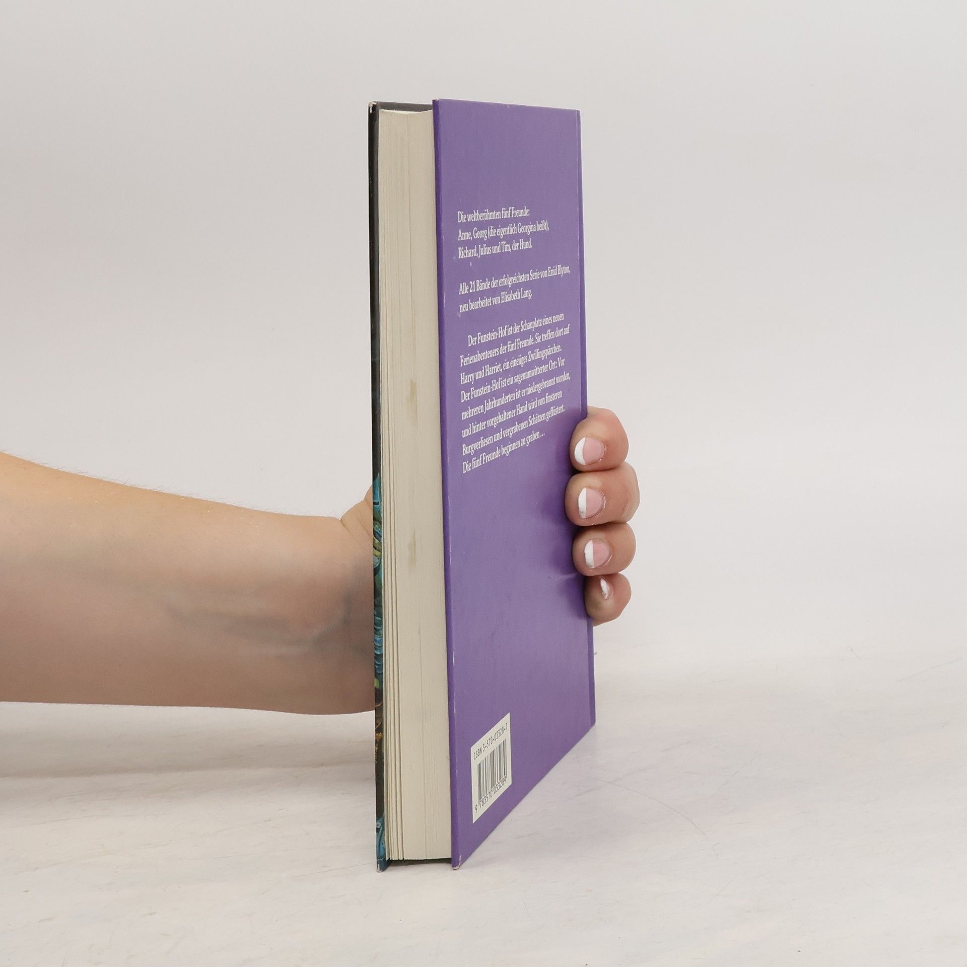 Die weltberühmten fünf Freunde: Anne, Georg (die eigentlich Georgina heißt), Richard, Julius und Tim, der Hund. Alle 21 Bände der erfolgreichsten Serie von Enid Blyton, neu bearbeitet von Elisabeth Lang. Der Funstein-Hof ist der Schauplatz eines neuen Ferienabenteuers der fünf Freunde. Sie treffen dort auf Harry und Harriet, ein eineiiges Zwillingspärchen. Der Funstein-Hof ist ein sagenumwitterter Ort: Vor mehreren Jahrhunderten ist er niedergebrannt worden, und hinter vorgehaltener Hand wird von finsteren Burgverliesen und vergrabenen Schätzen geflüstert. Die fünf Freunde beginnen zu graben...
