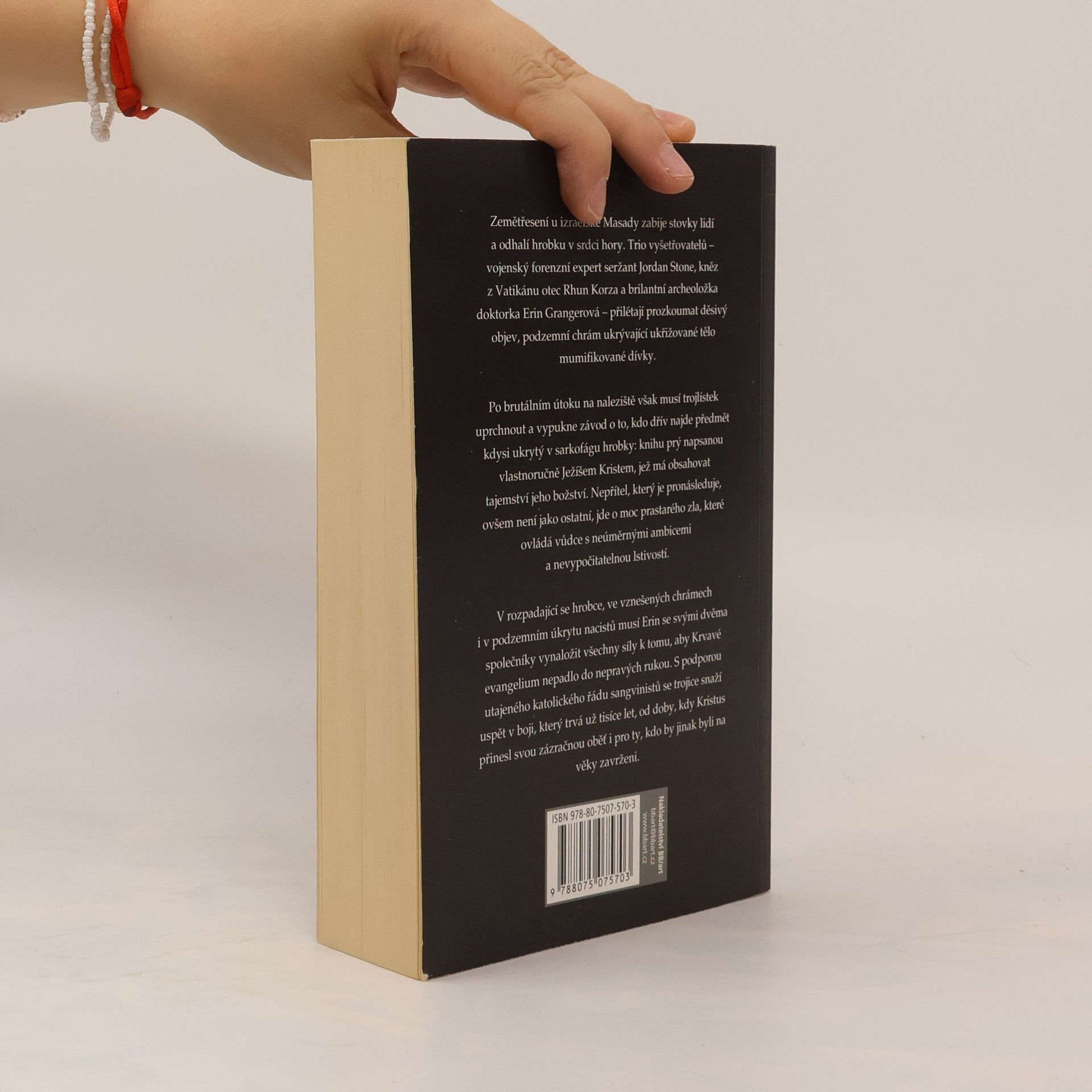 Přidat do mých knih KoupitKoupit eknihu Zemětřesení v izraelské Masadě zabije stovky lidí a odhalí hrobku v srdci hory. Trio vyšetřovatelů – seržant Jordan Stone, vojenský forenzní expert, otec Rhun Korza, kněz z Vatikánu a doktorka Erin Grangerová, brilantní, ale rozčarovaná archeoložka – jsou vysláni, aby prozkoumali děsivý objev, podzemní chrám ukrývající ukřižované tělo mumifikované dívky. Ale po brutálním útoku na naleziště musí uprchnout a vypukne závod o to, aby vrátili, co bylo kdysi ukryto v sarkofágu hrobky: knihu napsanou prý vlastnoručně Ježíšem Kristem, která má obsahovat tajemství jeho božství. Avšak nepřítel, který jim je v patách, není jako ostatní, jde o moc prastarého zla, které ovládá vůdce s neúměrnými ambicemi a nevypočitatelnou lstivostí. V rozpadající se hrobce i v okázalých chrámech musí Erin se svými společníky bojovat s minulostí vedoucí tisíce let zpět do doby, kdy v temných koutech světa lovily nečisté stvůry, až k okamžiku, kdy Kristus přinesl svou zázračnou oběť, smlouvu o spasení pro ty, kdo by jinak byli na věky zavrženi. Druhé vydání.