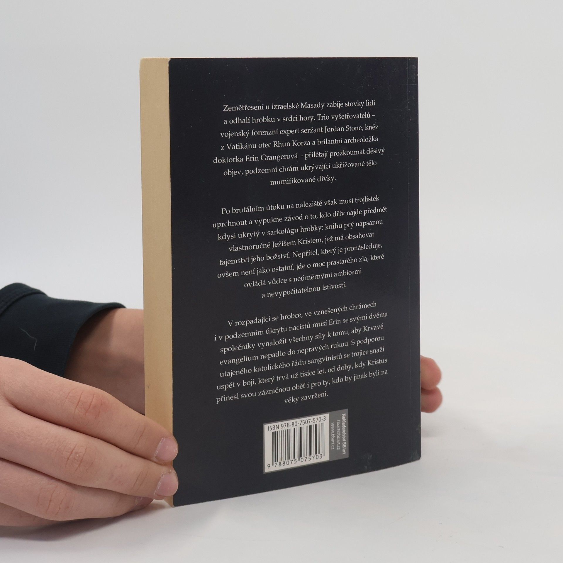 Přidat do mých knih KoupitKoupit eknihu Zemětřesení v izraelské Masadě zabije stovky lidí a odhalí hrobku v srdci hory. Trio vyšetřovatelů – seržant Jordan Stone, vojenský forenzní expert, otec Rhun Korza, kněz z Vatikánu a doktorka Erin Grangerová, brilantní, ale rozčarovaná archeoložka – jsou vysláni, aby prozkoumali děsivý objev, podzemní chrám ukrývající ukřižované tělo mumifikované dívky. Ale po brutálním útoku na naleziště musí uprchnout a vypukne závod o to, aby vrátili, co bylo kdysi ukryto v sarkofágu hrobky: knihu napsanou prý vlastnoručně Ježíšem Kristem, která má obsahovat tajemství jeho božství. Avšak nepřítel, který jim je v patách, není jako ostatní, jde o moc prastarého zla, které ovládá vůdce s neúměrnými ambicemi a nevypočitatelnou lstivostí. V rozpadající se hrobce i v okázalých chrámech musí Erin se svými společníky bojovat s minulostí vedoucí tisíce let zpět do doby, kdy v temných koutech světa lovily nečisté stvůry, až k okamžiku, kdy Kristus přinesl svou zázračnou oběť, smlouvu o spasení pro ty, kdo by jinak byli na věky zavrženi. Druhé vydání.