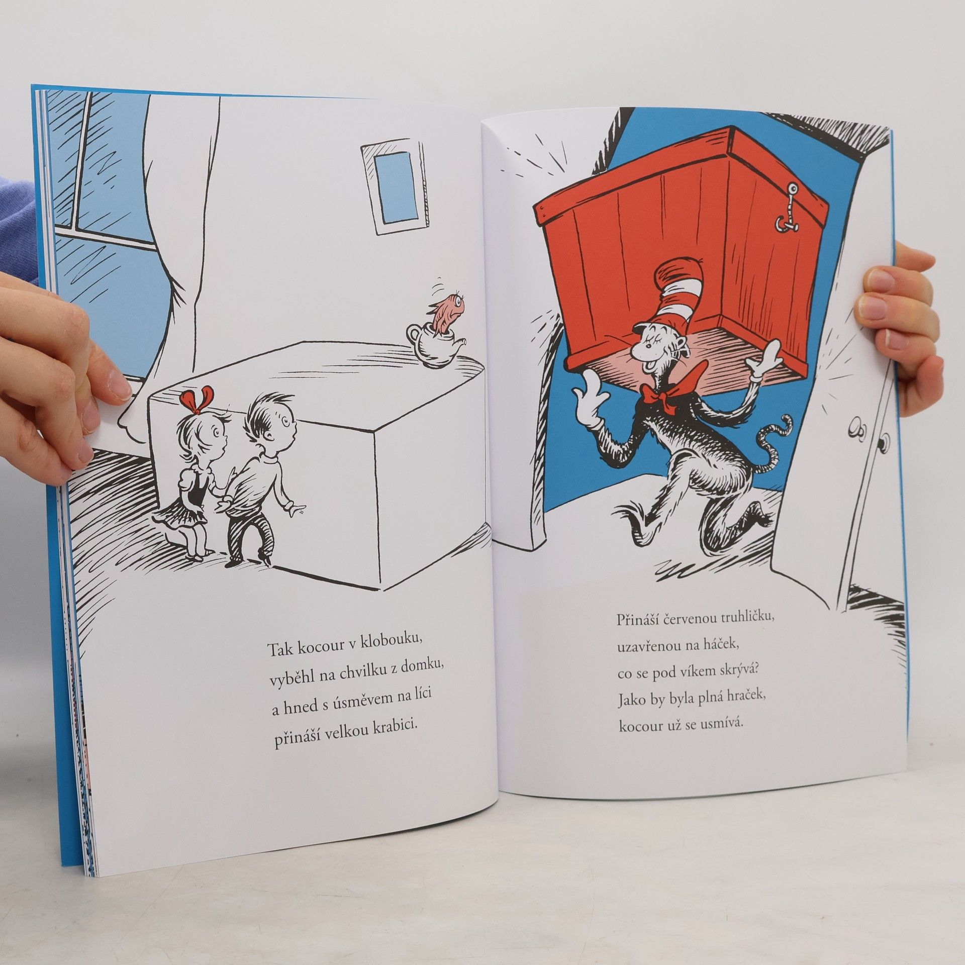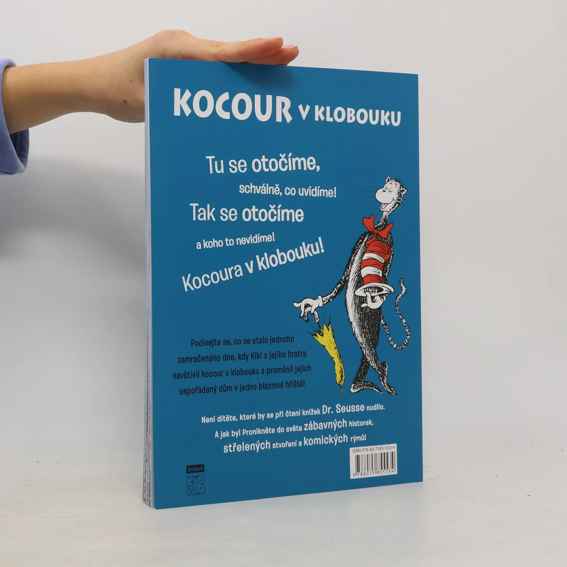 Je deštivý den a děti se nemohou zabavit… dokud se neobjeví Kocour a nezachrání tohle nudné odpoledne. Kniha Dr. Seusse je perfektní pro začátečníky. Obsahuje nadčasové postavy jako je Rybička, Jednička nebo Dvojka, kniha vás zabaví při předčítání, ale přitom je dostatečně lehká na to, aby ji děti četly o samotě. Obsahuje slova, která prvňák nebo druhák zvládne sám přečíst a zná je ze školy. Kniha je oblíbená mezi rodiči, začínajícími čtenáři, učiteli i knihovníky. Kniha byla napsána pro začátečníky, aby je podpořila v samostatném čtení a dodala jim kuráž jednoduchými slovy a ilustracemi, které napovídají jejich význam.