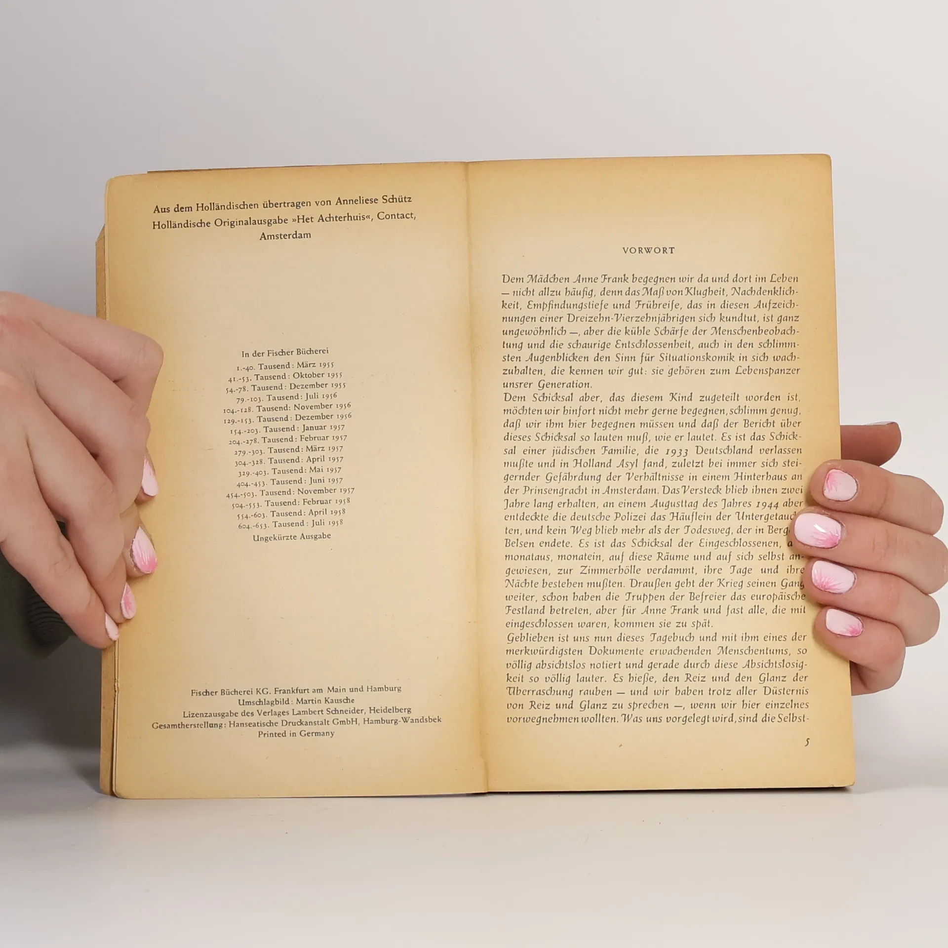 Die weltweit gültige und verbindliche Fassung des Tagebuchs von Anne Frank, autorisiert vom Anne Frank Fonds Basel, vereint Symbolik und Dokumentation. Es steht für den Völkermord an den Juden durch die Nazis und dokumentiert das Leben einer talentierten jungen Schriftstellerin. Diese Ausgabe ist die einzige autorisierte Fassung, die Annes überarbeitete Texte enthält, ohne die von ihrem Vater Otto Frank vorgenommenen Auslassungen. Mirjam Pressler hat eine neue, dem Stil des Originals entsprechende Übersetzung erarbeitet. Der vollständige Text vermittelt ein eindrucksvolles Bild von Annes Gefühls- und Gedankenwelt sowie ihren Fortschritten als Schriftstellerin. Anne Frank fragte sich: „Werde ich jemals Journalistin und Schriftstellerin werden? Ich hoffe es, ich hoffe es so sehr!“ Anne hinterließ zwei fragmentarische Tagebuchversionen: Version a ist der ursprüngliche Text, während Version b ihre unvollendete Bearbeitung darstellt, die 1986 veröffentlicht wurde. Version c war die erste Fassung, die Otto Frank 1947 veröffentlichte, wobei er sensible Stellen entfernte. Diese Version ist seit 1990 nicht mehr erhältlich. Version d, die vom Anne Frank Fonds autorisierte Leseausgabe, vereint die ungekürzten Texte der Versionen a und b und ist seit 1991 die verbindliche Grundlage für Übersetzungen in über 80 Sprachen. Alle Versionen, außer Version c, sind in verschiedenen Ausgaben von Mirjam Pressler im S. Fischer Verlag erhältlich.