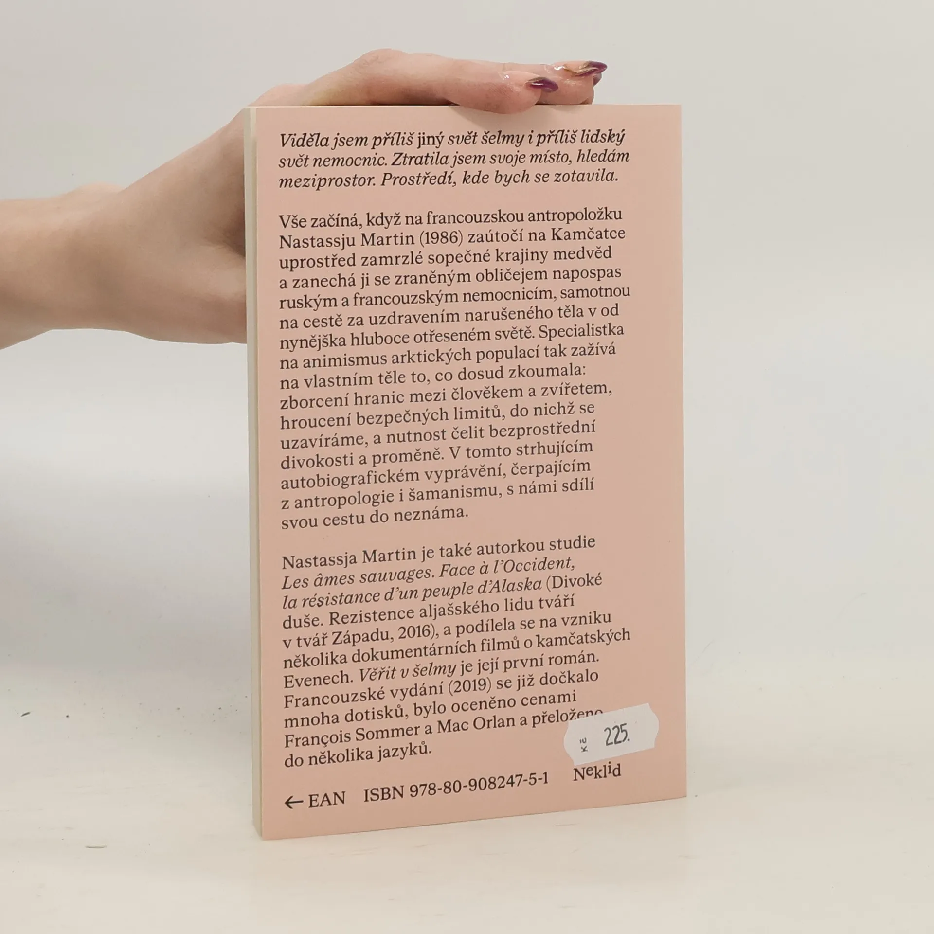 Viděla jsem příliš jiný svět šelmy i příliš lidský svět nemocnic. Ztratila jsem své místo, hledám meziprostor. Prostředí, kde bych se zotavila. Vše začíná, když na francouzskou antropoložku Nastassju Martin (1986) zaútočí na Kamčatce uprostřed zamrzlé sopečné krajiny medvěd, a zanechá ji se zraněným obličejem napospas ruským a francouzským nemocnicím, samotnou na cestě za uzdravením narušeného těla v od nynějška hluboce otřeseném světě. Specialistka na animismus arktických populací tak zažívá na vlastním těle to, co dosud zkoumala: zborcení hranic mezi člověkem a zvířetem, hroucení bezpečných limitů, do nichž se uzavíráme, a nutnost čelit bezprostřední divokosti a proměně. V tomto strhujícím autobiografickém vyprávění, čerpajícím z antropologie i šamanismu, s námi sdílí svou cestu do neznáma. Nastassja Martin je také autorkou studie Les âmes sauvages. Face à l’Occident, la résistance d’un peuple d’Alaska (Divoké duše. Rezistence aljašského lidu tváří v tvář Západu, 2016), a podílela se na vzniku několika dokumentárních filmů o kamčatských Evenech. Věřit v šelmy je její první román. Francouzské vydání (2019) se již dočkalo mnoha dotisků, bylo oceněno cenami François Sommer a Mac Orlan a přeloženo do několika jazyků.