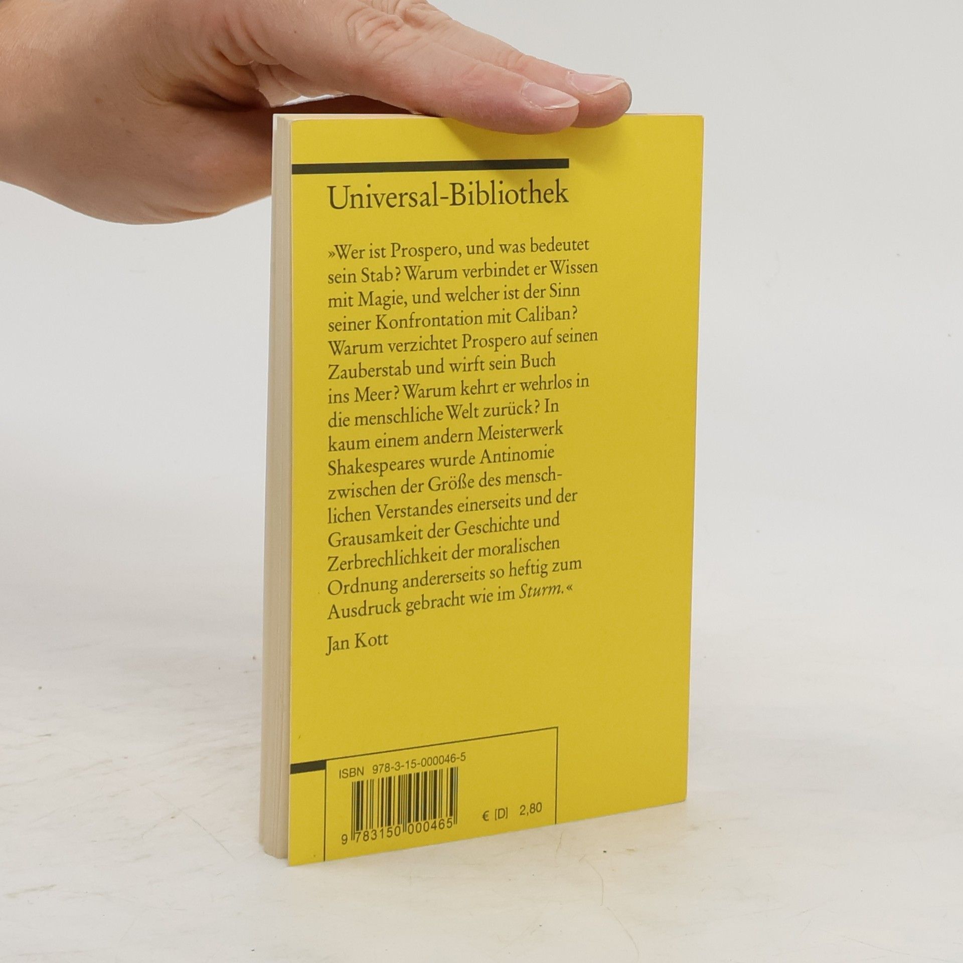 »Wer ist Prospero, und was bedeutet sein Stab? Warum verbindet er Wissen mit Magie, und welcher ist der Sinn seiner Konfrontation mit Caliban? Warum verzichtet Prospero auf seinen Zauberstab und wirft sein Buch ins Meer? Warum kehrt er wehrlos in die menschliche Welt zurück? In kaum einem andern Meisterwerk Shakespeares wurde die Antinomie zwischen der Größe des menschlichen Verstandes einerseits und der Grausamkeit der Geschichte und Zerbrechlichkeit der moralischen Ordnung andererseits so heftig zum Ausdruck gebracht wie im ›Sturm‹.« Jan Kott