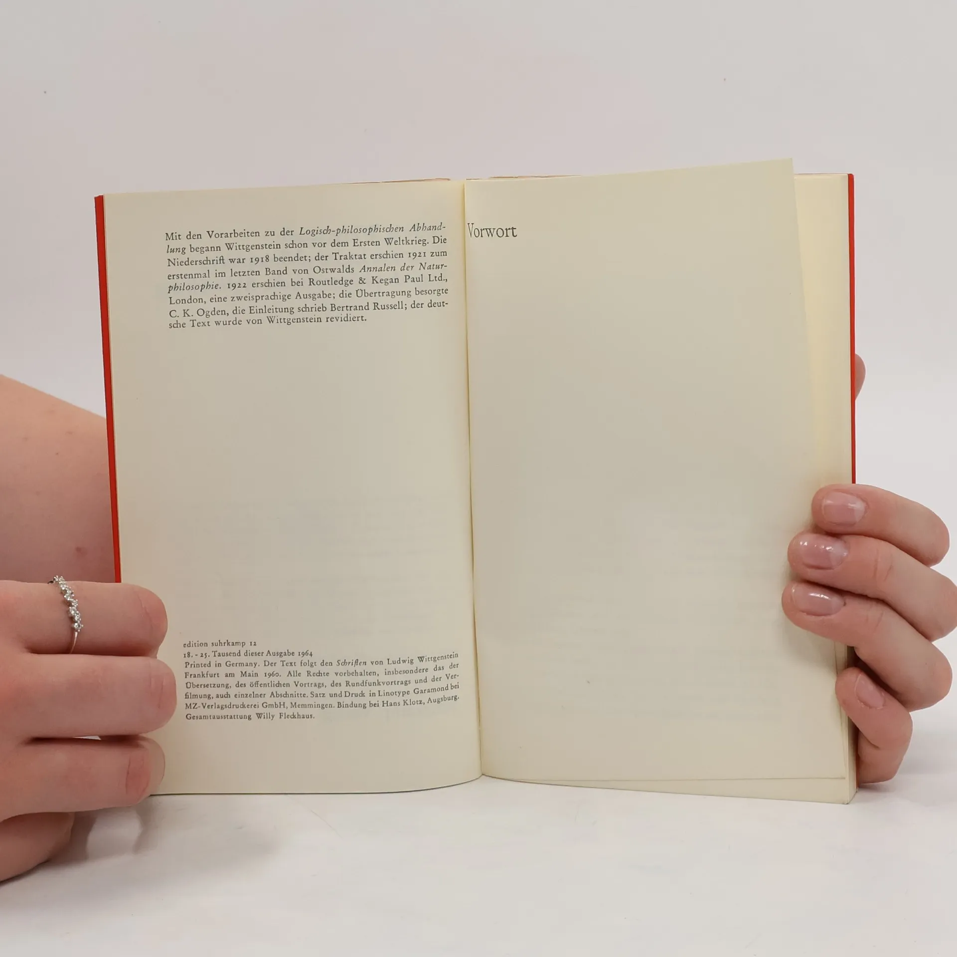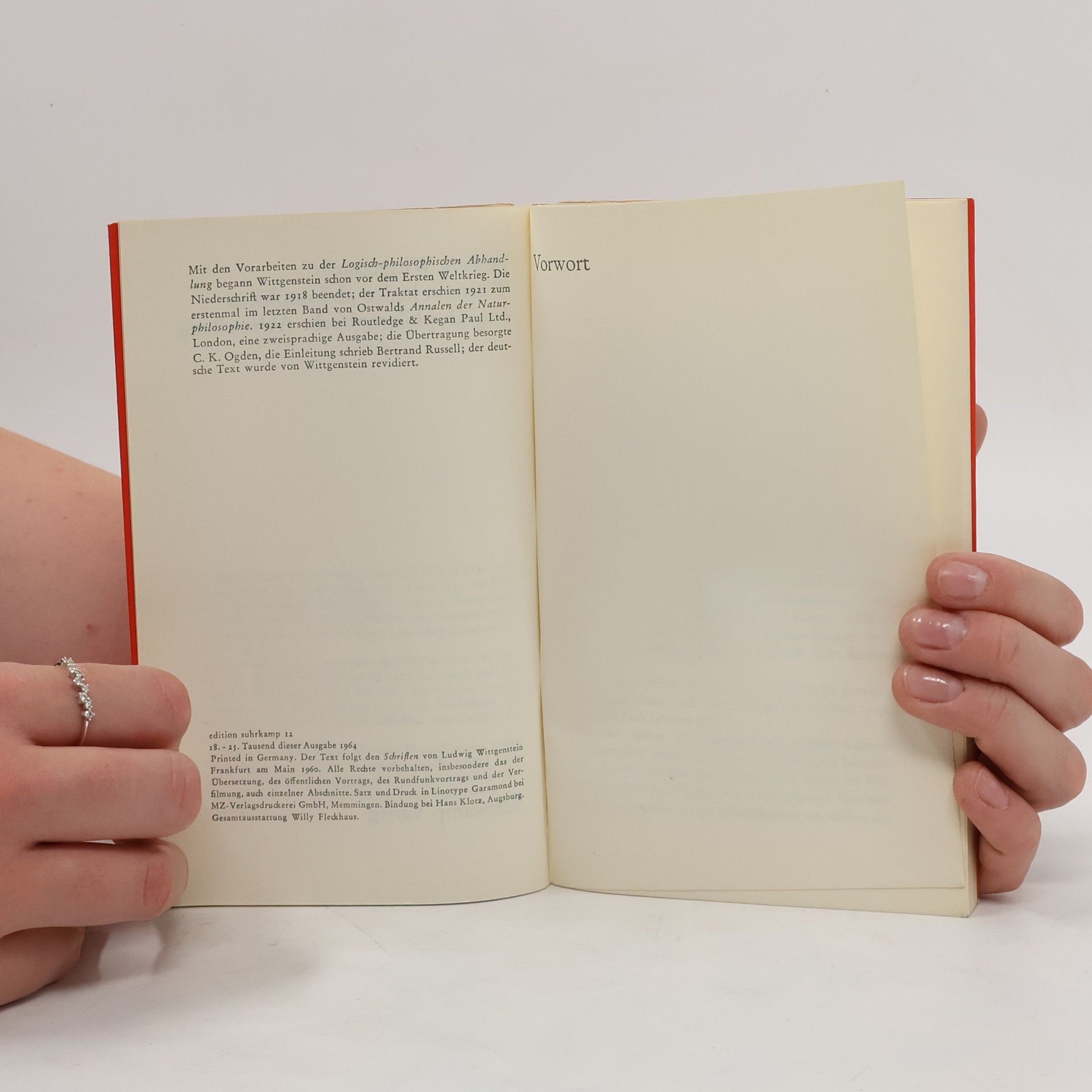 Ein philosophisches Traktat von größtmöglicher Allgemeinheit und Endgültigkeit: »Die Welt ist alles, was der Fall ist.« »Man könnte den ganzen Sinn des Buches etwa in die Worte fassen: Was sich überhaupt sagen läßt, läßt sich klar sagen; und wovon man nicht reden kann, darüber muß man schweigen.« Diese Ausgabe des Tractatus logico-philosophicus ist Teil der Edition SUHRKAMP LETTERPRESS, die in Zusammenarbeit mit dem Typographen Erik Spiekermann und der SÜPERGRÜP, einer Gruppe von sieben ausgezeichneten deutschen Designern – neben Erik Spiekermann Mirko Borsche, Johannes Erler, Lars Harmsen, Sarah Illenberger, Eike König und Mario Lombardo –, entstanden ist: sieben herausragende Werke des 20. Jahrhunderts, alle erschienen im Suhrkamp Verlag, neu gestaltet, gesetzt und von digital belichteten Platten im Buchdruckverfahren auf einem Original Heidelberger Zylinder gedruckt. Die exklusive nummerierte Auflage ist limitiert auf 1.000 Exemplare und mit Lesebändchen und einer Broschüre zum Projekt ausgestattet. Lars Harmsen, SÜPERGRÜP, entwarf den Umschlag. Erik Spiekermann hat Satz und Layout vorgenommen.