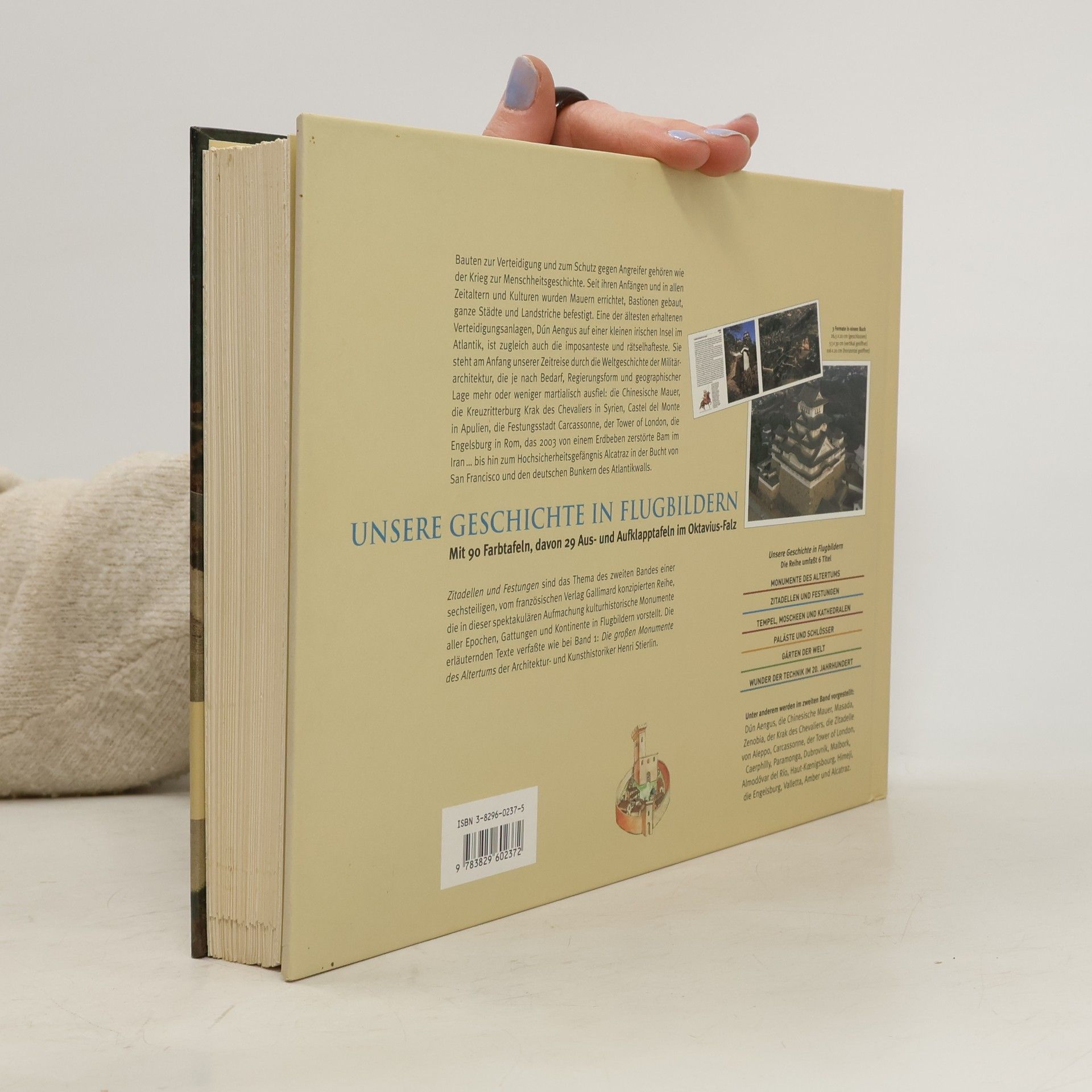 Nach den Monumenten des Altertums, die von unseren Lesern mit großer Begeisterung aufgenommen wurden, stellt Henri Stierlin im 2. Band der Gallimard-Reihe „Unsere Geschichte in Flugbildern“ Zitadellen und Festungen vor. Bauten zur Verteidigung und zum Schutz gegen Angreifer gehören wie der Krieg zur Menschheitsgeschichte. Seit ihren Anfängen und in allen Zeitaltern und Kulturen wurden Bastionen gebaut, Mauern errichtet, ganze Städte und Landstriche befestigt. Eine der ältesten erhaltenen Verteidigungsanlagen, Dún Aengus auf einer kleinen irischen Insel im Atlantik, ist zugleich auch die imposanteste und rätselhafteste. Sie steht am Anfang unserer Zeitreise durch die Weltgeschichte der Militärbaukunst, die je nach Bedarf, Regierungsform und geographischer Lage mehr oder weniger martialisch ausfiel: die Chinesische Mauer, die Kreuzritterburg Krak des Chevaliers in Syrien, Castel del Monte in Apulien, die Festungsstadt Carcassonne, der Tower of London, die Engelsburg in Rom, das 2003 von einem Erdbeben zerstörte Bam im Iran. bis hin zum Hochsicherheitsgefängnis Alcatraz in der Bucht von San Francisco und den deutschen Bunkern des Atlantikwalls. In der Reihe Unsere Geschichte in Flugbildern erschien bereits Band 1: Die großen Monumente des Altertums. Die Reihe wird fortgesetzt mit Band 3: Tempel, Moscheen und Kathedralen Band 4: Paläste und Schlösser Band 5: Gärten der Welt Band 6: Wunder der Technik im 20. Jahrhundert