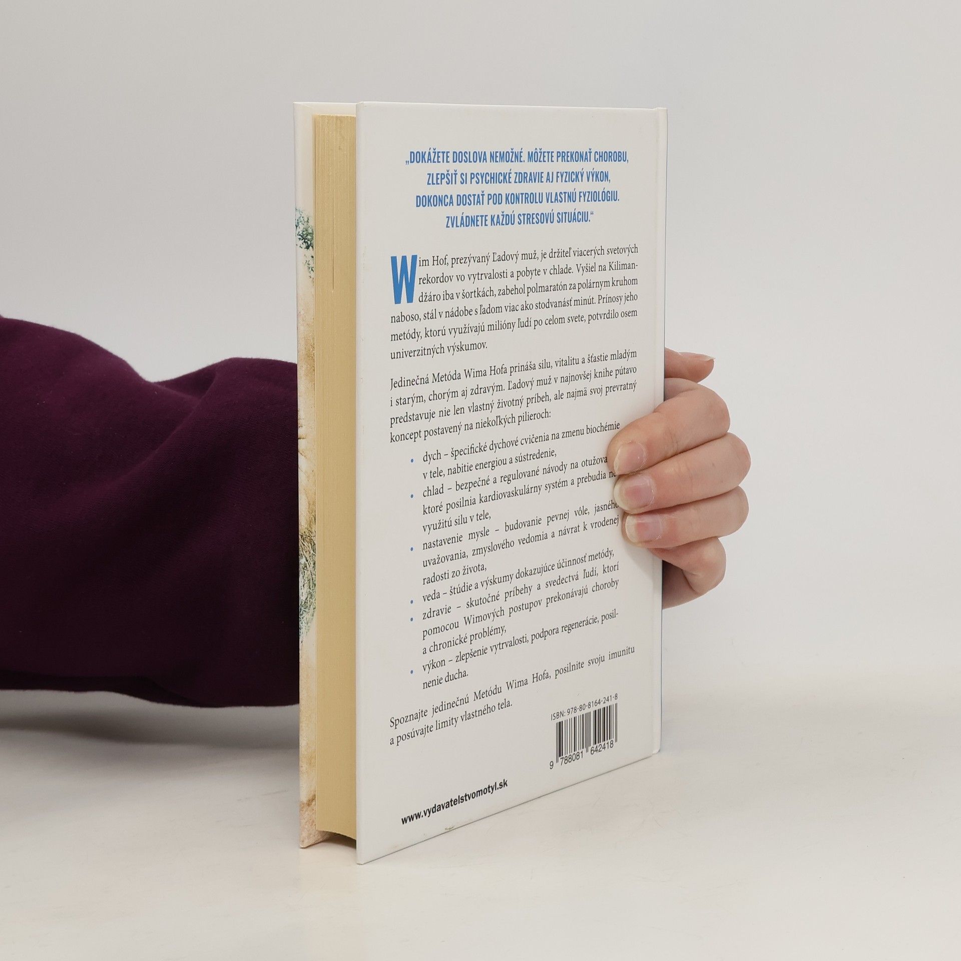„Dokážete doslova nemožné. Môžete prekonať chorobu, zlepšiť si psychické zdravie aj fyzický výkon, dokonca dostať pod kontrolu vlastnú fyziológiu. Zvládnete každú stresovú situáciu. “ Wim Hof, prezývaný Ľadový muž, je držiteľ viacerých svetových rekordov vo vytrvalosti a pobyte v chlade. Vyšiel na Kilimandžáro iba v šortkách, zabehol polmaratón za polárnym kruhom naboso, stál v nádobe s ľadom viac ako stodvanásť minút. Prínosy jeho metódy, ktorú využívajú milióny ľudí po celom svete, potvrdilo osem univerzitných výskumov.