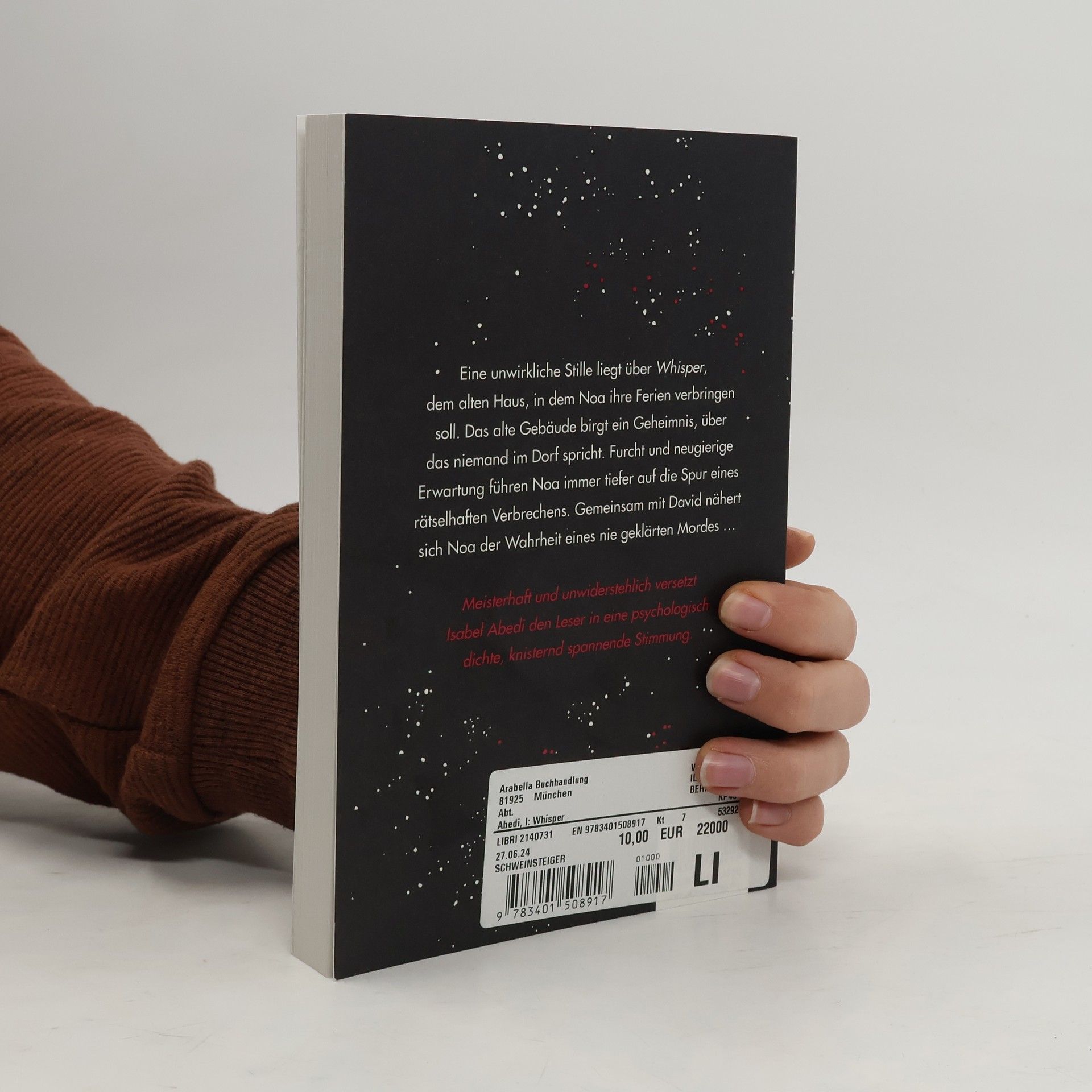 Eine unwirkliche Stille liegt über Whisper , dem alten Haus, in dem Noa ihre Ferien verbringen soll. Das alte Gebäude birgt ein Geheimnis, über das niemand im Dorf spricht. Gemeinsam mit David nähert sich Noa der Wahrheit eines nie geklärten Mordes. Meisterhaft und unwiderstehlich versetzt Isabel Abedi den Leser in eine psychologisch dichte, knisternd spannende Stimmung. Nominiert für den Deutschen Jugendliteraturpreis.