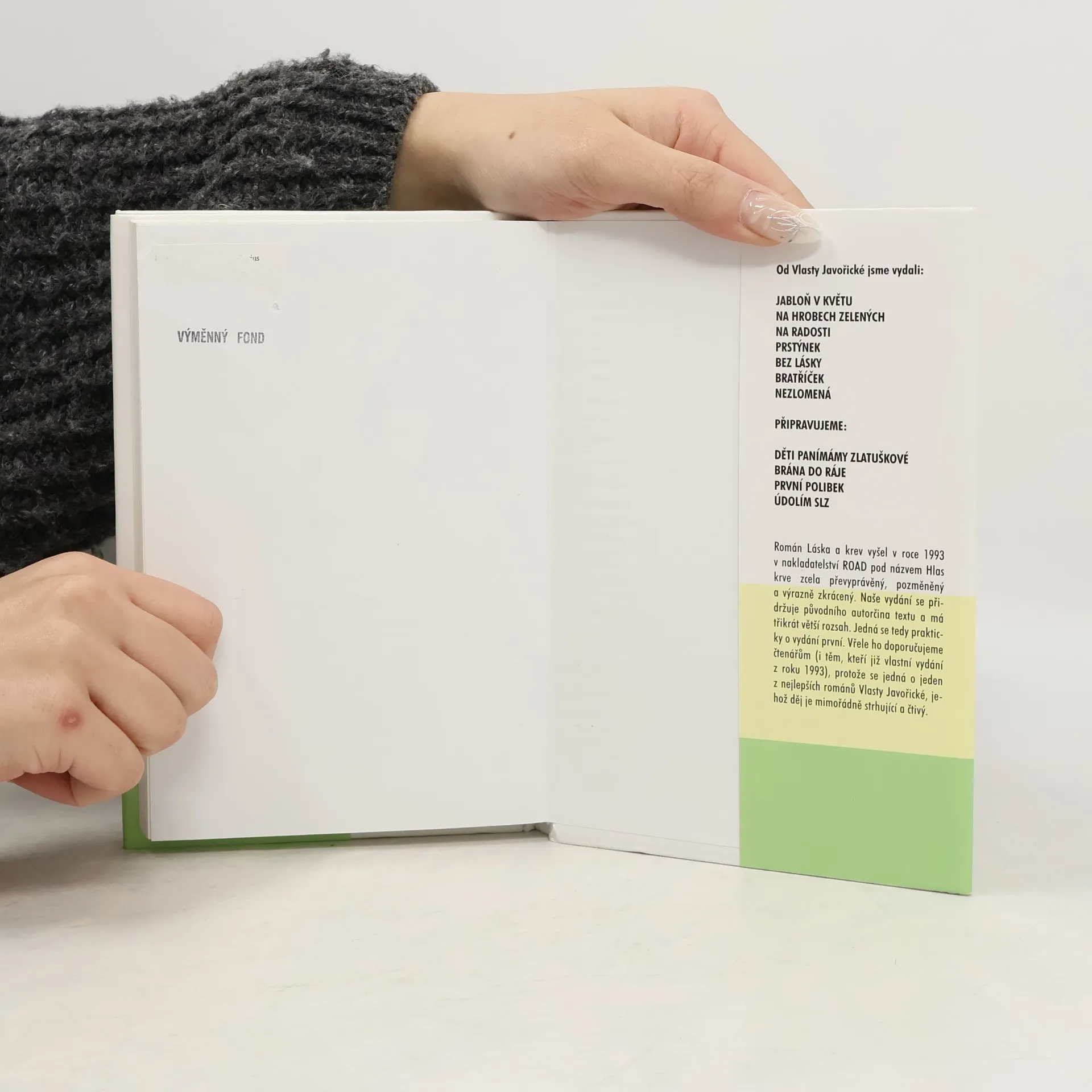 Malebná venkovská krajina, ale i prostředí rušného velkoměsta - Vídně i Prahy, kouzelná zákoutí zámečku v Jabloňově, to vše je pozadím pro jednu z nejlepších prací Vlasty Javořické, která v této podobě - dle originálu - vychází poprvé. Je to skutečná lahůdka pro rozsáhlou čtenářskou obec spisovatelky z pod Javořice. Román Láska a krev vyšel v roce 1993 v nakladatelství ROAD pod názvem Hlas krve zcela převyprávěný, pozměněný a výrazně zkrácený. Toto vydání se přidržuje původního autorčina textu a má třikrát větší rozsah.