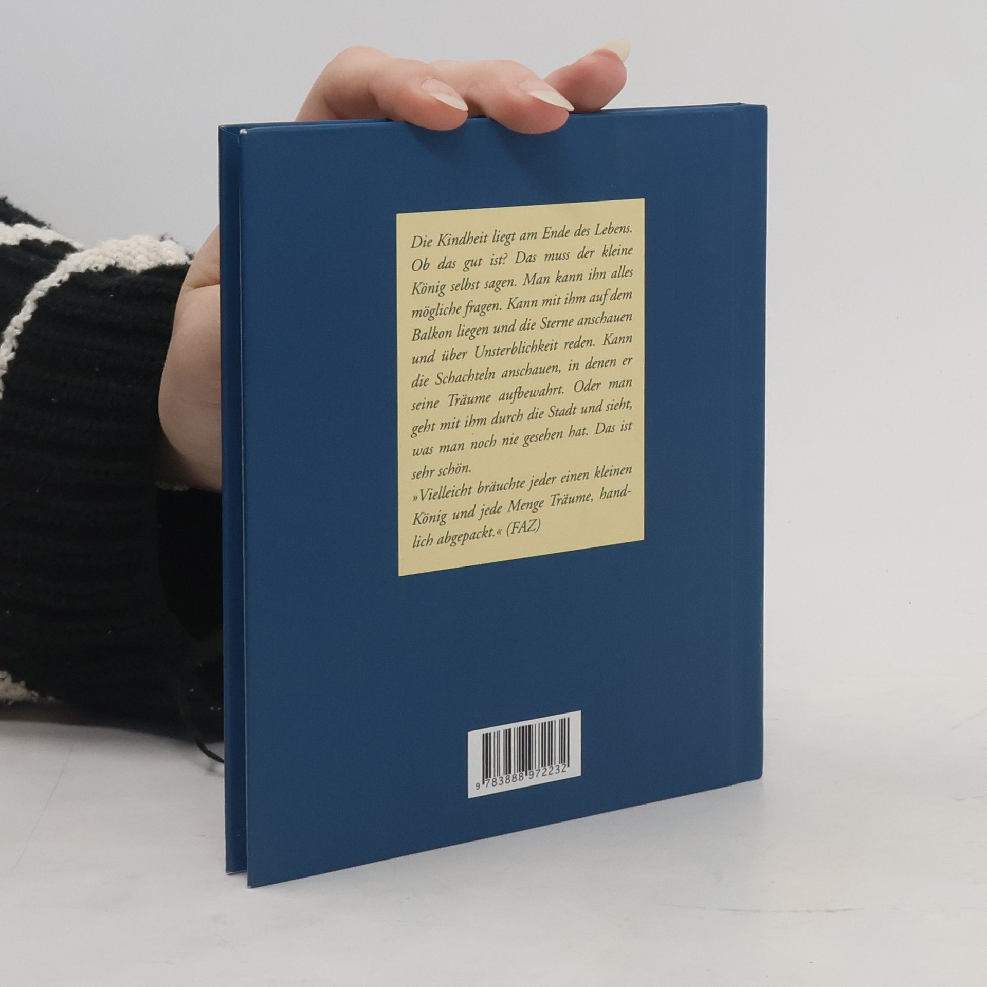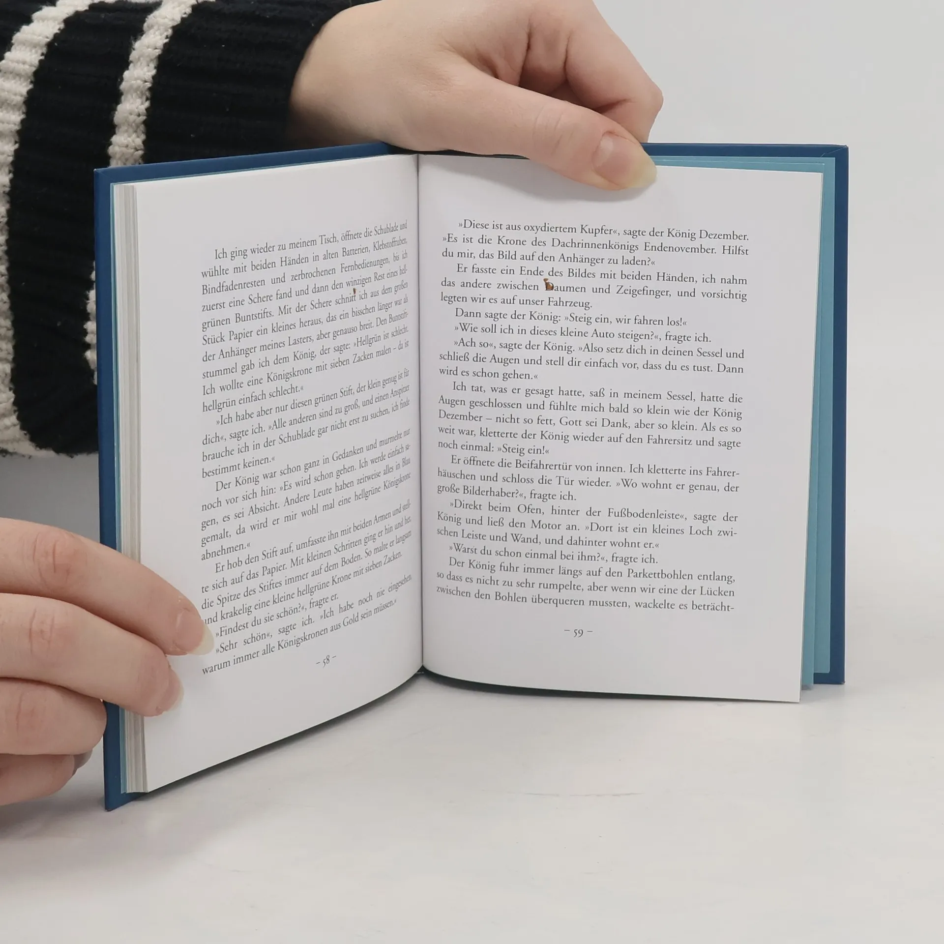 Er ist angezogen wie ein richtiger König, wie ein großer König. Er trägt einen roten Samtmantel mit weißem Hermelinbesatz. Aber er ist ein Winzling, nicht länger als ein Zeigefinger. Und dick ist er, denn seine Lieblingsspeise sind Gummibärchen. Wenn er eins isst, muss er es mit beiden Armen umfassen. Er kann es kaum hochheben, denn es ist beinahe halb so groß wie der ganze König. Und auch sonst ist sein Leben anders als das unsere. Bei seiner Geburt war er schon ausgewachsen und wusste fast alles, konnte rechnen und schreiben. Nur eine Kindheit kannte er nicht, die kommt vielleicht am Ende seines Lebens.