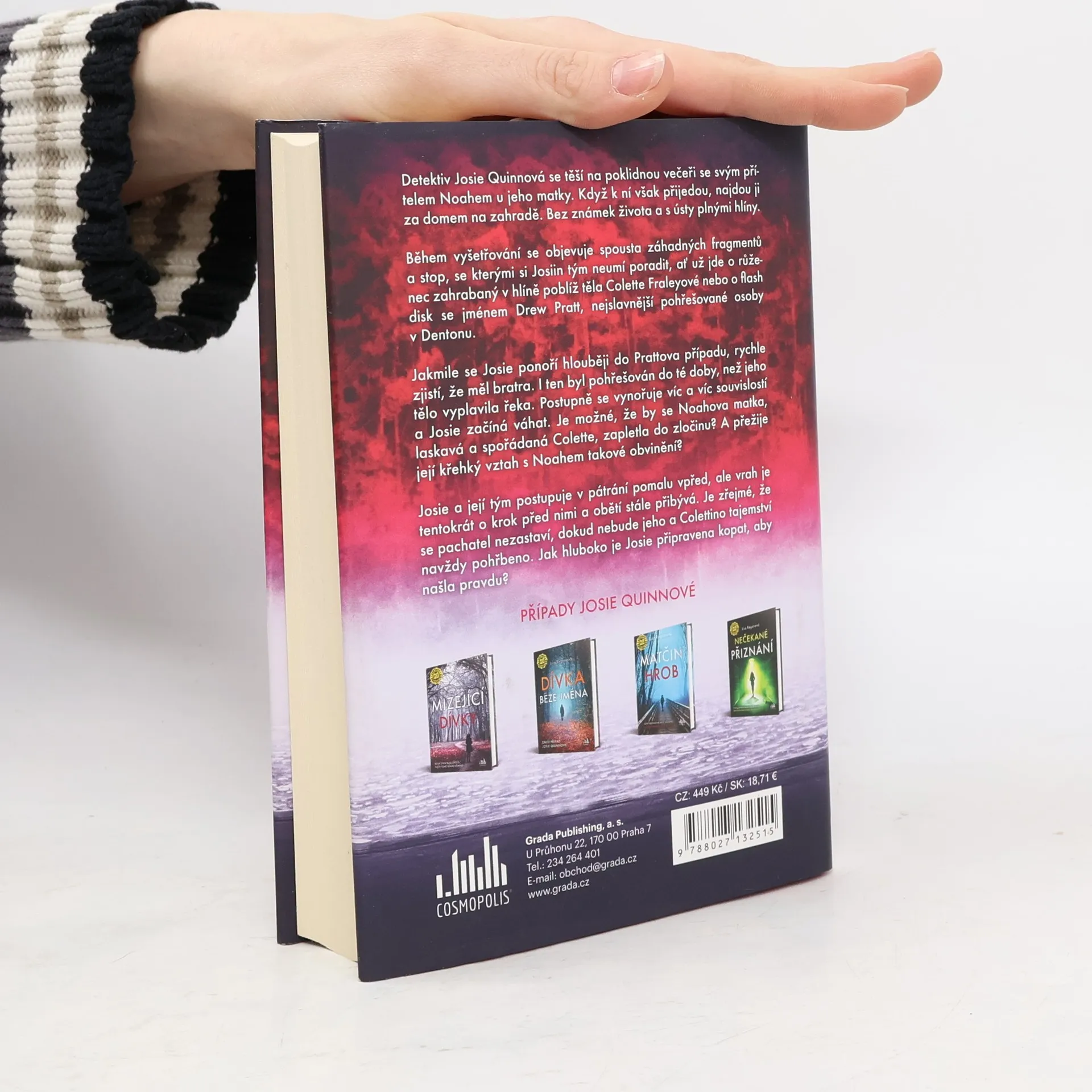 Detektiv Josie Quinnová se těší na poklidnou večeři se svým přítelem Noahem u jeho matky. Když k ní však přijedou, najdou ji za domem na zahradě. Bez známek života a s ústy plnými hlíny.Během vyšetřování se objevuje spousta záhadných fragmentů a stop, se kterými si Josiin tým neumí poradit, ať už jde o růženec zahrabaný v hlíně poblíž těla Colette Fraleyové nebo o flash disk se jménem Drew Pratt, nejslavnější pohřešované osoby v Dentonu.Jakmile se Josie ponoří hlouběji do Prattova případu, rychle zjistí, že měl bratra. I ten byl pohřešován do té doby, než jeho tělo vyplavila řeka. Postupně se vynořuje víc a víc souvislostí a Josie začíná váhat. Je možné, že by se Noahova matka, laskavá a spořádaná Colette, zapletla do zločinu? A přežije její křehký vztah s Noahem takové obvinění?Josie a její tým postupuje v pátrání pomalu vpřed, ale vrah je tentokrát o krok před nimi a obětí stále přibývá. Je zřejmé, že se pachatel nezastaví, dokud nebude jeho a Colettino tajemství navždy pohřbeno. Jak hluboko je Josie připravena kopat, aby našla pravdu?
