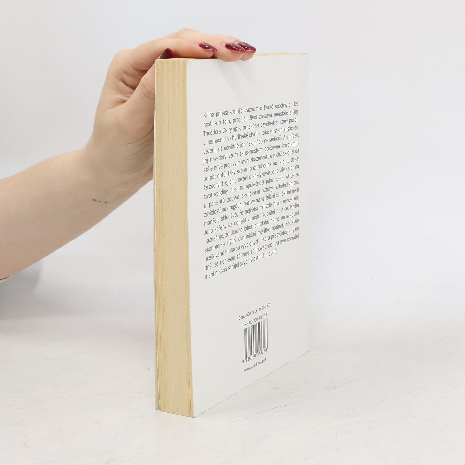 Podtitul: Světový názor, který vytváří spodinu společnosti Kniha britského psychiatra podává svědectví o životě spodiny společnosti. Autor, který je zaměstnán v nemocnici v chudinské čtvrti jako vězeňský lékař, zachycuje projevy mravní zkaženosti svých pacientů. Analyzuje jejich vliv nejen na život spodiny, ale i na společnost jako celek. Zabývá se sexuálními vztahy, alkoholismem, závislostí na drogách, ale i názory na vzdělání. Kniha naznačuje, že dlouhodobou chudobu má na svědomí pokřivené měřítko hodnot a nulová odpovědnost za vlastní jednání.