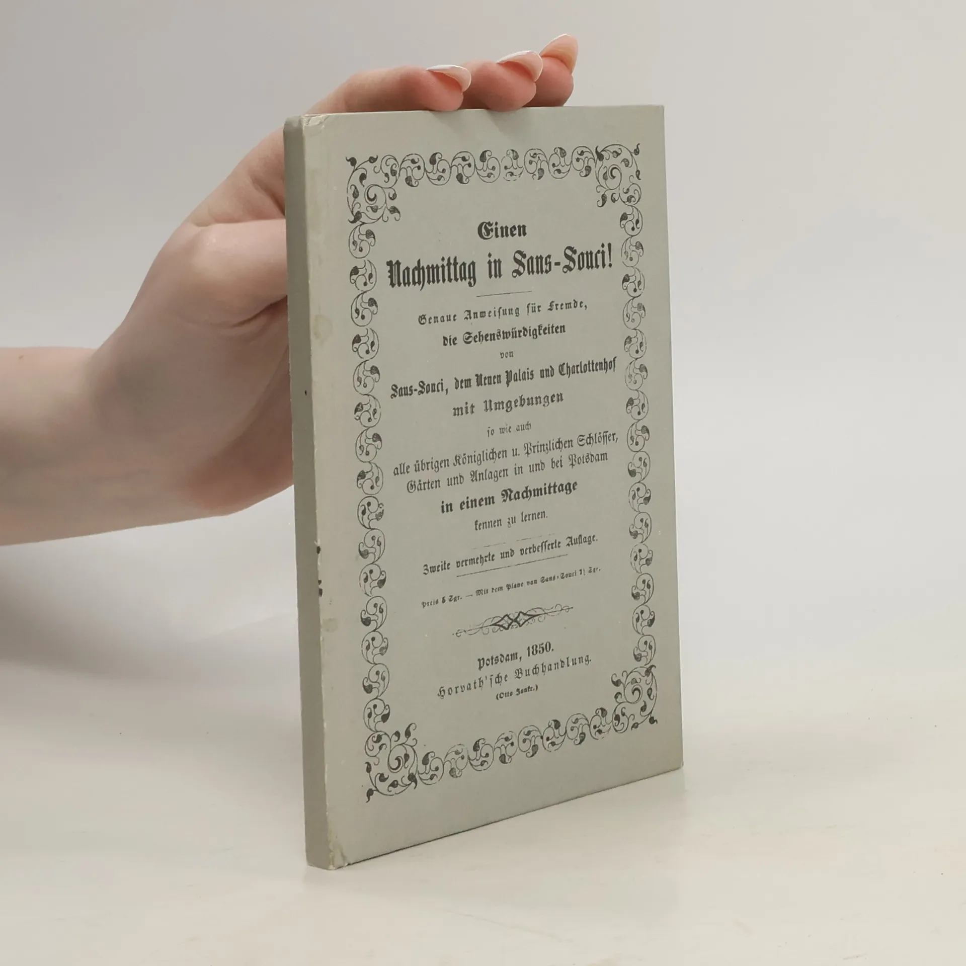 Einen Nachmittag in Sans-Souci! Geanue Anweisung für Fremde, die Sehenswürdigkeiten von Sans-Souci, dem Neuen Palais und Charlottenhof mit Umgebungen so wie auch alle übrigen Königlichen u. Prinzlichen Schlösser, Gärten und Anlagen in und bei Potsdam
