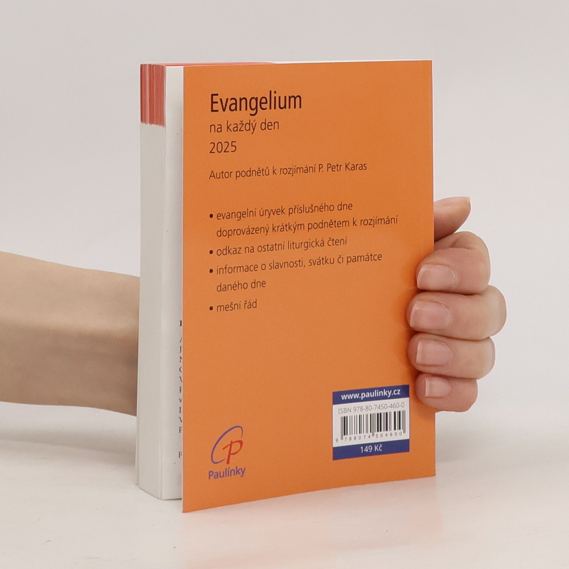 Knížka kapesního formátu je každodenním průvodcem pro ty, kdo touží číst a rozjímat evangelium v rytmu liturgie církve. Evangelní úryvek příslušného dne je doprovázen krátkým komentářem. Podněty k rozjímání na rok 2025 připravil P. Petr Karas. Evangelium dne je uvedeno v plném znění. Nechybí však odkaz na ostatní liturgická čtení a informace o slavnosti, svátku či památce daného dne. Pokud vás zajímají další knihy, ve kterých najdete témata k zamyšlení nad biblickými texty, připravili jsme speciální kategorii: Biblické zamyšlení na každý den.