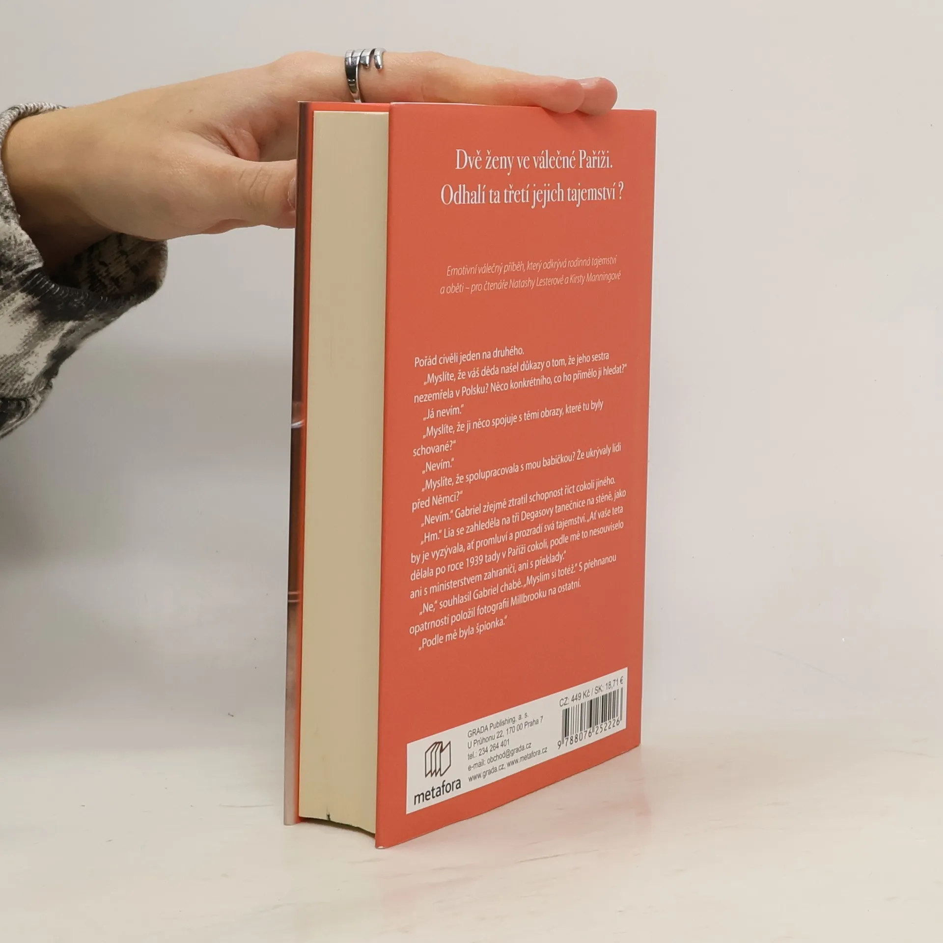 Londýn, 2017: Když Aurelia Leclairová zdědí přepychový byt v Paříži, o němž neměla ani tušení, ohromeně zjišťuje, kolik tajemství její babička skrývala: mezi jiným i sbírku vzácných obrazů a luxusních večerních rób. Jedna zvláštní malba ji dovede až k restaurátorovi Gabrielu Seymourovi a oba společně se rozhodnou odhalit pravdu skrytou ve stěnách bytu.Paříž, 1942: Ačkoli „město světel“ se potýká s německou okupací, okouzlující Estelle Allardová si užívá v salonech nedotčených útrapami války. Když si však nacisté přijdou pro její přátele, spěchá jim na pomoc a nepřemýšlí o ceně, již bude muset zaplatit. Do událostí zasáhne i tajemná špionka s krycím jménem Celine. Obě ženy se srdnatě vrhají proti ničivé převaze, která hrozí rozdrtit je i jejich milované, aniž tuší, že důsledky jejích činů ovlivní i budoucí generace.Tři ženy rozdělené časem, tři osudy odehrávající se v nebezpečné i vzkvétající Paříži. Aurelia, Sophie i Estelle musí najít odvahu, čelit nástrahám měnícího se světa a napsat další kapitolu v historii své rodiny.