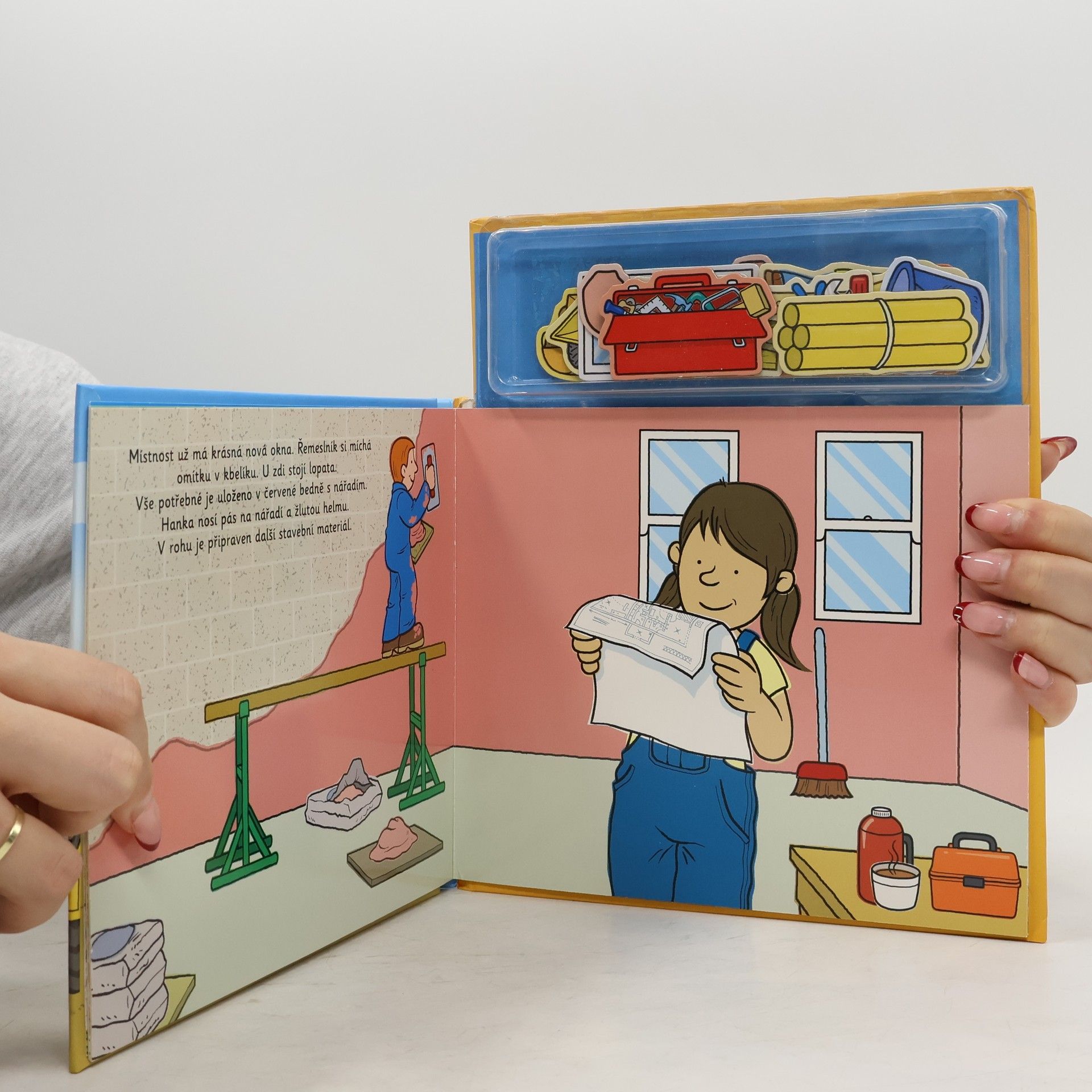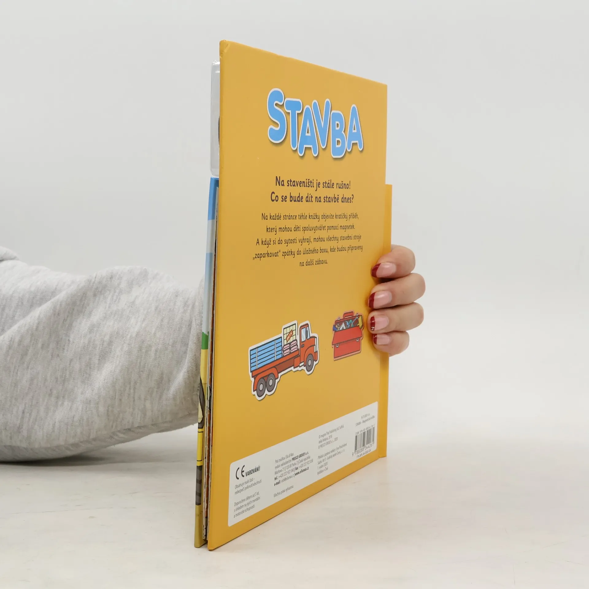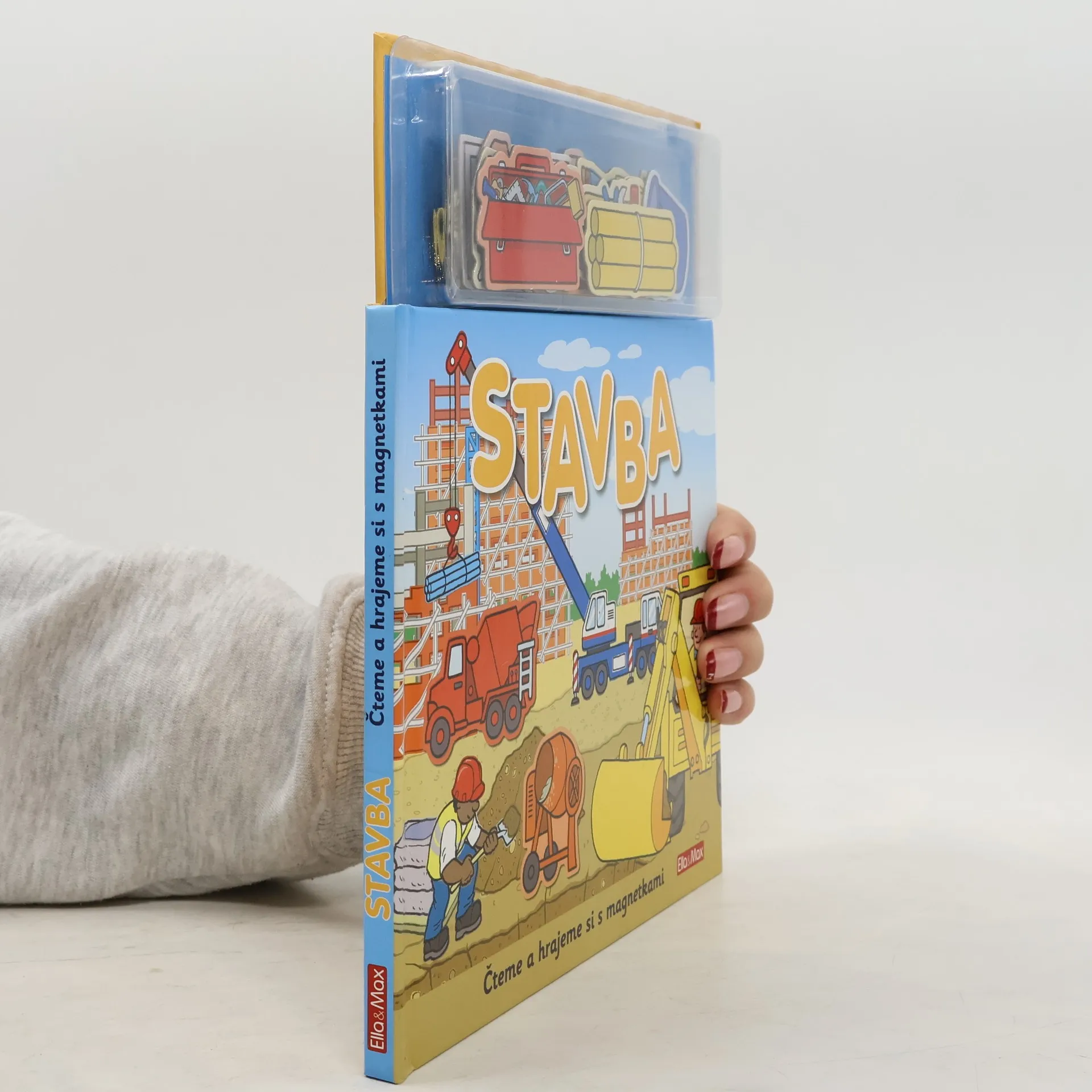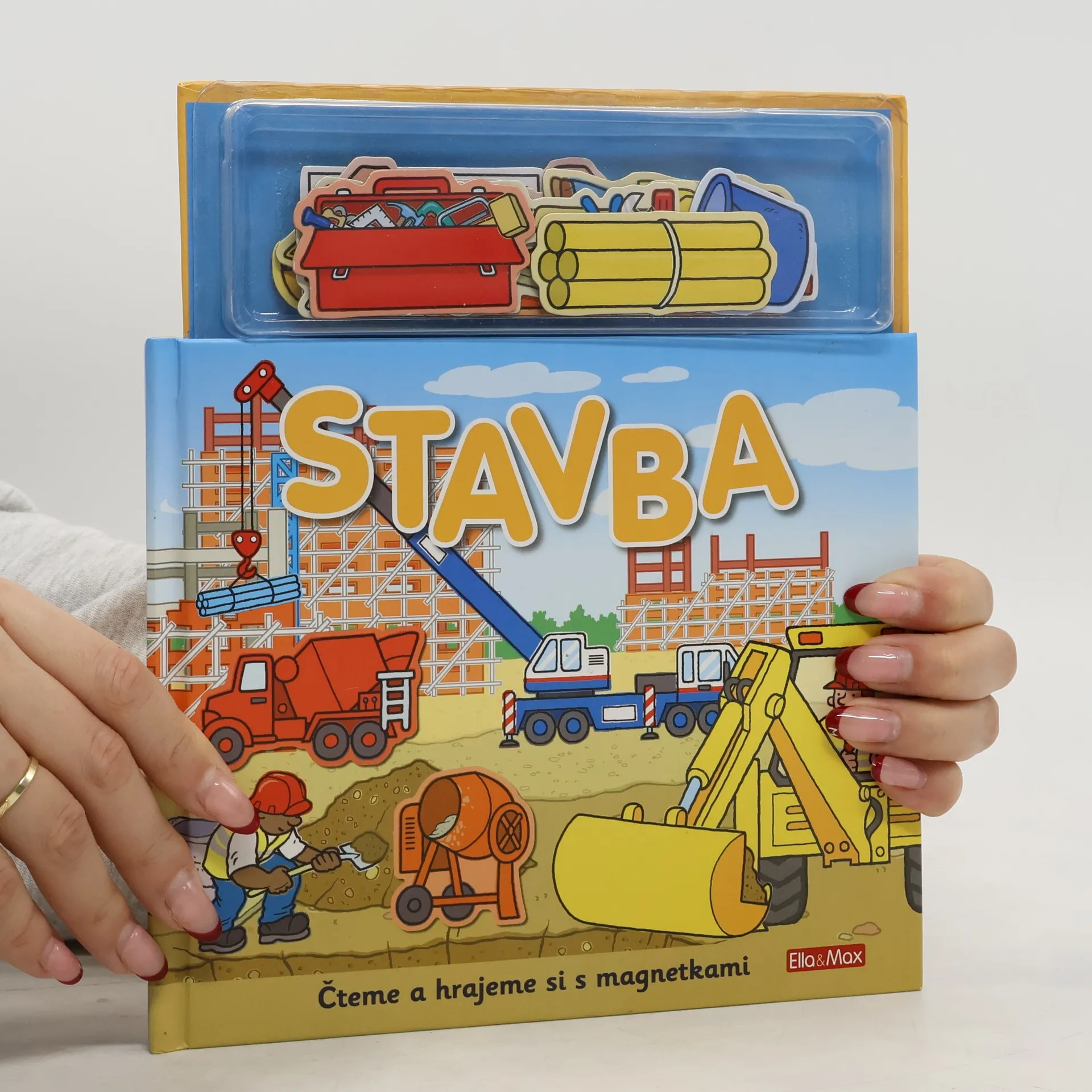 Na staveništi je pořád rušno – co se tam asi bude dít dnes? Jeřáb, míchačka, sklápěč, nejrůznější nářadí, ale třeba taky ochranná helma – to všechno je na stavbě potřeba. A těch dělníků a řemeslníků různých profesí! Na každé stránce téhle knížky objeví děti kratičkýpříběh, který mohou spoluvytvářet pomocí magnetek. A až si do sytosti vyhrají, mohou všechny magnetky zase pěkně uklidit zpátky do úložného boxu, kde budou připraveny na další skvělou zábavu. Kniha obsahuje 20 ks magnetek.