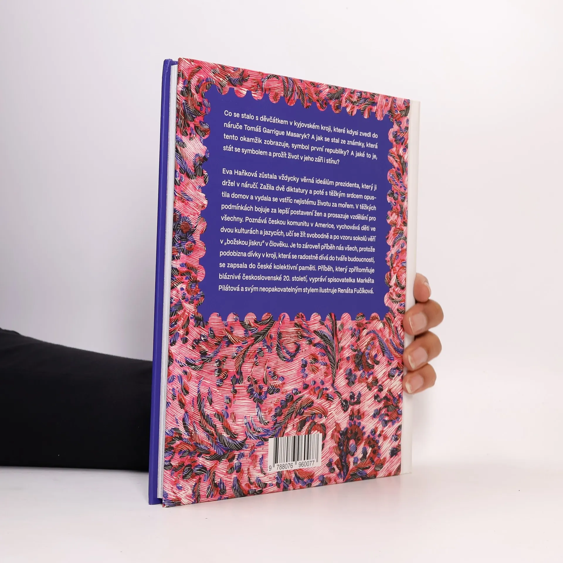 Příběh, který dokonale ilustruje bláznivé československé 20. století. Co se stalo s děvčátkem v kyjovském kroji, které kdysi zvedl do náruče Tomáš Garrigue Masaryk? A jak se stal ze známky, která tento okamžik zobrazuje, symbol první republiky? A jaké to je, stát se symbolem a prožít život v jeho záři i stínu? Eva Haňková zůstala vždycky věrná ideálům prezidenta, který ji držel v náručí. Zažila dvě diktatury a poté s těžkým srdcem opustila domov a vydala se vstříc nejistému životu za mořem. V těžkých podmínkách bojuje za lepší postavení žen a prosazuje vzdělání pro všechny. Poznává českou komunitu v Americe, vychovává děti ve dvou kulturách a jazycích, učí se žít svobodně a po vzoru sokolů věří v „božskou jiskru“ v člověku. Je to zároveň příběh nás všech, protože podobizna dívky v kroji, která se radostně dívá do tváře budoucnosti, se zapsala do české kolektivní paměti. Příběh, který zpřítomňuje bláznivé československé 20. století, vypráví spisovatelka Markéta Pilátová a svým neopakovatelným stylem ilustruje Renáta Fučíková.