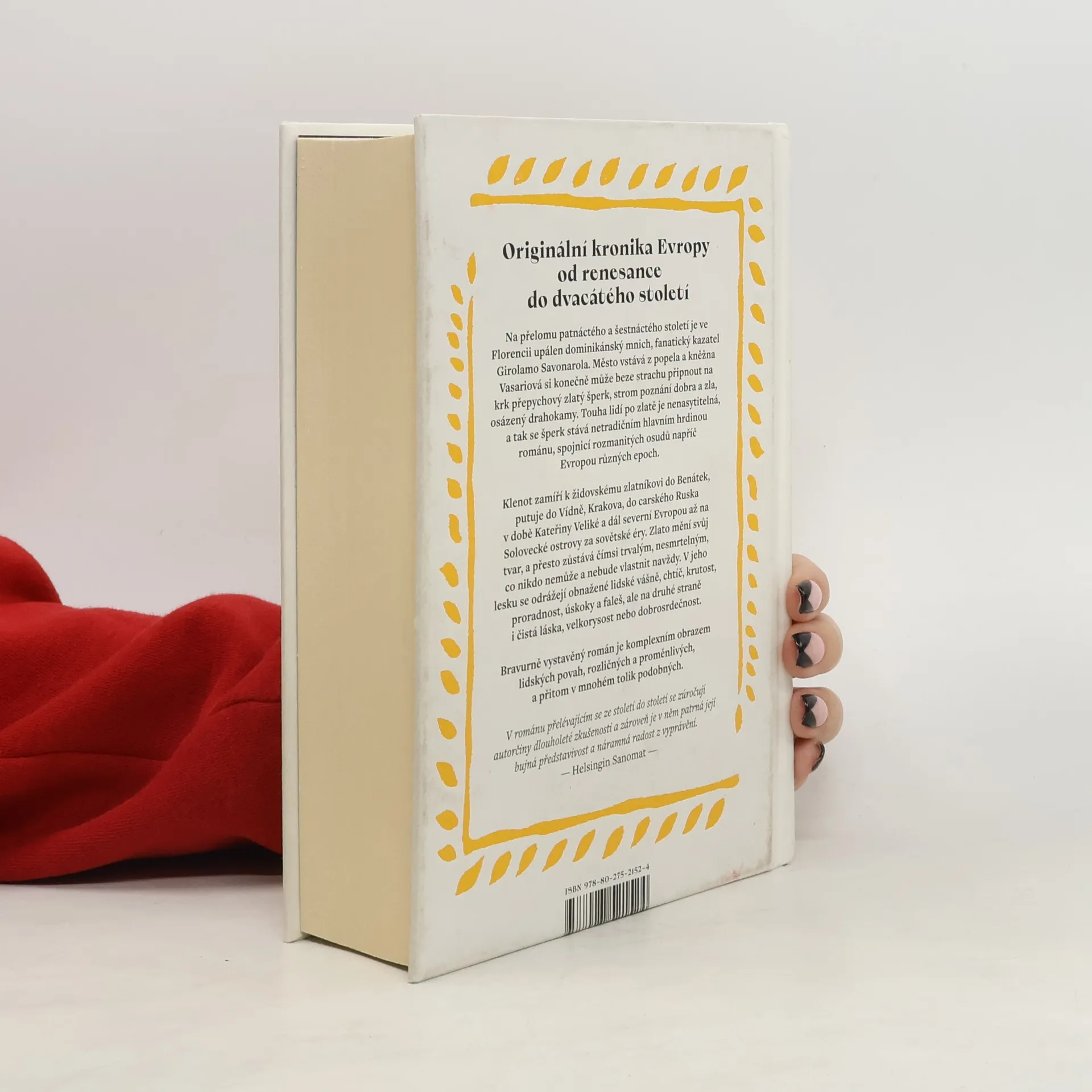 Originální historický román nás provází Evropou napříč staletími a hlavním hrdinou je zde šperk kněžny Vasariové. Na přelomu patnáctého a šestnáctého století je ve Florencii upálen dominikánský mnich Girolamo Savonarola. Město vstává z popela a kněžna Vasariová si konečně může beze strachu připnout na krk přepychový zlatý šperk osázený drahokamy. Touha lidí po zlatě je nenasytitelná, a tak se šperk stává netradičním hlavním hrdinou románu, spojnicí rozmanitých osudů napříč Evropou různých epoch. Klenot zamíří k židovskému zlatníkovi do Benátek, putuje do Vídně, Krakova, do carského Ruska v době Kateřiny Veliké a dál severní Evropou až na Solovecké ostrovy za sovětské éry. Zlato mění svůj tvar, a přesto zůstává čímsi trvalým, nesmrtelným. V jeho lesku se odrážejí obnažené lidské vášně, chtíč, krutost, proradnost, úskoky a faleš, ale na druhé straně i čistá láska, velkorysost nebo dobrosrdečnost. Nakladatelská anotace. Kráceno.