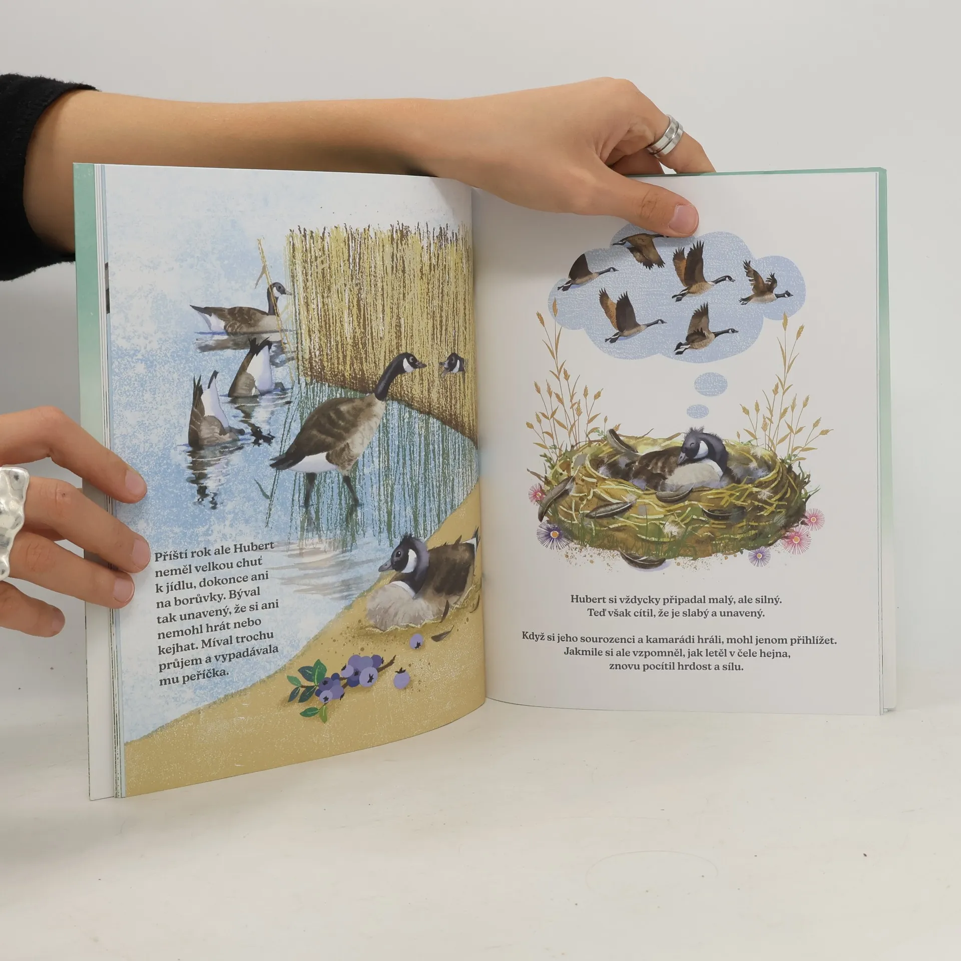 Mladý houser Hubert onemocní a uvědomí si, že už se nedokáže s ostatními vydat na podzimní tažení. Konejšivý příběh o vážné nemoci, ztrátě, lásce a síle paměti. Houser Hubert se každý rok vydával s ostatními z hejna na Velkou cestu. Jednou na podzim mu ale začnou vypadávat peříčka. Cítí, že slábne a přichází jeho konec. Aby ostatním něco zanechal, svoje vypadlá peříčka sbírá a do každého vdechne krásné prožitky, které si ze svého života pamatuje. Jimi pak podaruje svoji rodinu a přátele.