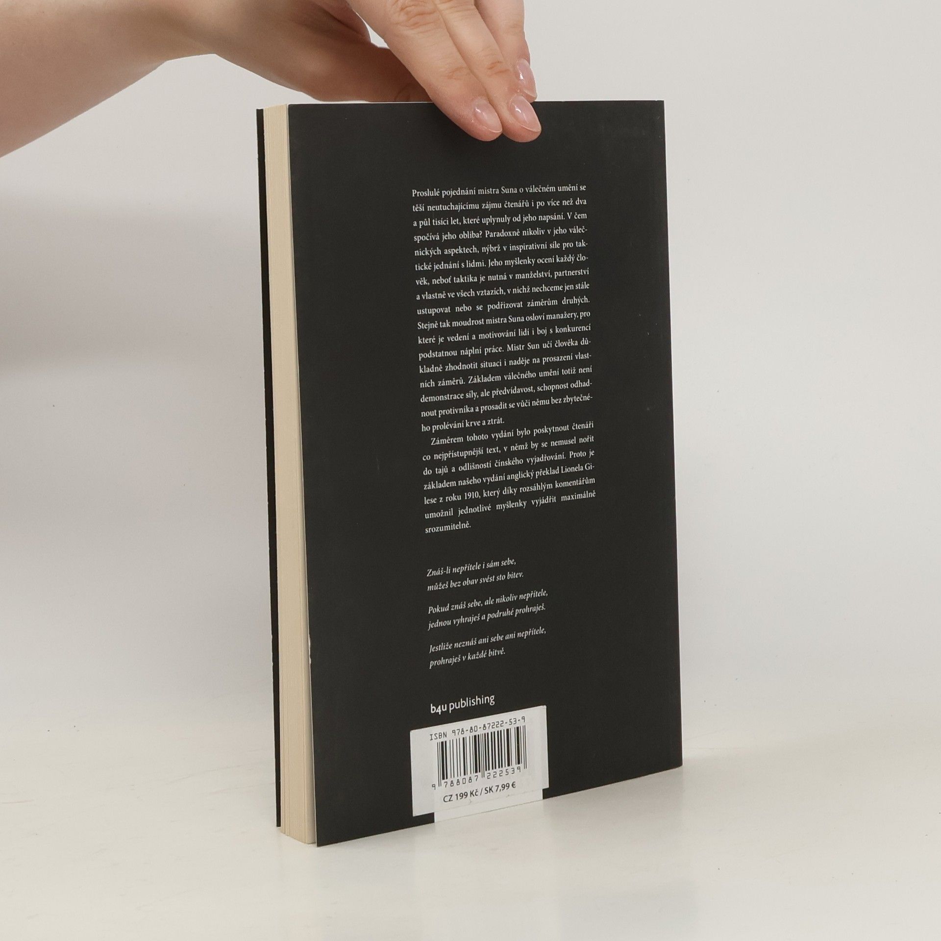 Proslulé pojednání mistra Suna o válečném umění se těší neutuchajícímu zájmu čtenářů i po více než dva a půl tisíci let, které uplynuly od jeho napsání. V čem spočívá jeho obliba? Paradoxně nikoliv v jeho válečnických aspektech, nýbrž v inspirativní síle pro taktické jednánís lidmi. Jeho myšlenky ocení každý člověk, neboť taktika je nutná v manželství, partnerství a vlastně ve všech vztazích, v nichž nechceme jen stále ustupovat nebo se podřizovat záměrům druhých. Stejně tak moudrost mistra Suna osloví manažery, pro které je vedení a motivování lidí i boj s konkurencí podstatnou náplní práce. Mistr Sun učí člověka důkladně zhodnotit situaci i naděje na prosazení vlastních záměrů. Základem válečného umění totiž není demonstrace síly, ale předvídavost, schopnost odhadnout protivníka a prosadit se vůči němu bez zbytečného prolévání krve a ztrát. Záměrem tohoto vydání bylo poskytnout čtenáři co nejpřístupnější text, v němž by se nemusel nořit do tajů a odlišností čínského vyjadřování. Proto je základem našeho vydání anglický překlad Lionela Gilese z roku 1910, který díky rozsáhlým komentářům umožnil jednotlivé myšlenky vyjádřit maximálně srozumitelně.