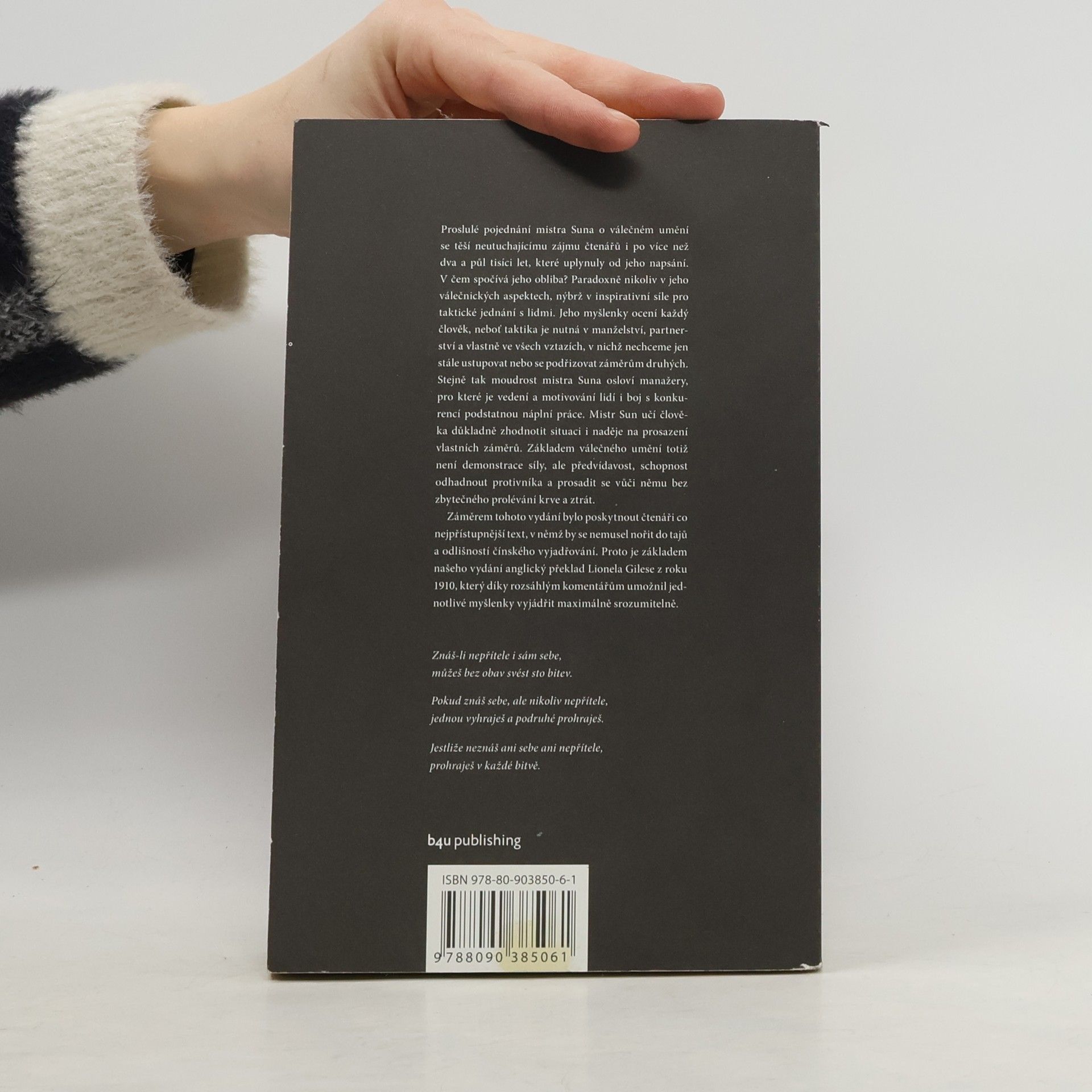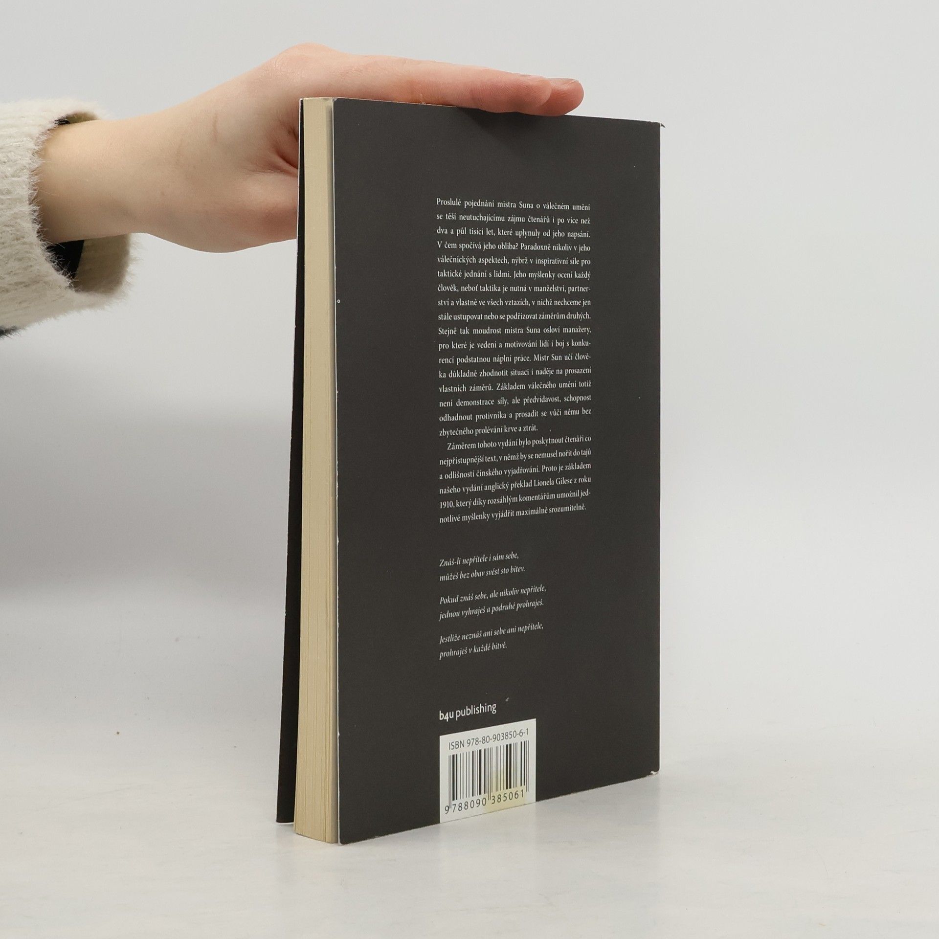 Proslulé pojednání mistra Suna o válečném umění se těší neutuchajícímu zájmu čtenářů i po více než dva a půl tisíci let, které uplynuly od jeho napsání. V čem spočívá jeho obliba? Paradoxně nikoliv v jeho válečnických aspektech, nýbrž v inspirativní síle pro taktické jednání s lidmi. Jeho myšlenky ocení každý člověk, neboť taktika je nutná v manželství, partnerství a vlastně ve všech vztazích, v nichž nechceme jen stále ustupovat nebo se podřizovat záměrům druhých. Stejně tak moudrost mistra Suna osloví manažery, pro které je vedení a motivování lidí i boj s konkurencí podstatnou náplní práce. Mistr Sun učí člověka důkladně zhodnotit situaci i naděje na prosazení vlastních záměrů. Základem válečného umění totiž není demonstrace síly, ale předvídavost, schopnost odhadnout protivníka a prosadit se vůči němu bez zbytečného prolévání krve a ztrát.