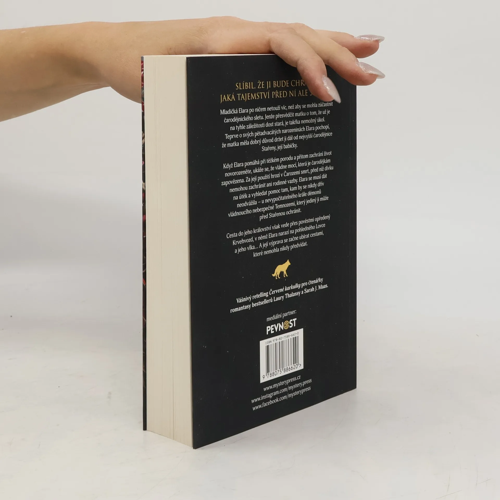 SLÍBIL, ŽE JI BUDE CHRÁNIT. JAKÁ TAJEMSTVÍ PŘED NÍ ALE SKRÝVÁ? Mladičká Elara po ničem netouží víc, než aby se mohla zúčastnit čarodějnického sletu. Jenže přesvědčit matku o tom, že už je na tyhle záležitosti dost stará, je takřka nemožný úkol. Teprve o svých pětadvacátýchnarozeninách Elara pochopí, že matka měla dobrý důvod držet ji dál od nejvyšší čarodějnice Stařeny, její babičky. Když Elara pomáhá při těžkém porodu a přitom zachrání život novorozeněte, ukáže se, že vládne mocí, která je čarodějkám zapovězena. Za její použití hrozí v Čarozemi smrt, před níž dívku nemohou zachránit ani rodinné vazby. Elara se musí dát na útěk a vyhledat pomoc tam, kam by se nikdy dřív neodvážila – u nevypočitatelného krále démonů vládnoucího nebezpečné Temnozemi, který jediný ji může před Stařenou ochránit. Cesta do jeho království však vede přes pověstmi opředený Krvehvozd, v němž Elara narazí na pohledného Lovce a jeho vlka… A její výprava se začne ubírat cestami, které nemohla nikdy předvídat.