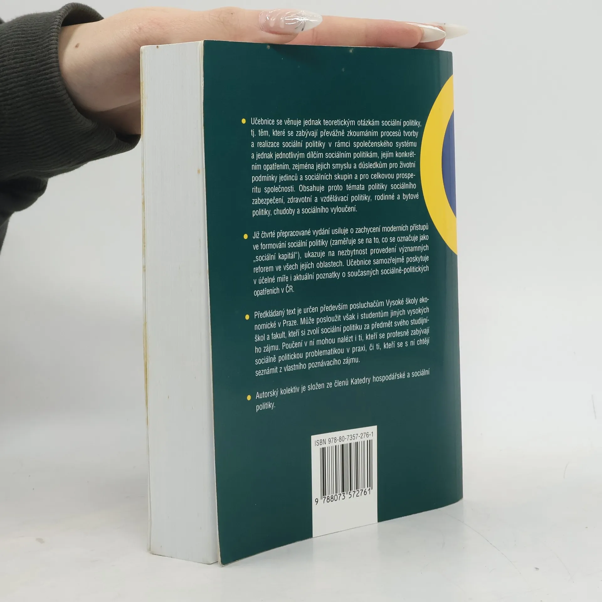Učebnice se věnuje jednak teoretickým otázkám sociální politiky,tj. těm, které se zabývají převážně zkoumáním procesů tvorby a realizace sociální politiky v rámci společenského systému, a jednak jednotlivým dílčím sociálním politikám, jejím konkrétním opatřením, zejména jejich smyslu a důsledkům pro životní podmínky jedinců a sociálních skupin a pro celkovou prosperitu společnosti. Obsahuje proto témata politiky sociálního zabezpečení, zdravotní a vzdálávací politiky, rodinné a bytové politiky, chudoby a sociálního vyloučení. Již páté vydání této úspěšné knihy usiluje o zachycení moderních přístupů ve formování sociální politiky (zaměřuje se na to, co se označuje jako sociální kapitál"), ukazuje na nezbytnost provedení významných reforem ve všech jejích oblastech. Učebnice samozřejmě poskytuje v účelné míře i aktuální poznatky o současných sociálněpolitických opatřeních v ČR.