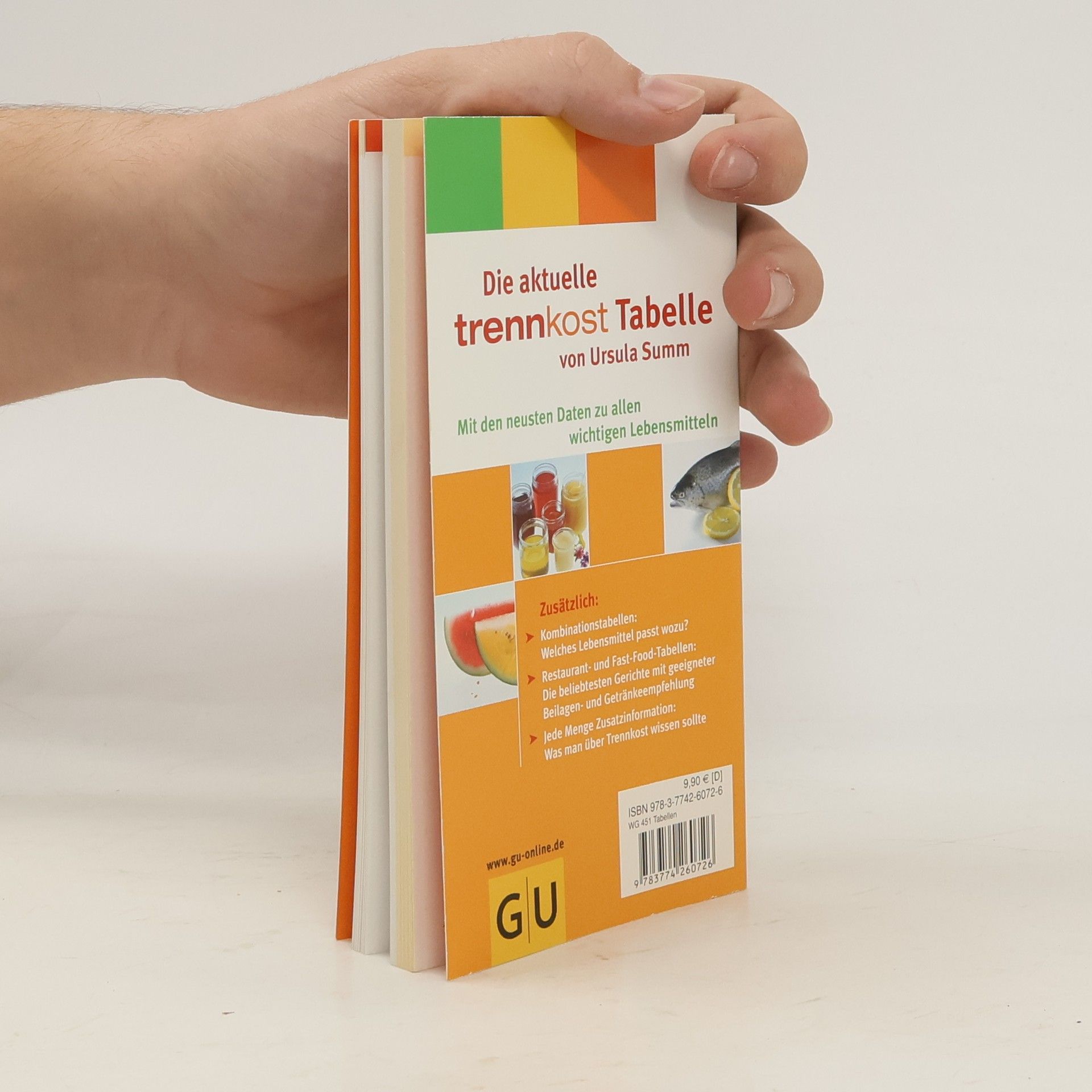 Mit ihrer neuen GU-Trennkost-Reihe stellt Erfolgsautorin Ursula Summ ihre erweiterte Trennkost vor. Die neue Trennkost-Tabelle bietet einen Überblick über die wichtigsten Lebensmittel auf aktuellstem Stand. Klar und übersichtlich durch die etablierten GU-Summ-Trennkost-Farben bietet die Tabelle eine schnelle Orientierung zu Hause, im Supermarkt und Unterwegs: Unterteilt nach einzelnen Lebensmittelgruppen, mit Angabe der Kalorien und Gruppenzugehörigkeit, mit Kombinationstabelle und Extra-Tabelle für typische Restaurant- und Fast-Food-Gerichte. In Verbindung mit dem Einführungstext und der Vorstellung eines idealen Trennkosttages finden so auch Trennkostanfänger die nötige Hilfe und einen leichten Einstieg.