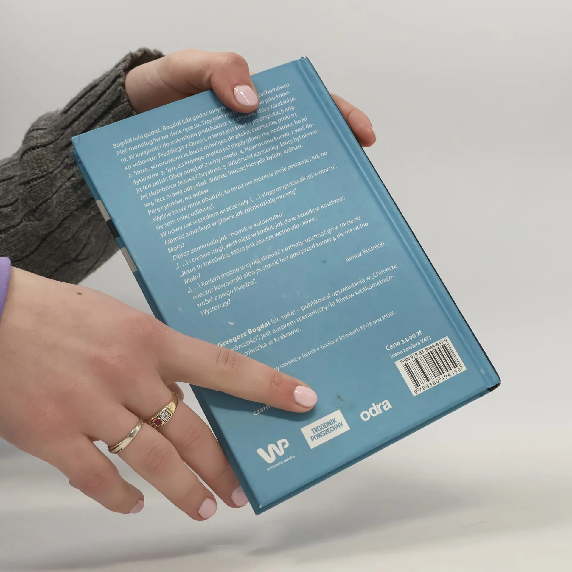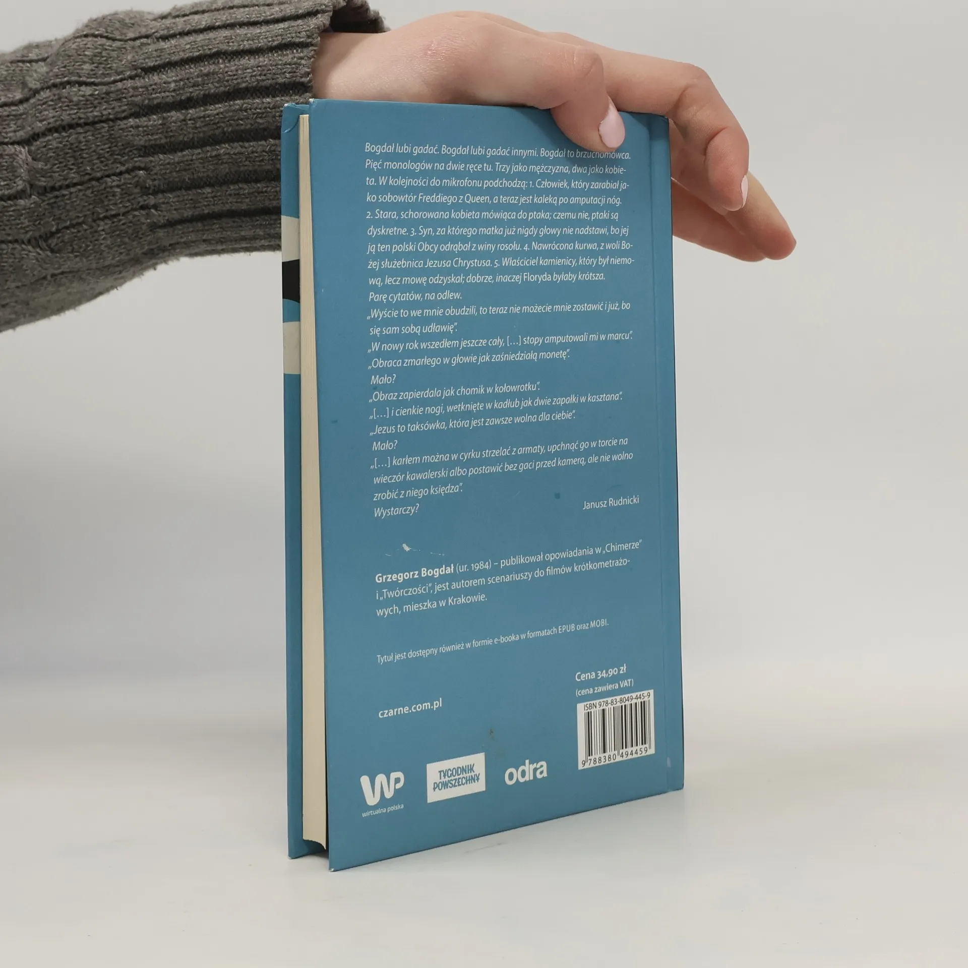 Bogdał lubi gadać. Bogdał lubi gadać innymi. Bogdał to brzuchomówca. Pięć monologów na dwie ręce tu. Trzy jako mężczyzna, dwa jako kobieta. W kolejności do mikrofonu podchodzą: 1. Człowiek, który zarabiał jako sobowtór Freddiego z Queen, a teraz jest kaleką po amputacji nóg. 2. Stara, schorowana kobieta mówiąca do ptaka; czemu nie, ptaki są dyskretne. 3. Syn, za którego matka już nigdy głowy nie nadstawi, bo jej ją ten polski Obcy odrąbał z winy rosołu. 4. Nawrócona kurwa, z woli Bożej służebnica Jezusa Chrystusa. 5. Właściciel kamienicy, który był niemową, lecz mowę odzyskał; dobrze, inaczej Floryda byłaby krótsza.Parę cytatów, na odlew.Wyście to we mnie obudzili, to teraz nie możecie mnie zostawić i już, bo się sam sobą udławię.W nowy rok wszedłem jeszcze cały, […]stopy amputowali mi w marcu.Obraca zmarłego w głowie jak zaśniedziałą monetę.Mało?Obraz zapierdala jak chomik w kołowrotku.[…] i cienkie nogi, wetknięte w kadłub jak dwie zapałki w kasztana.Jezus to taksówka, która jest zawsze wolna dla ciebie.Mało?[…] karłem można w cyrku strzelać z armaty, upchnąć go w torcie na wieczór kawalerski albo postawić bez gaci przed kamerą, ale nie wolno zrobić z niego księdza.Wystarczy?Janusz Rudnicki
