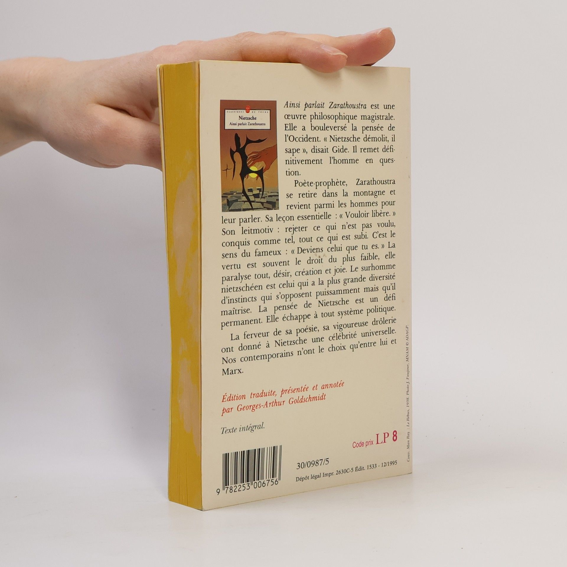 Ainsi parlait Zarathoustra est une œuvre philosophique magistrale. Elle a bouleversé la pensée de l'Occident. " Nietzsche démolit, il sape ", disait Gide. Il remet définitivement l'homme en question. Poète-prophète, Zarathoustra se retire dans la montagne et revient parmi les hommes pour leur parler. Sa leçon essentielle : " Vouloir libère " Son leitmotiv : rejeter ce qui n'est pas voulu, conquis comme tel, tout ce qui est subi. C'est le sens du fameux : " Deviens celui que tu es. " La vertu est souvent le droit du plus faible, elle paralyse tout, désir, création et joie. Le surhomme nietzschéen est celui qui a la plus grande diversité d'instincts qui s'opposent puissamment mais qu'il maîtrise. La pensée de Nietzsche est un défi permanent. Elle échappe à tout système politique. La ferveur de sa poésie, sa vigoureuse drôlerie ont donné à Nietzsche une célébrité universelle. Nos contemporains n'ont le choix qu'entre lui et Marx.