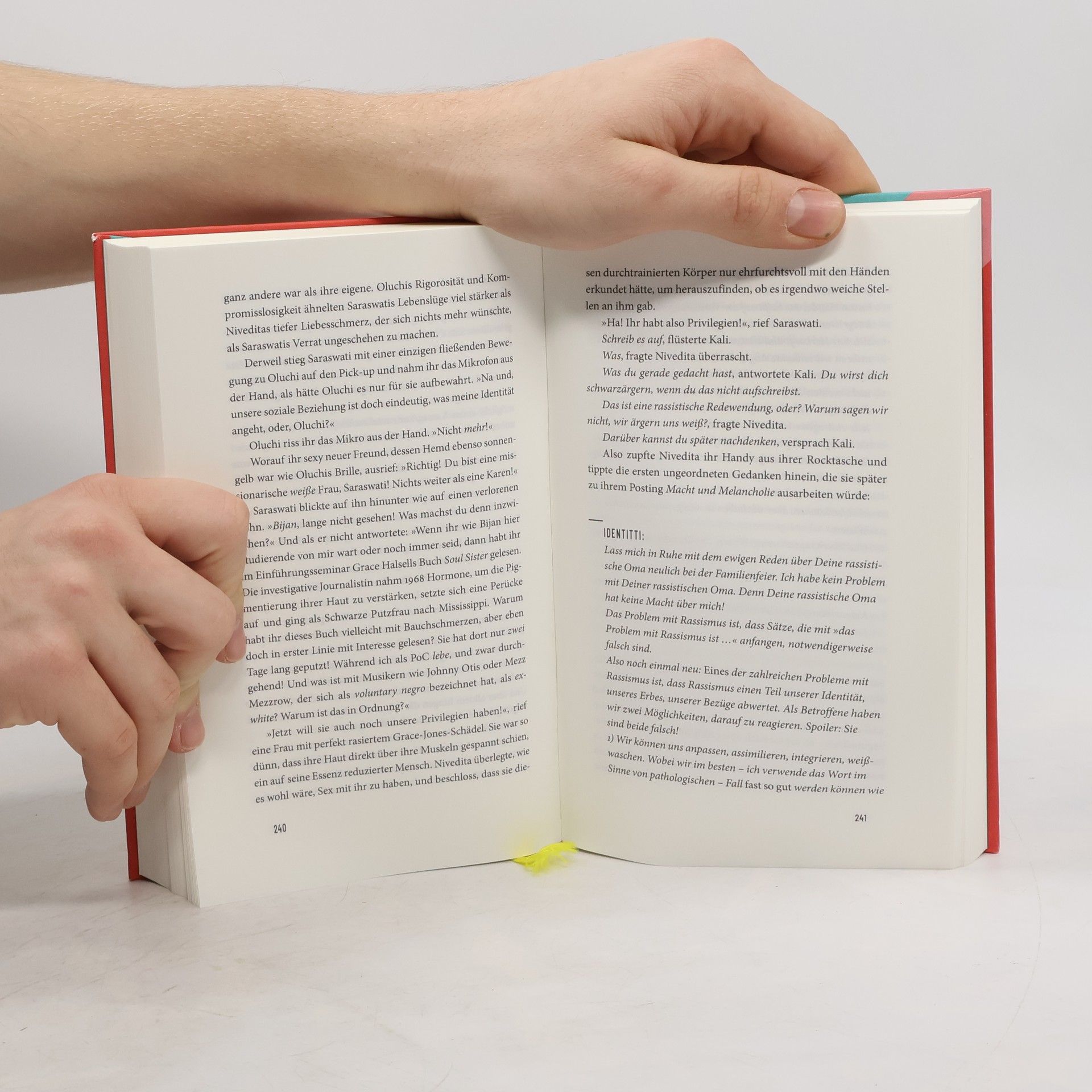 Was für ein Skandal: Prof. Dr. Saraswati ist WEISS! Schlimmer geht es nicht. Denn die Professorin für Postcolonial Studies in Düsseldorf war eben noch die Übergöttin aller Debatten über Identität – und beschrieb sich als Person of Colour. Als würden Sally Rooney, Beyoncé und Frantz Fanon zusammen Sex Education gucken, beginnt damit eine Jagd nach „echter“ Zugehörigkeit. Während das Netz Saraswati hetzt und Demos ihre Entlassung fordern, stellt ihre Studentin Nivedita ihr intimste Fragen. Mithu Sanyal schreibt mit beglückender Selbstironie und befreiendem Wissen. Den Schleudergang dieses Romans verlässt niemand, wie er*sie ihn betrat.