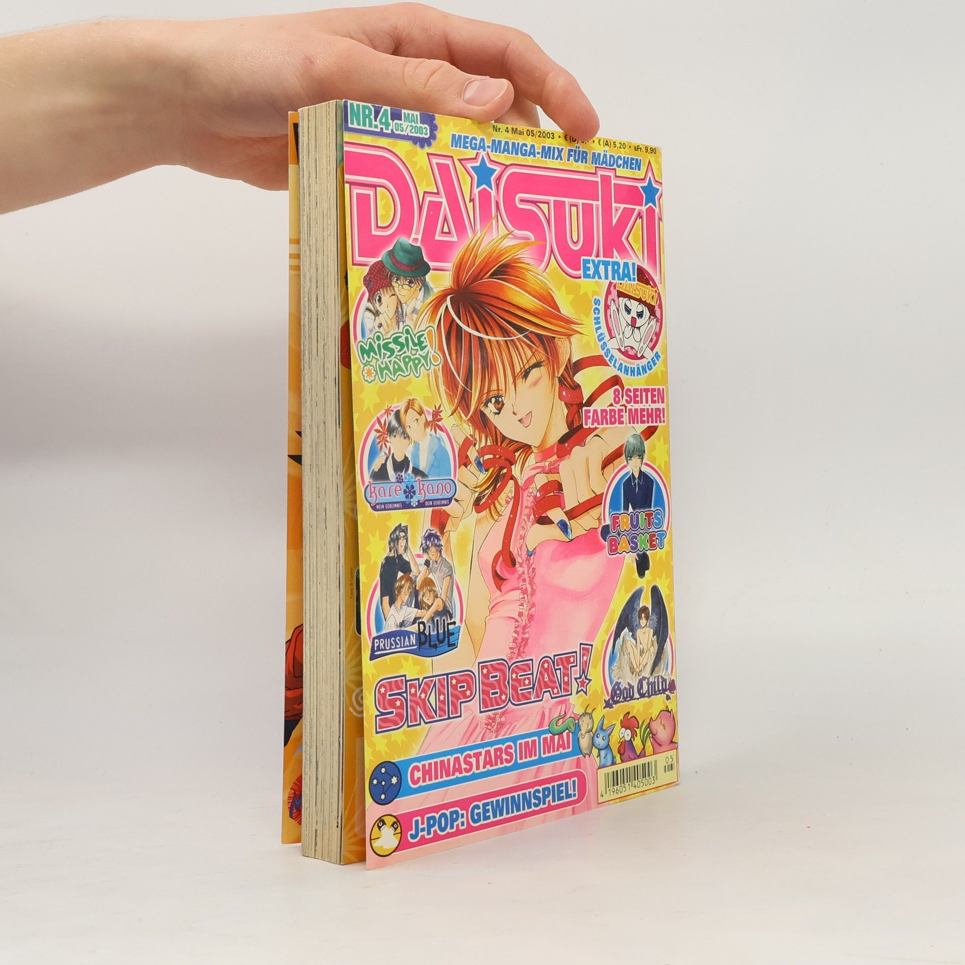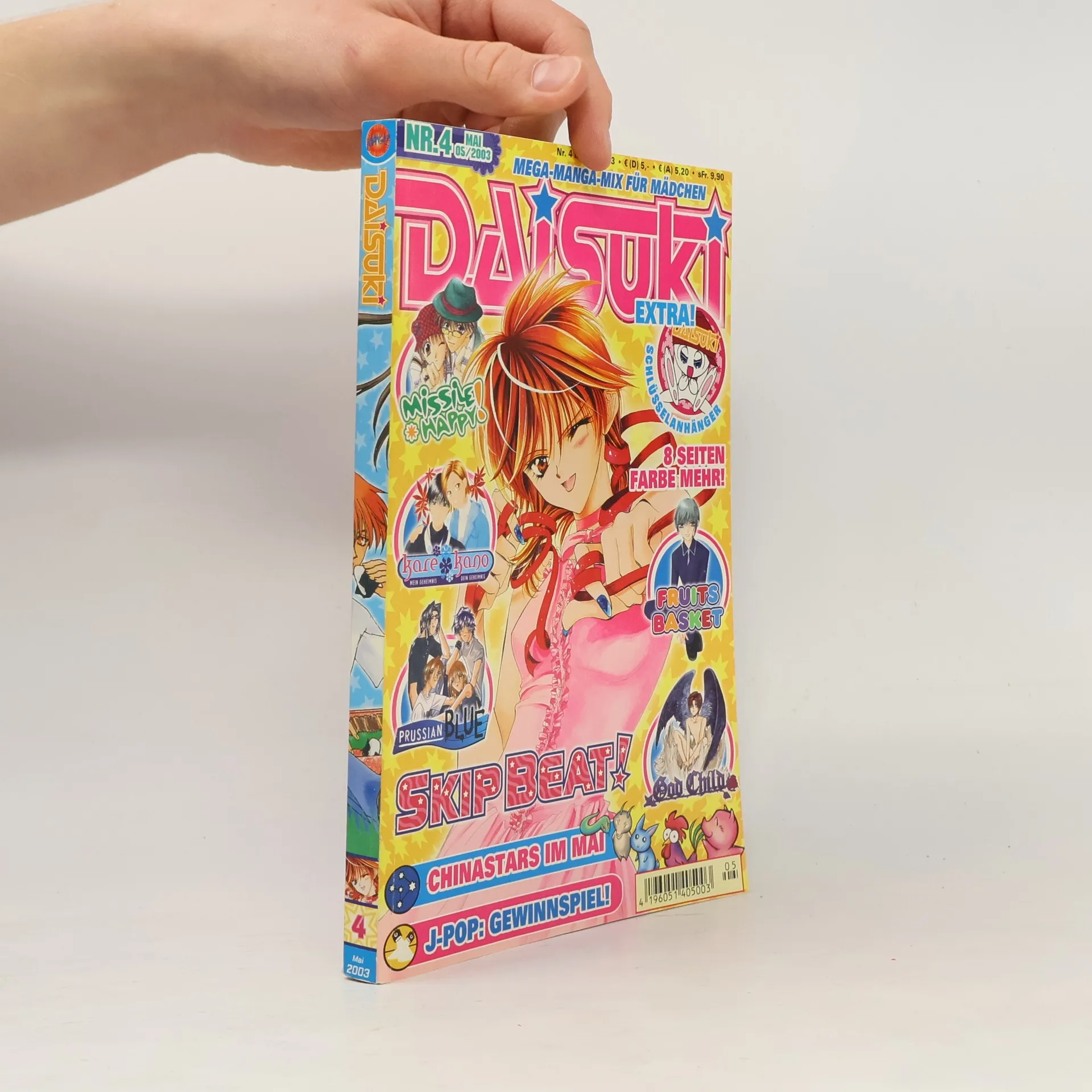 Wooow! Ein weiteres DAISUKI ist da! Und diesmal bekommt ihr's ganz dicke. Es gibt einen klasse Schlüsselanhänger von unserem süßen Maskottchen! Und obendrauf hält Heft 4 noch 8 fette Farbseiten extra für euch bereit. Natürlich ist das noch lange nicht alles: Wie gewohnt erlebt ihr mit "Fruits Basket", "Skip Beat!", "Kare Kano", "Prussian Blue", "Missile Happy!" und "God Child" spannende Abenteuer. Außerdem könnt ihr bei tollen Gewinnspielen wieder ordentlich Preise absahnen, z. B. "X" DVDs. Das Neueste aus Tokyo berichtet euch unsere Reporterin Hitomi, die "China Stars" gestatten euch einen Blick in den Zukunftshimmel, und, und, und ...