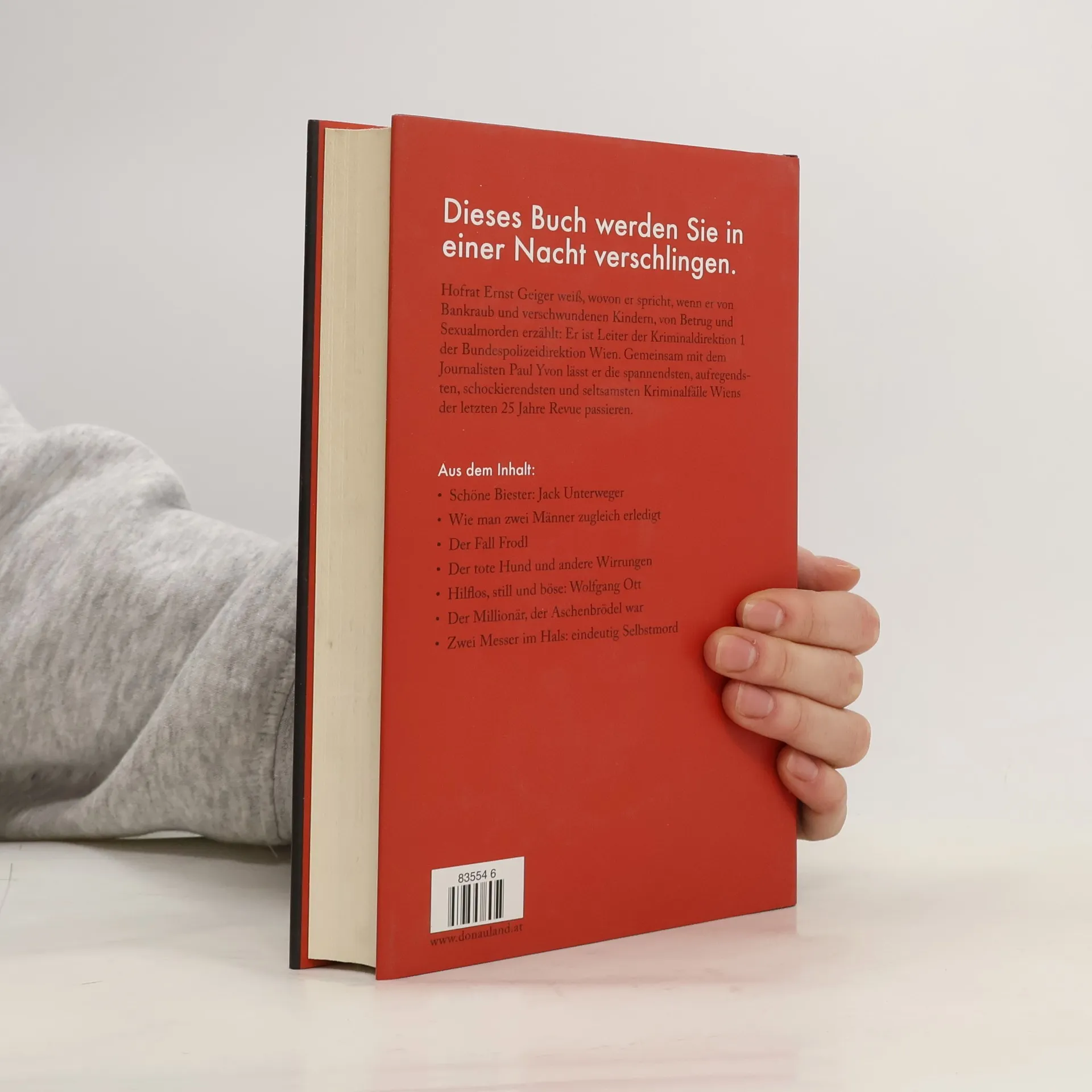 Das Buch werden Sie in einer Nacht verschlingen. Gemeinsam mit dem Journalisten Paul Yvon lässt Hofrat Ernst Geiger, Leiter der Kriminaldirektion 1 der Bundespolizeidirektion Wien, die spannendsten, schockierendsten und seltsamsten Kriminalfälle Wiens der letzten 25 Jahre Revue passieren. Die Autoren schildern mit einem Augenzwinkern, warum es besser ist, keine gestohlenen Autos zu stehlen, erklären, wie es dazu kam, dass es im Gasthaus „Zur Wiener Gemütlichkeit“ eines Tages höchst ungemütlich wurde, als Sieglinde V. ihre Rivalin Steffi erschoss, und erinnern sich an Mörder-Groupies, die ihren gefährlichen Angebeteten überallhin folgen. Eine scharfsinnige, subjektiv gewichtete, anekdotische, bisweilen witzige Analyse der dunklen Seite der Gesellschaft.