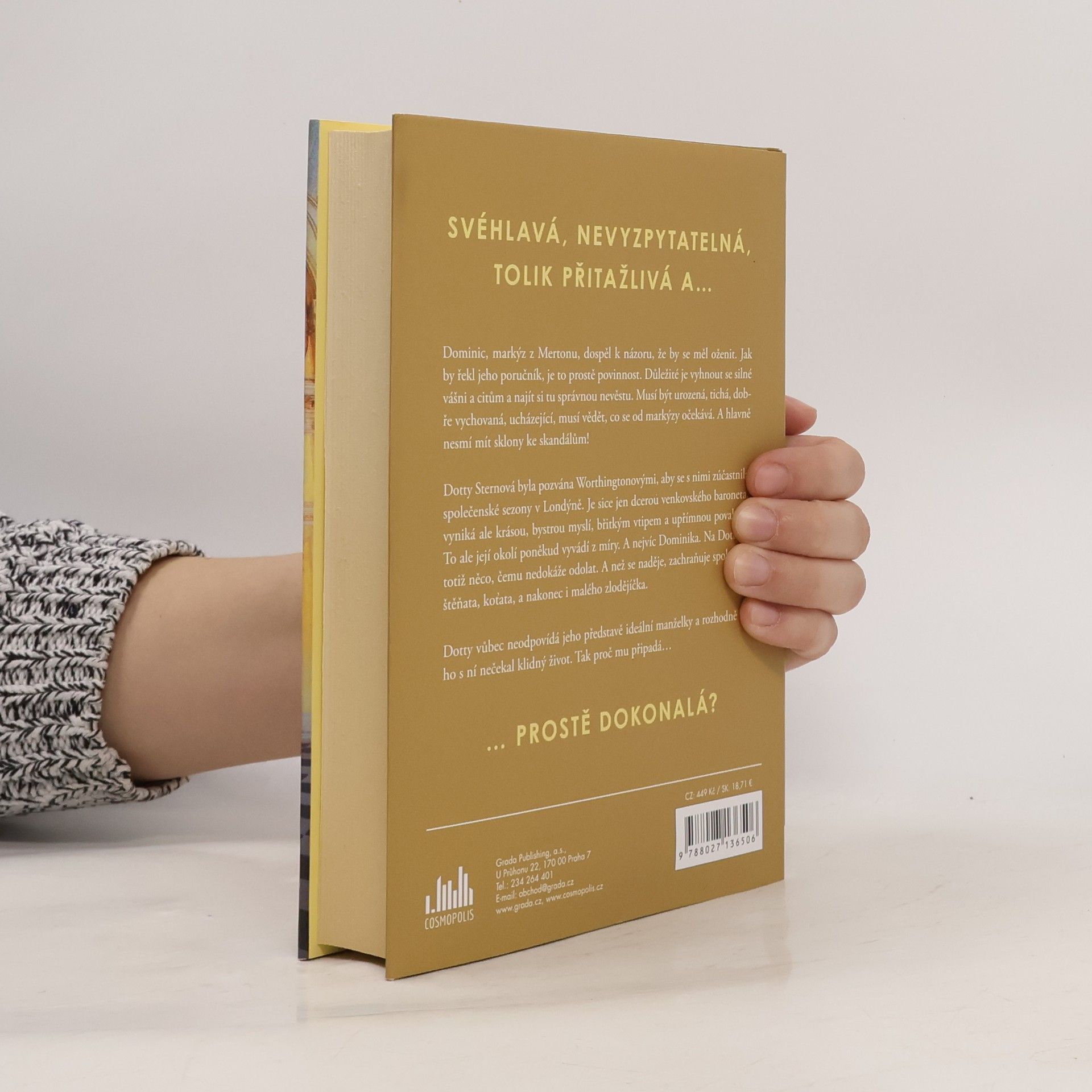 Dominic, markýz z Mertonu, dospěl k názoru, že by se měl oženit. Jak by řekl jeho poručník, je to prostě povinnost. Důležité je vyhnout se silné vášni a citům a najít si tu správnou nevěstu. Musí být urozená, tichá, dobře vychovaná, ucházející, musí vědět, co se od markýzy očekává. A hlavně nesmí mít sklony ke skandálům!Dotty Sternová byla pozvána Worthingtonovými, aby se s nimi zúčastnila společenské sezony v Londýně. Je sice jen dcerou venkovského baroneta, vyniká ale krásou, bystrou myslí, břitkým vtipem a upřímnou povahou. To ale její okolí poněkud vyvádí z míry. A nejvíc Dominika. Na Dotty je totiž něco, čemu nedokáže odolat. A než se naděje, zachraňuje spolu s ní štěňata, koťata, a nakonec i malého zlodějíčka.Dotty vůbec neodpovídá jeho představě ideální manželky a rozhodně by ho s ní nečekal klidný život. Tak proč mu připadá… prostě dokonalá?