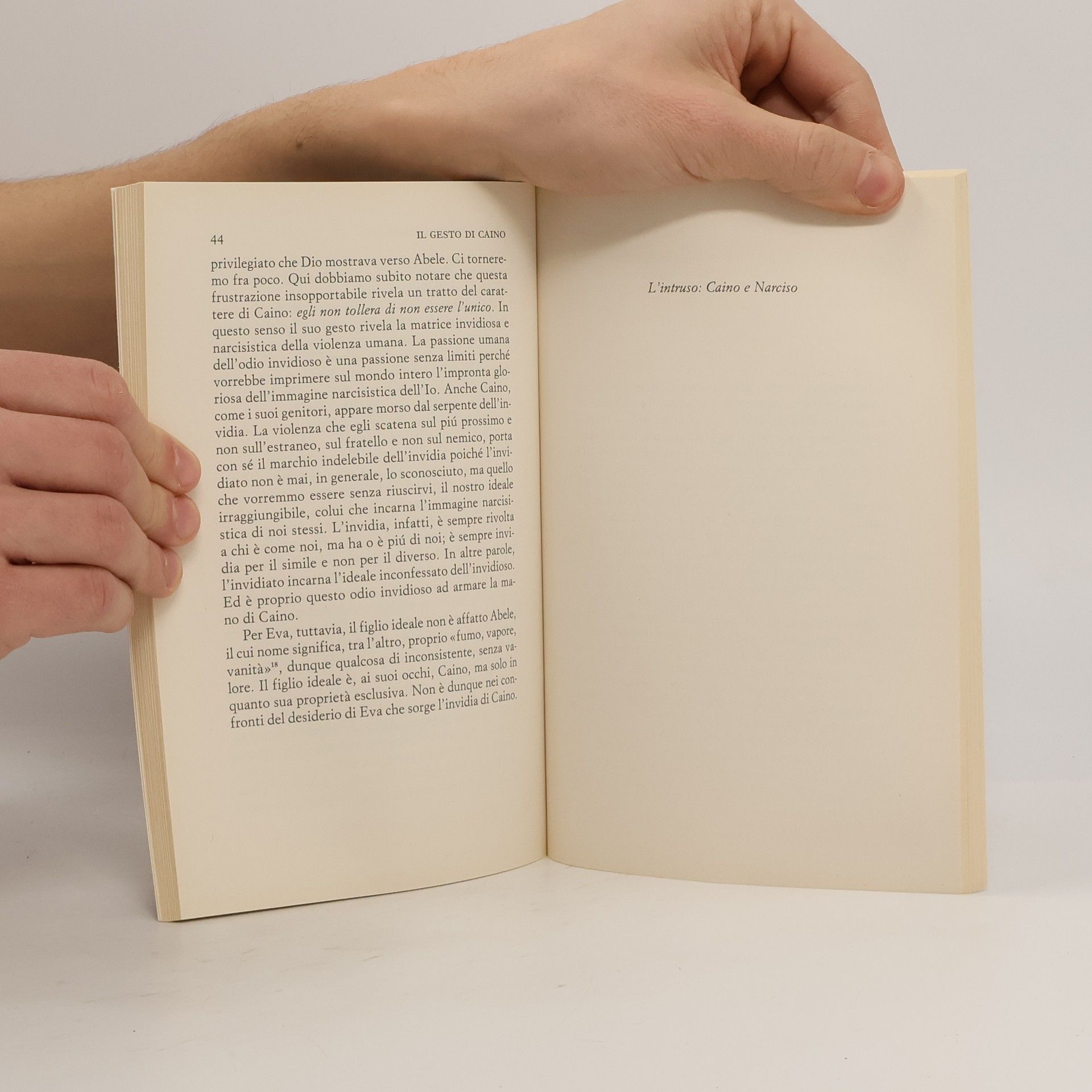 Il gesto di Caino è senza pietà: uccide il fratello spargendo il suo sangue sulla terra. Non lascia speranza, non consente il dialogo, non ritarda la violenza efferata dell'odio. È da questo gesto che la storia dell'uomo ha inizio. Sappiamo che l'amore per il prossimo è l'ultima parola e la più fondamentale a cui approda il logos biblico. Ma non è stata la sua prima parola. Essa viene dopo il gesto di Caino. Potremmo pensare che l'amore per il prossimo sia una risposta a questo gesto tremendo? Potremmo pensare che l'amore per il prossimo si possa raggiungere solo passando necessariamente attraverso il gesto distruttivo di Caino? Quello che è certo è che nella narrazione biblica l'amore per il prossimo viene dopo l'esperienza originaria dell'odio
